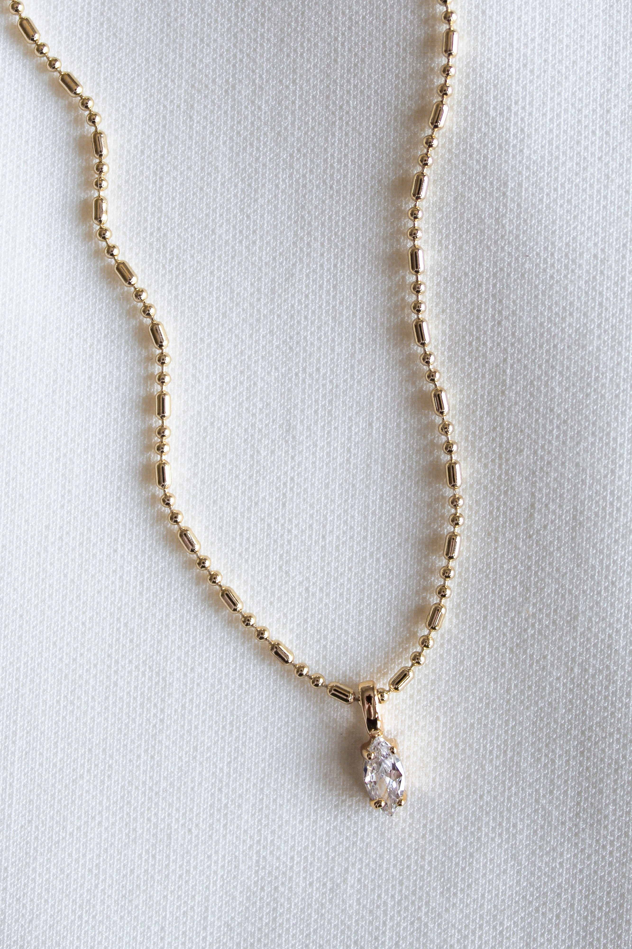 The Grace Drop Necklace features a charming CZ marquise stone delicately hanging from a stylish pill chain. Its gleaming gold finish adds a touch of sparkle and warmth to any outfit. Perfect for layering or wearing solo, this playful piece effortlessly elevates your everyday look with just the right amount of shine.