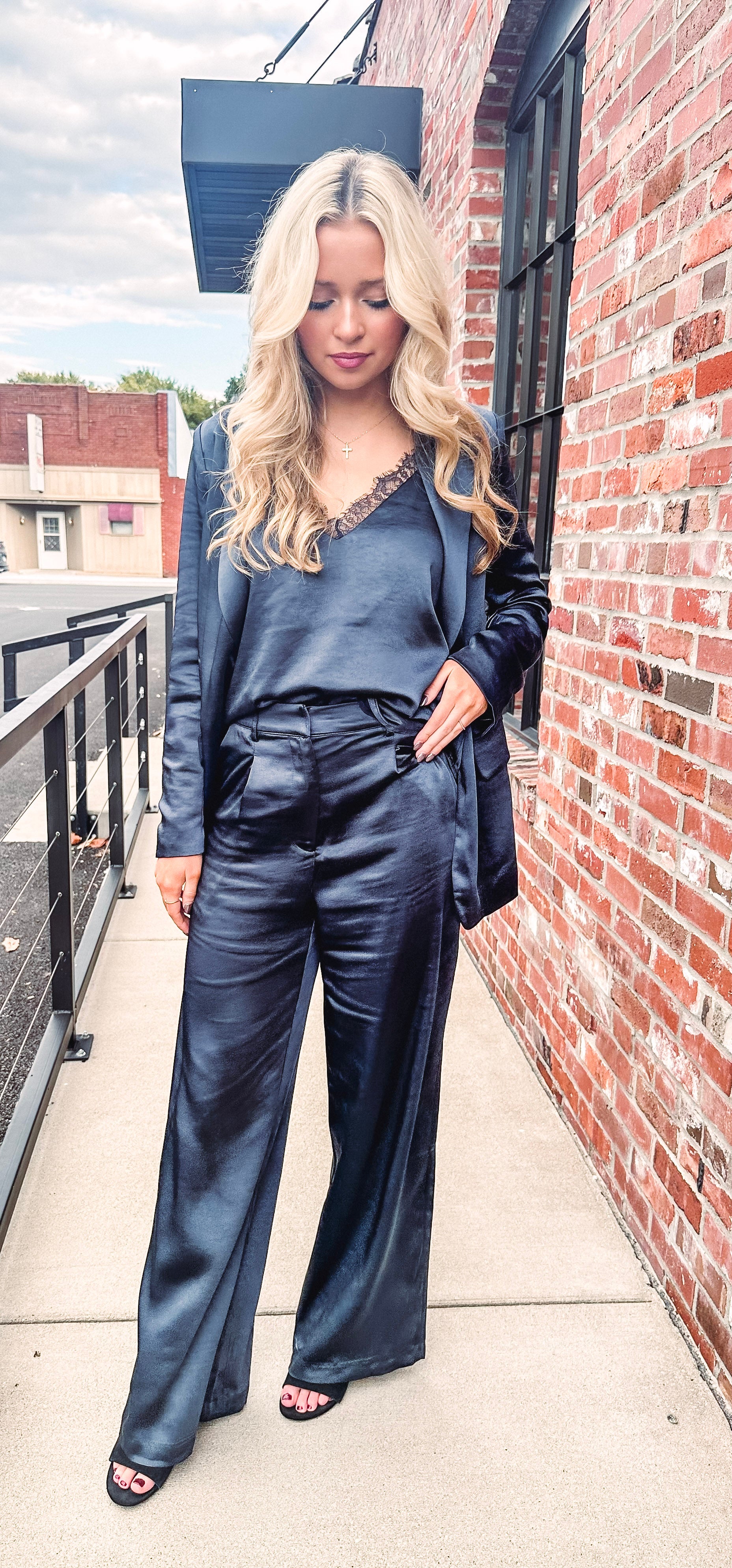 Get ready to float on cloud nine with the Alessia Satin Trousers! These navy satin pants bring together effortless style and cozy comfort with their relaxed fit, wide legs, and handy pockets. Whether you're jet-setting this spring or just embracing minimalist vibes, these sleek, solid-colored beauties will have you feeling fabulous wherever you go. Slip into satin and let your style shine!