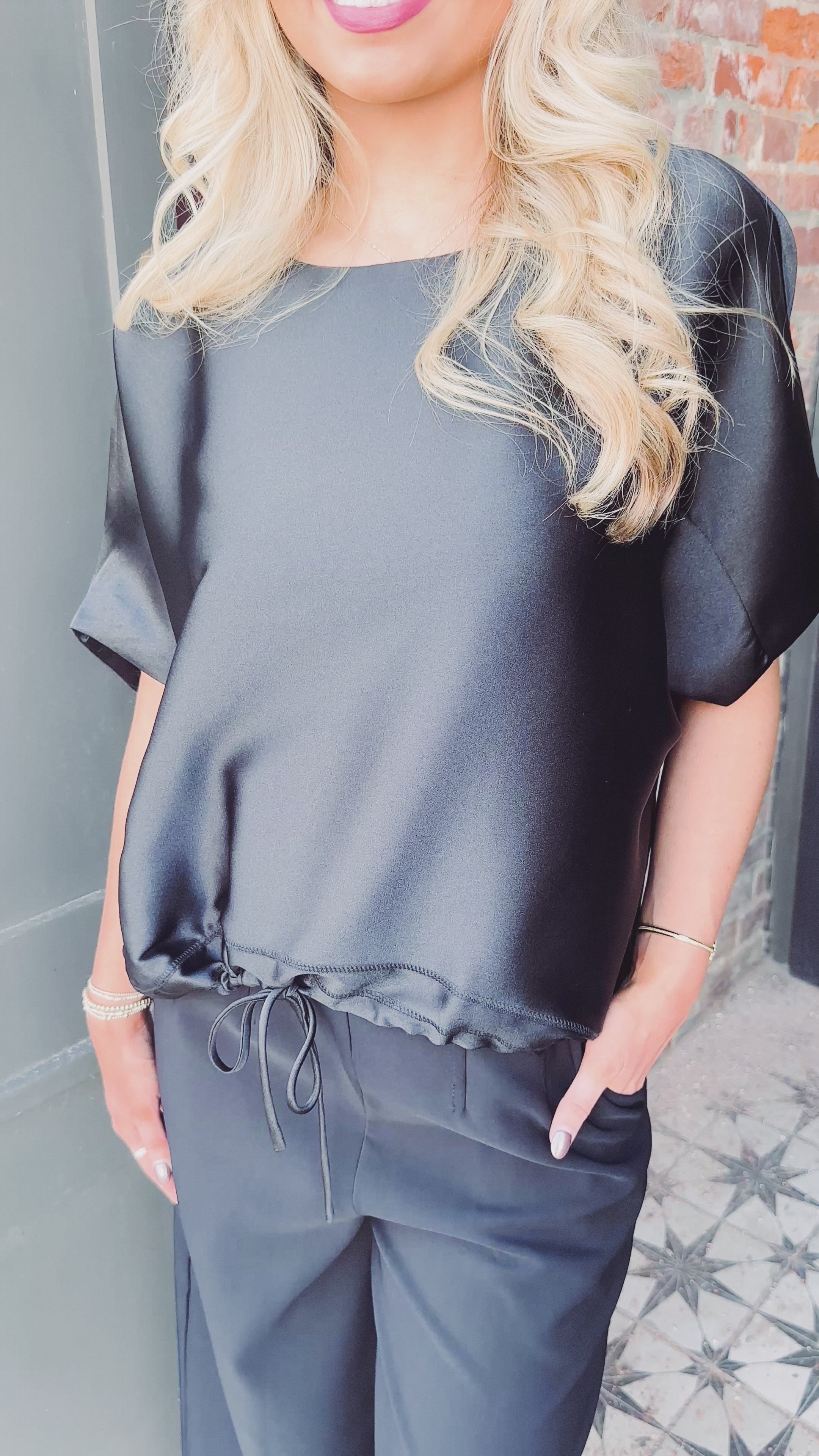 Step into effortless style with the Florence Lux Tie Waist Top. This black, satin-feel gem features a flattering tie waist and short sleeves, making it perfect to dress up for a night out or down for a casual day. Its silky touch adds a hint of luxury to any look, while the playful waist tie keeps things fun and flirty. Whether paired with jeans or a skirt, this top is ready to elevate your wardrobe with a touch of chic versatility.