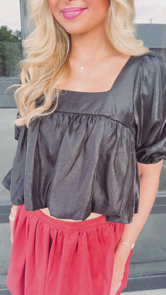 The Lydia Square Neck Bubble Crop Top in sleek black satin adds a playful touch to your party night wardrobe. Featuring a trendy square neckline and flirtatious puff sleeves, this top pairs effortlessly with skirts, jeans, or tailored pants for endless chic styling options. Perfect for making a statement while keeping it fun and fashionable.
