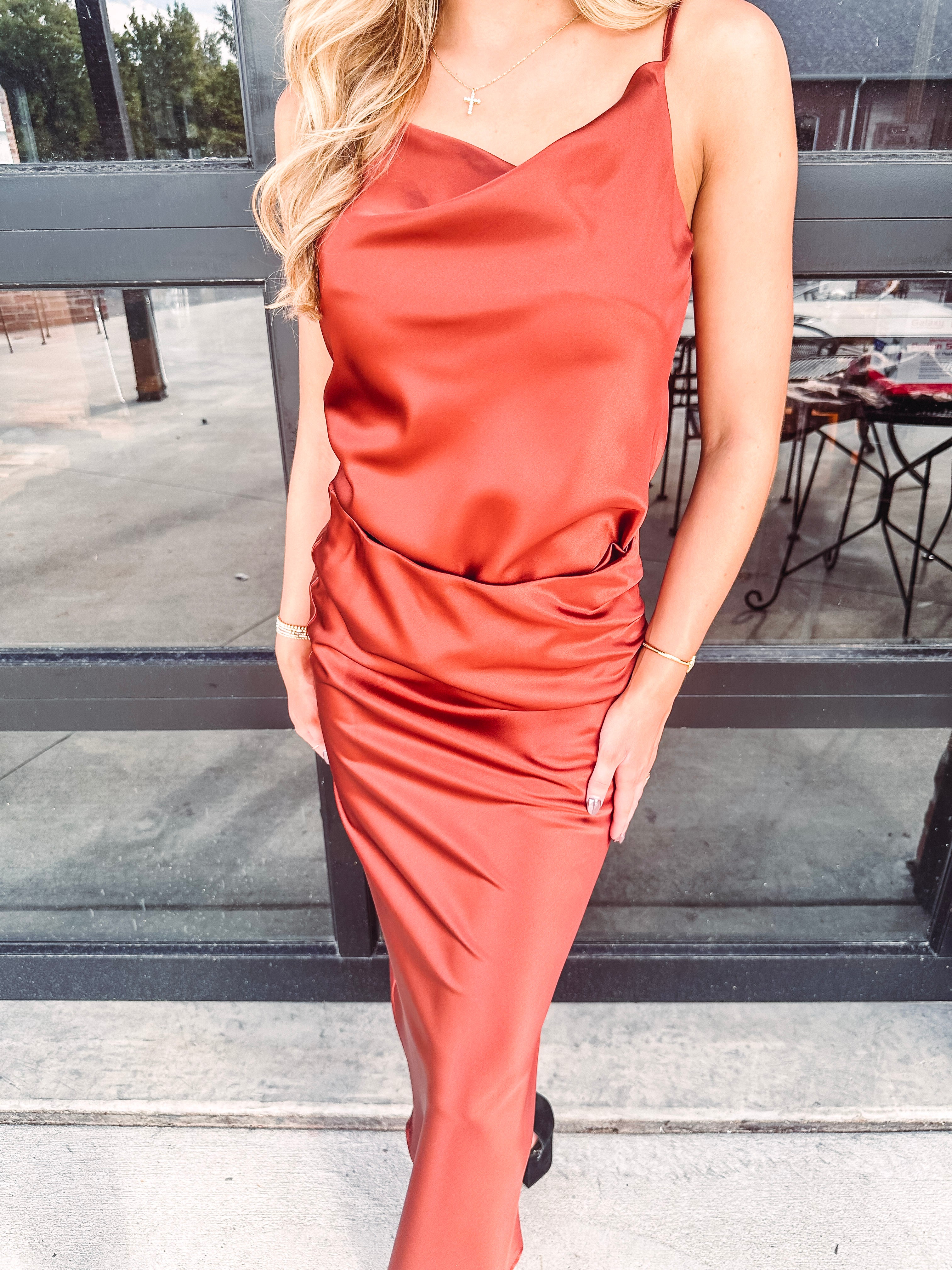 Enjoy a playful twist on elegance with the Vivienne Satin Cowl Neck Camisole. Featuring delicate thin straps and a chic cowl neckline, this sienna-colored top offers a soft satin touch that feels as luxurious as it looks. Perfect for adding a glamorous sparkle to any outfit, it’s your new go-to for effortless style with a flirty edge.