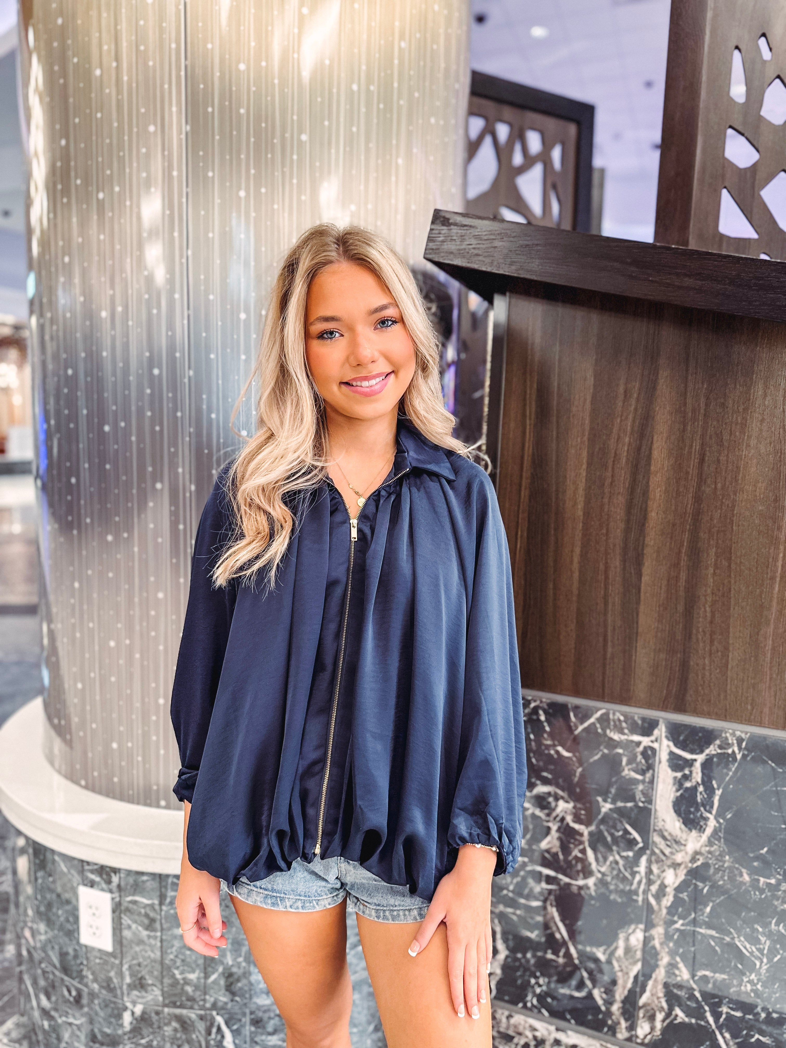 Slip into elegance with the Midnight Fancy Puffed Bomber Jacket, crafted from smooth navy satin that catches the light just right. This playful hybrid combines the sharpness of a shirt with the bold charm of a jacket, featuring flowy fabric and puffed sleeves that add a fun, dramatic flair. Zip it up for an effortlessly chic look that’s perfect for turning heads wherever you go.