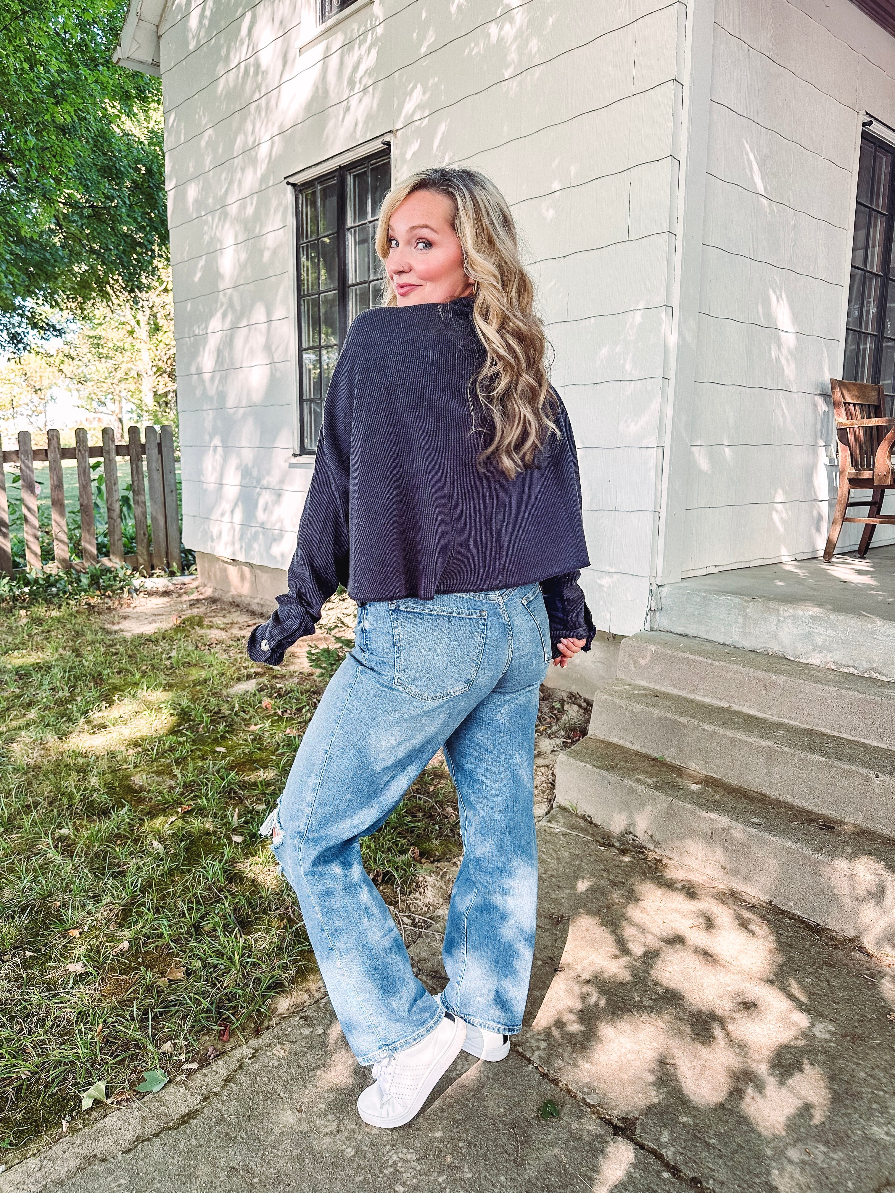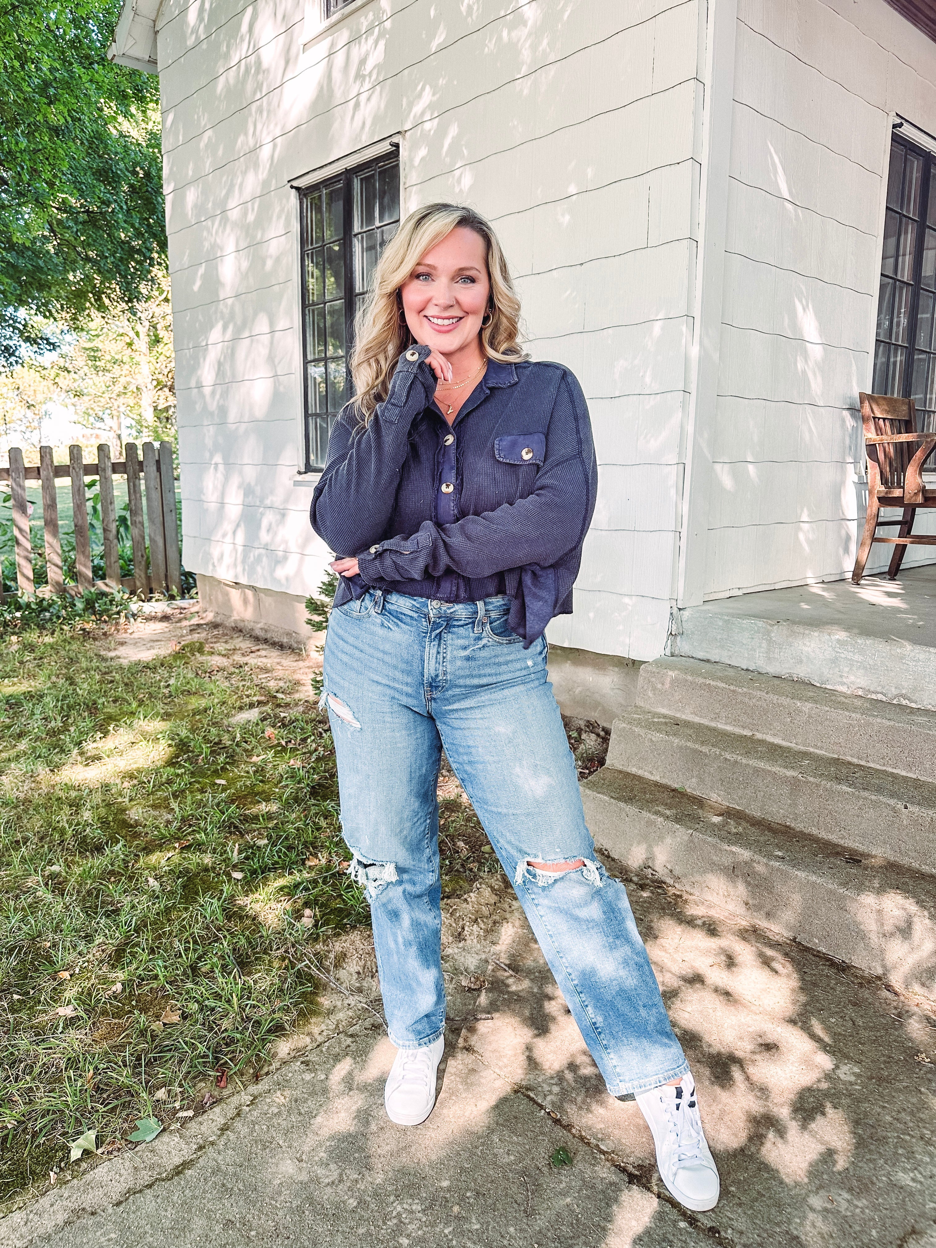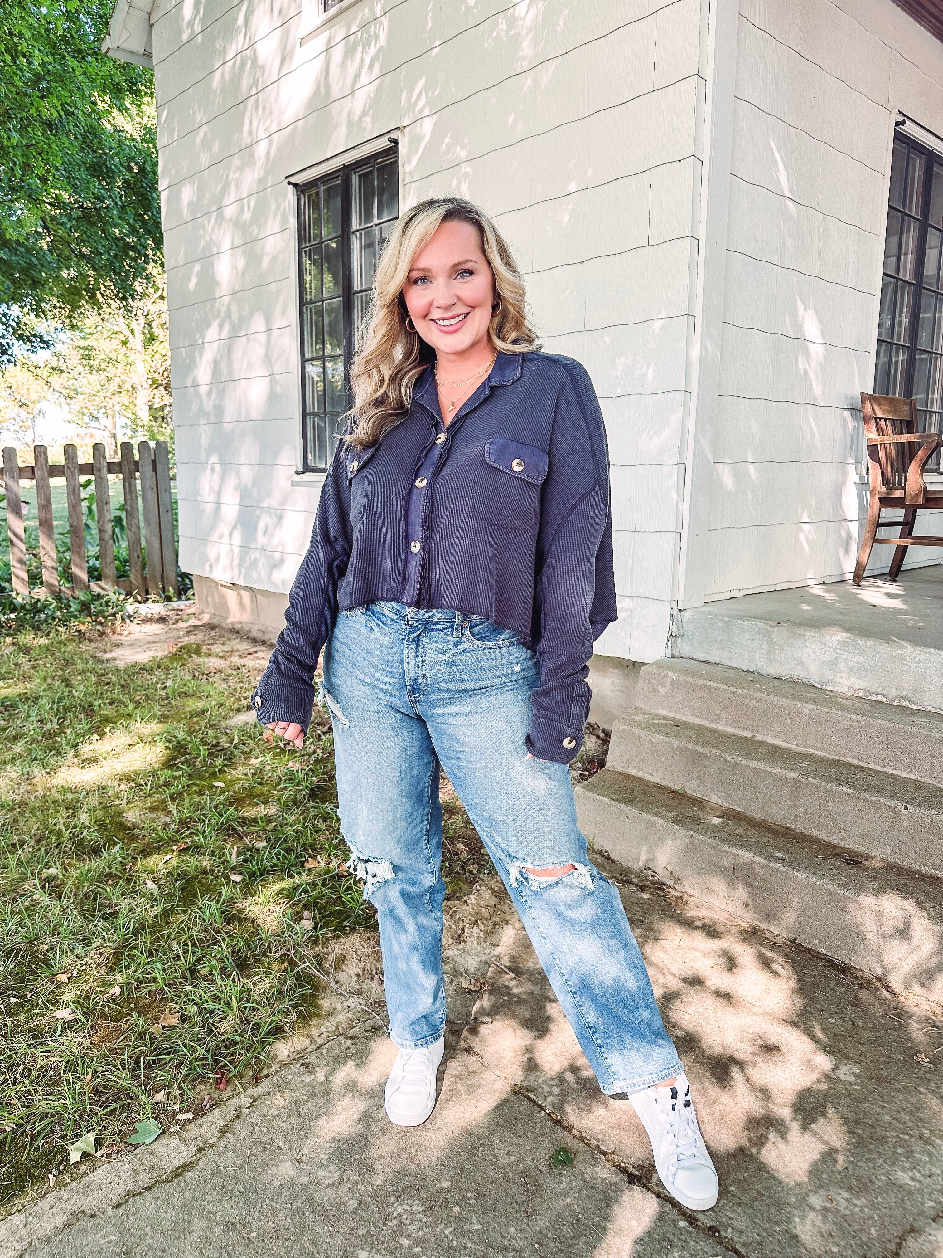 Embrace laid-back vibes with this Summer's End Thermal Cropped Button Front Shirt. Featuring a cool washed navy color and a textured thermal fabric, it offers a cozy, worn-in look that’s perfect for those breezy evenings. The cropped fit and button-front design add a fun, flirty touch to your casual wardrobe.
