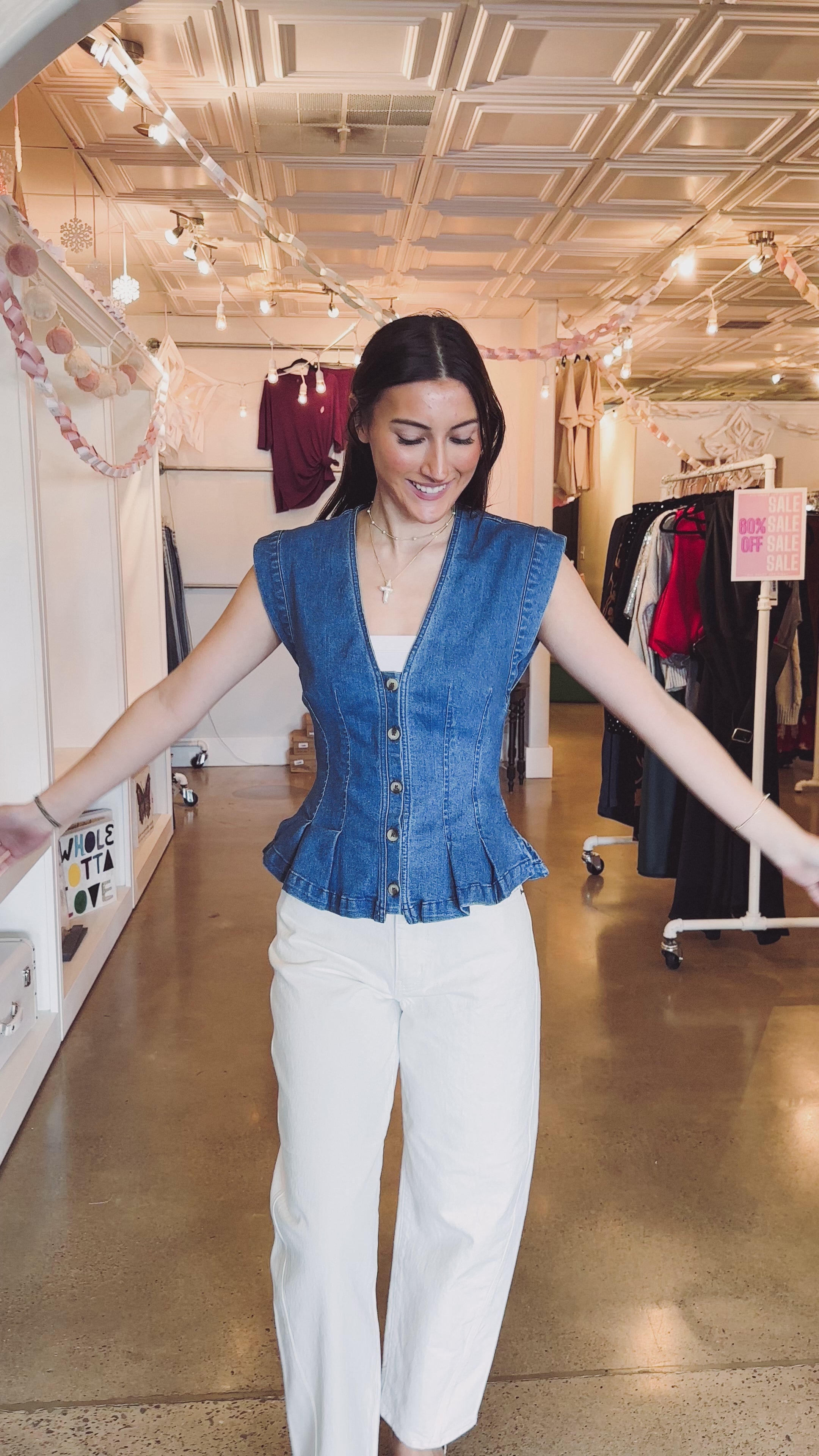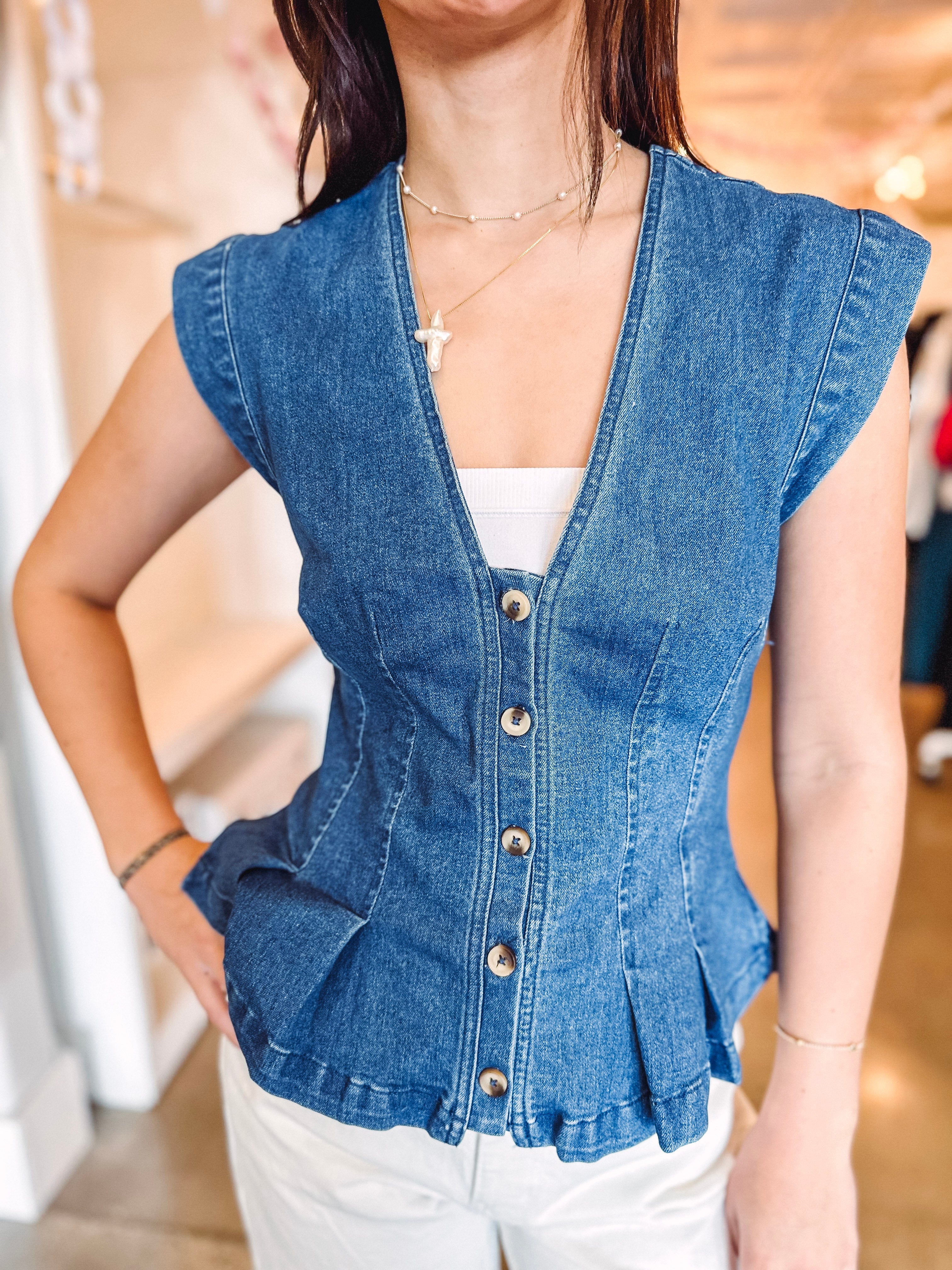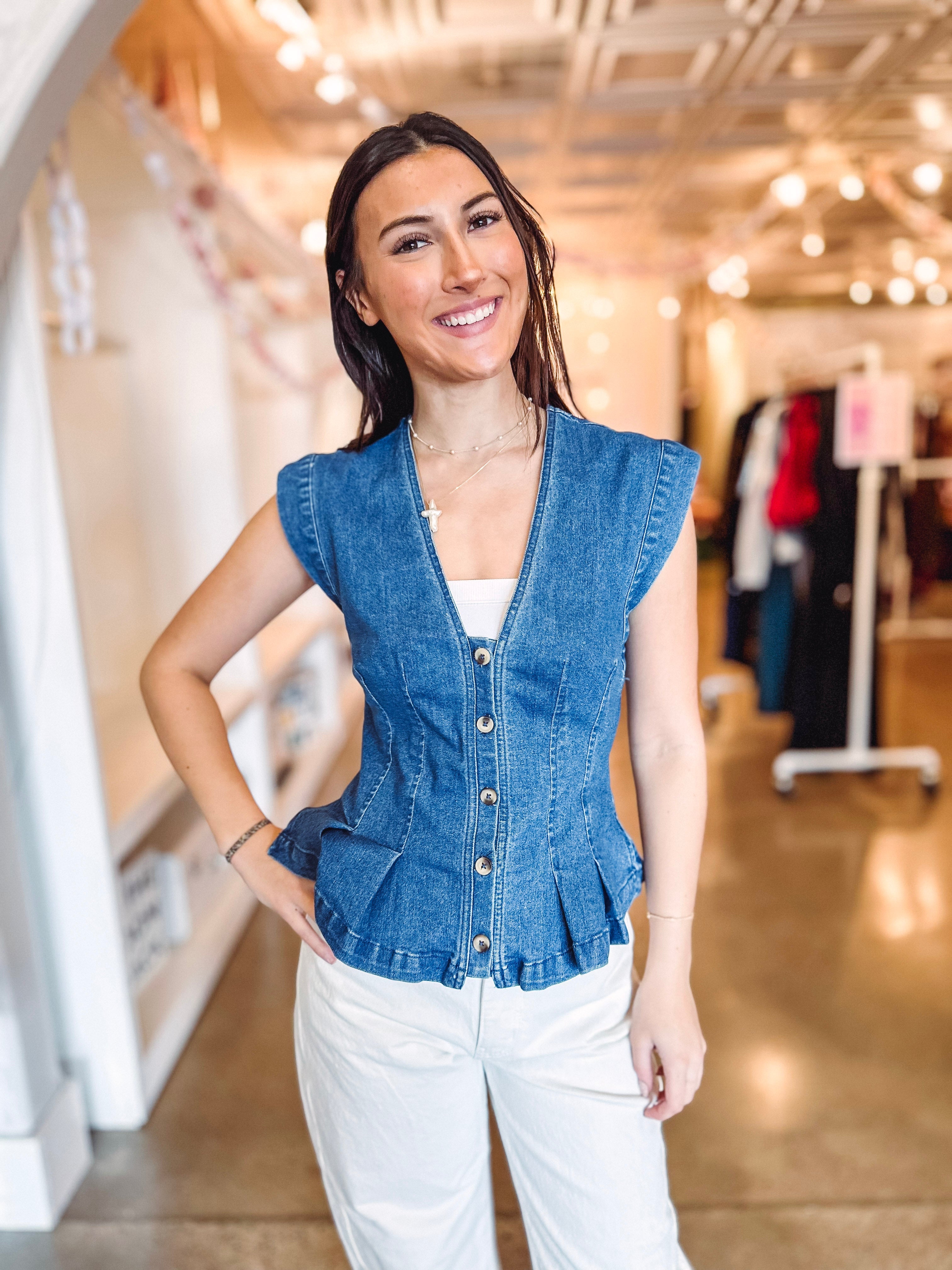 Effortlessly chic and undeniably flattering, the Dylan Denim Vest brings vintage-inspired charm to your everyday rotation. This button-front beauty features a pleated peplum that creates a gorgeous flared silhouette, while the V-neckline and wide shoulders offer a universally flattering frame. Capped sleeves and full length keep things polished without sacrificing comfort. Perfect for layering over basics or dressing up your favorite tee.