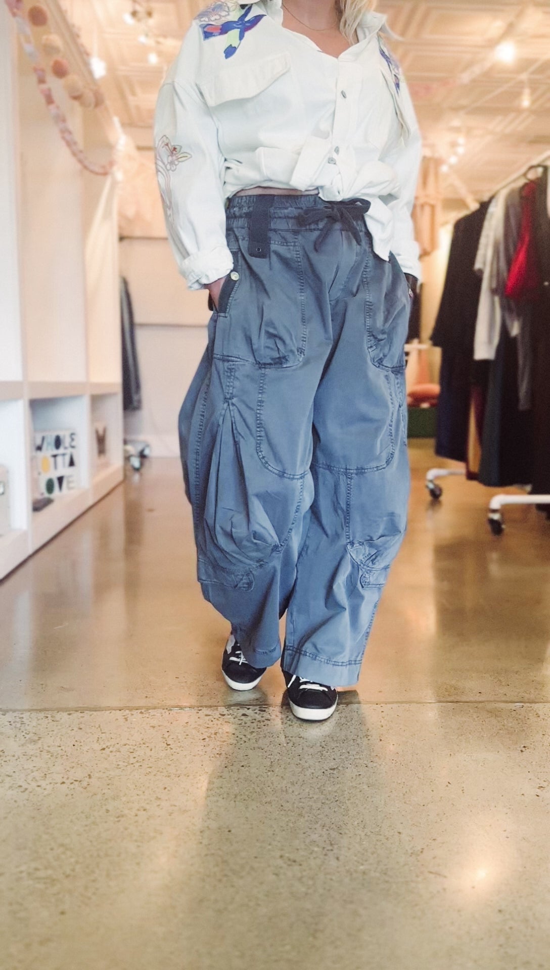 Throw on these Free People We The Free Onset Cargo Pants and embrace that effortless vibe. Crafted in a relaxed mid-rise silhouette, they feature a billowy, utility-inspired cut that's perfect for laid-back days. The elastic waistband with drawcord keeps things comfy, while belt loops and functional front and back buttoned pockets add practical style. The uniquely articulated leg shape gives these steel-colored pants an on-trend edge that works whether you're running errands or just vibing with friends.
