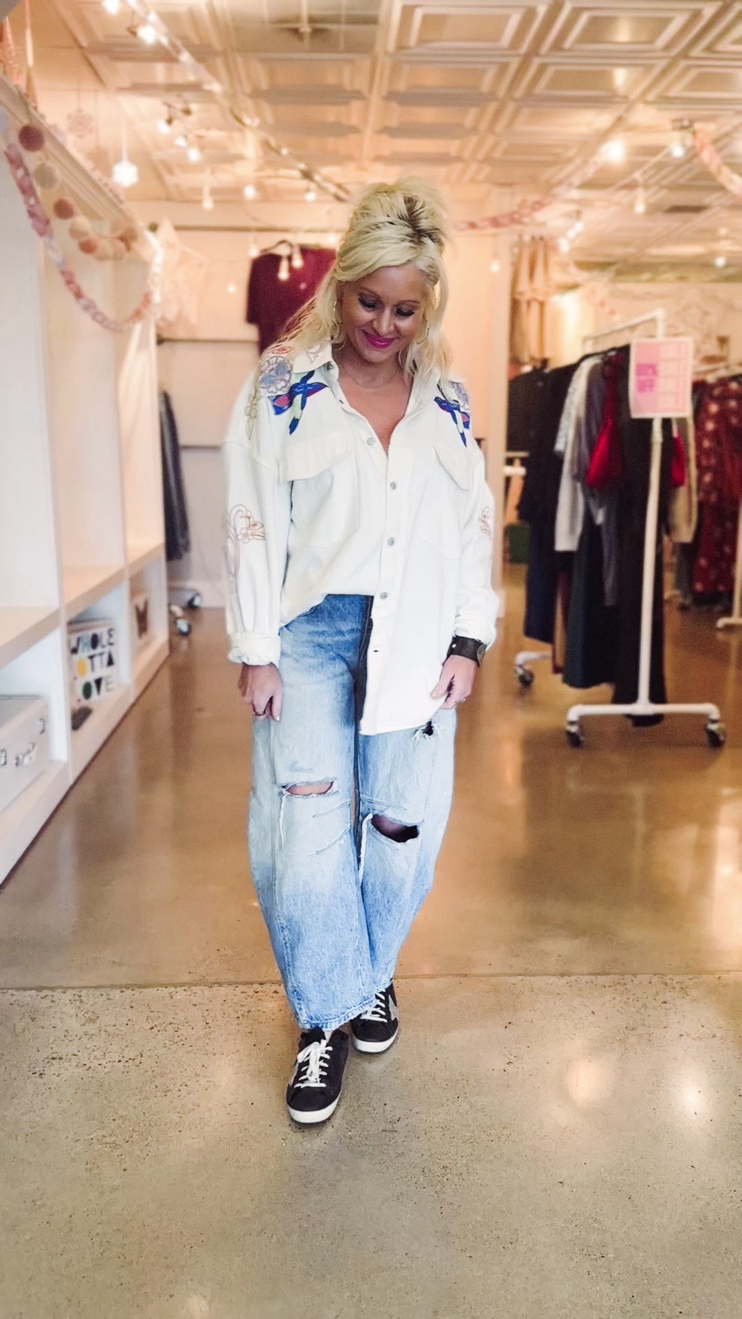Embrace effortless style with this We The Free button-down that's anything but ordinary. Crafted from soft cotton in a slouchy, oversized silhouette, it features dropped sleeves, raw seaming, and a chest pocket for laid-back charm. The real showstopper? Intricate colorful embroidery that transforms this casual essential into a statement piece. Perfect for throwing over your favorite tee or wearing solo, this chic shirt proves that cool never goes out of style.