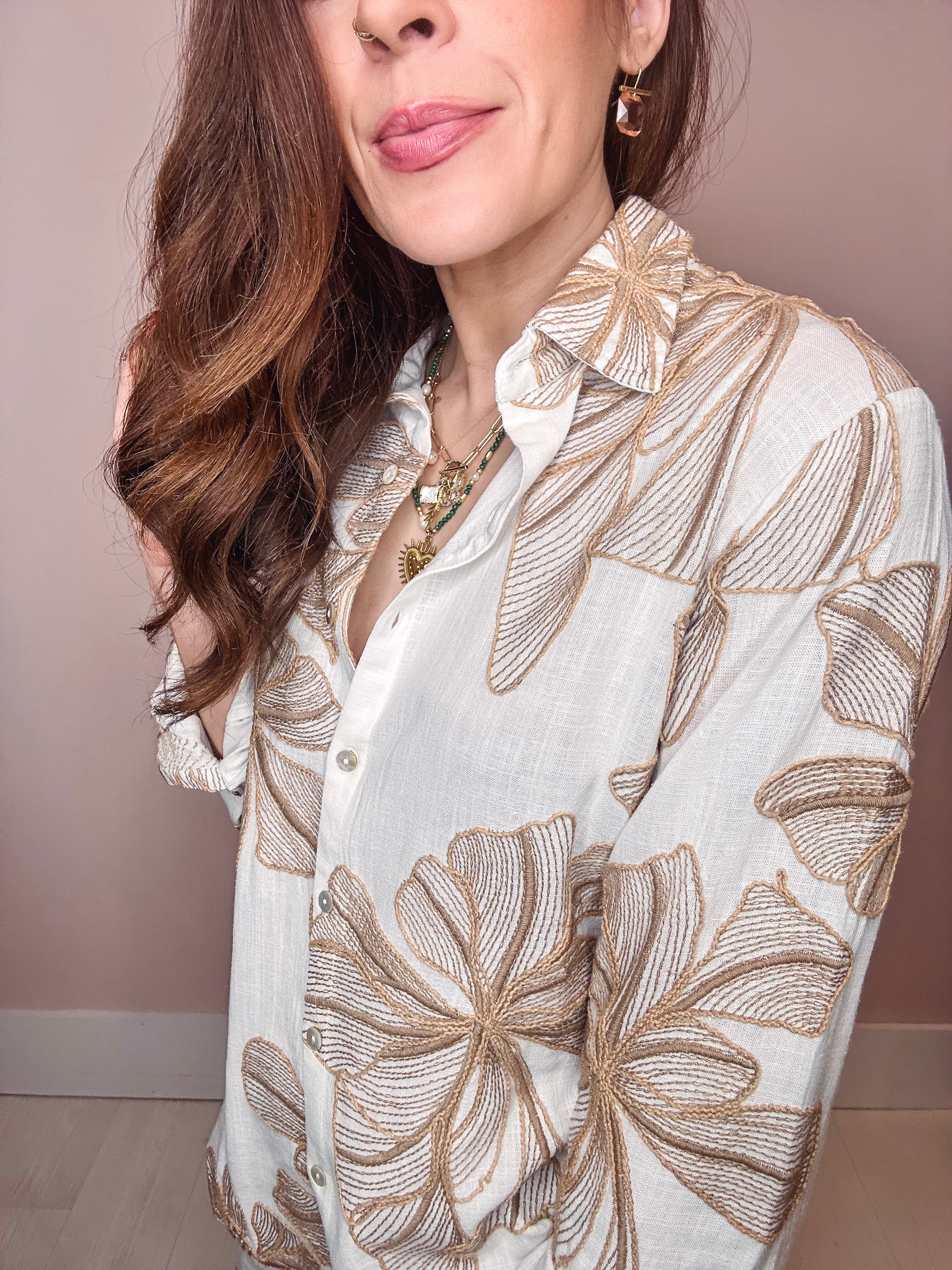 Effortless elegance meets bohemian charm in this beige shirt, adorned with a delicate tan floral design that captures natural beauty. Long sleeves provide versatile coverage, while the high-low hem adds contemporary movement and dimension to your silhouette. Perfect for layering or wearing solo, this piece transitions seamlessly from casual days to evening occasions. The relaxed fit and thoughtful design make it a wardrobe essential for those who appreciate understated style with character.