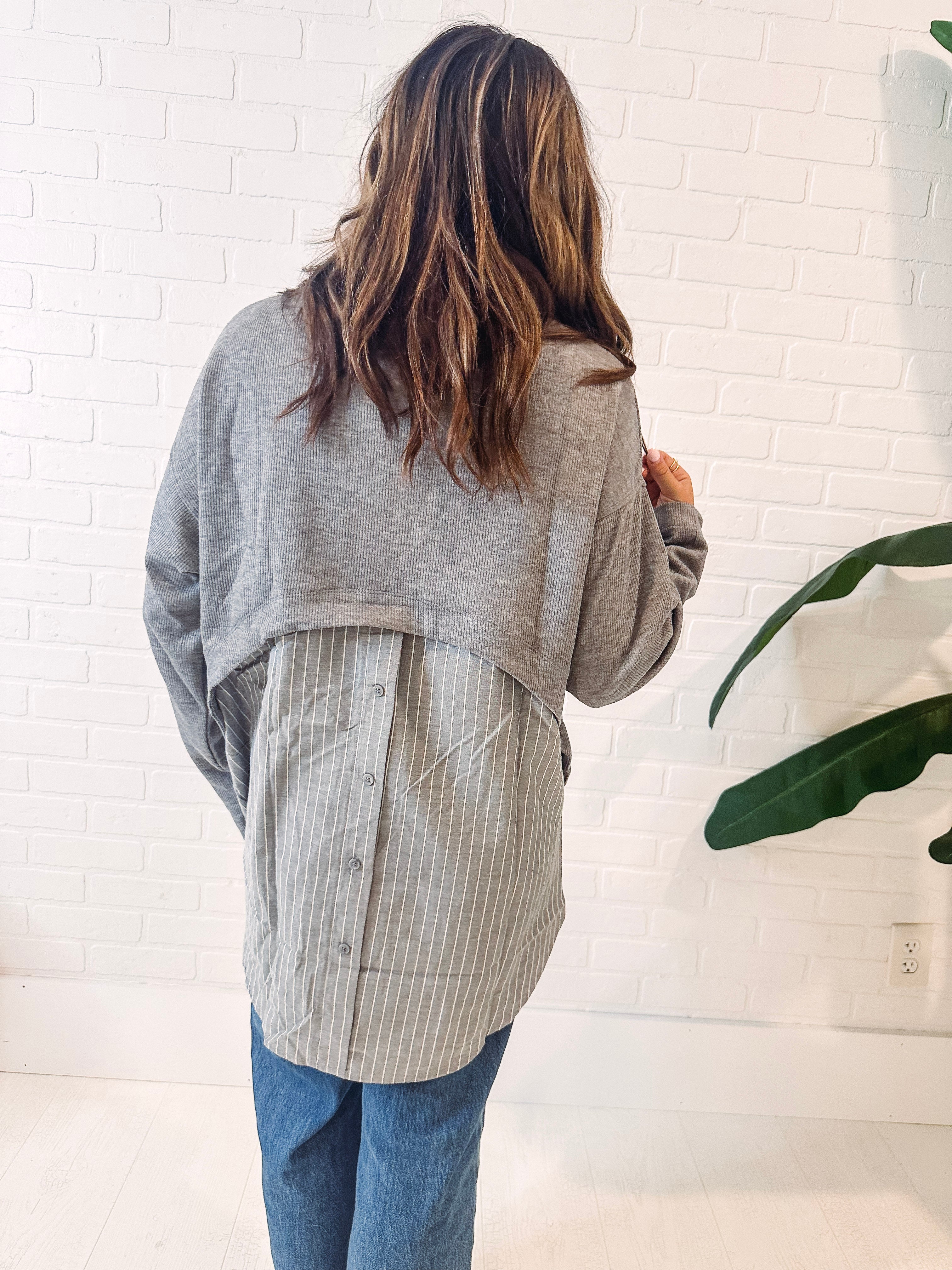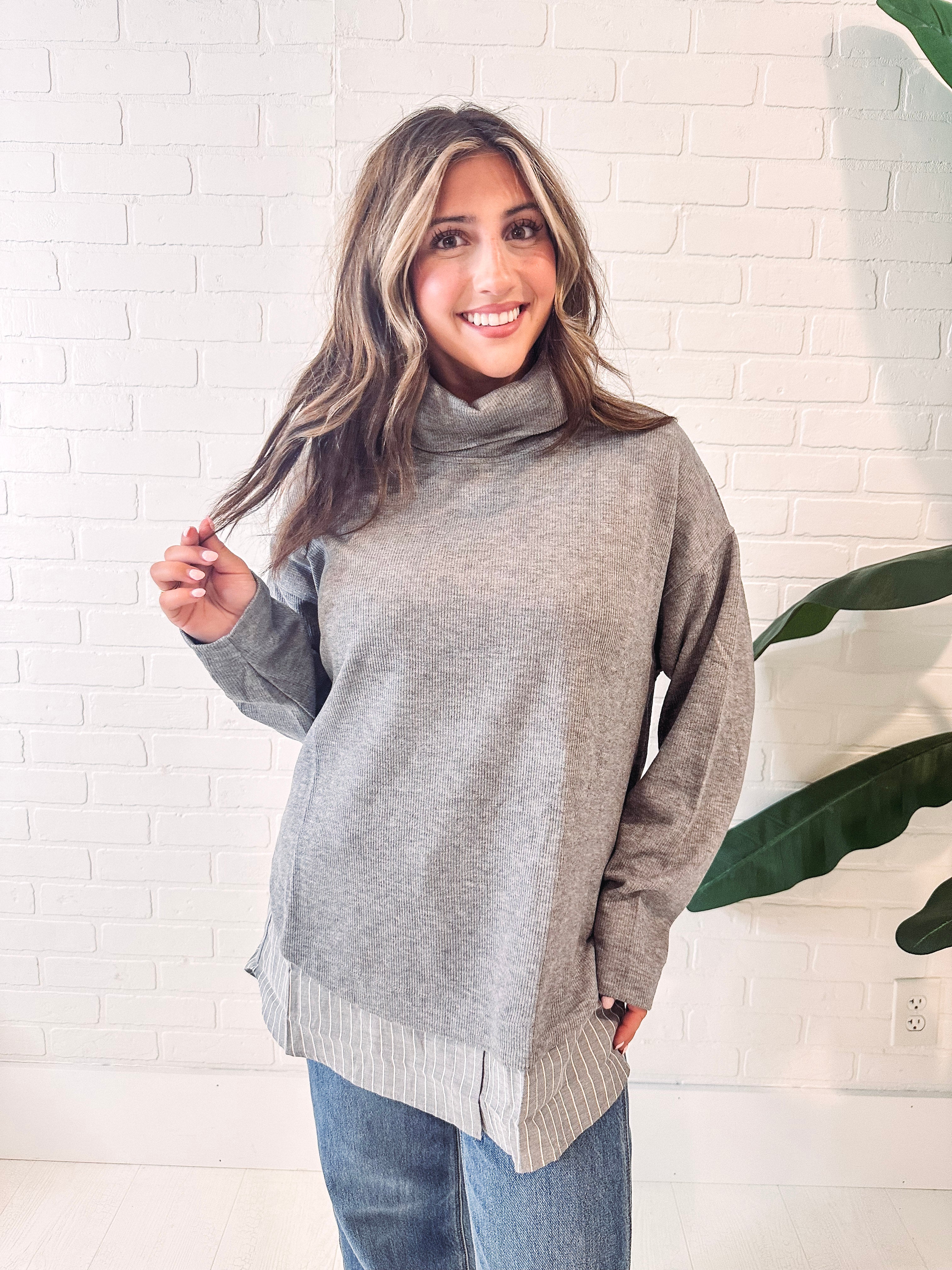 The Molly Mixed Media Turtleneck Top brings a playful twist to your wardrobe with its unique layered design. Combining cozy sweater fabric with crisp button-down shirt details, it offers an effortlessly edgy look that’s perfect for mixing and matching. Stay comfy and stylish all day long with this standout piece.