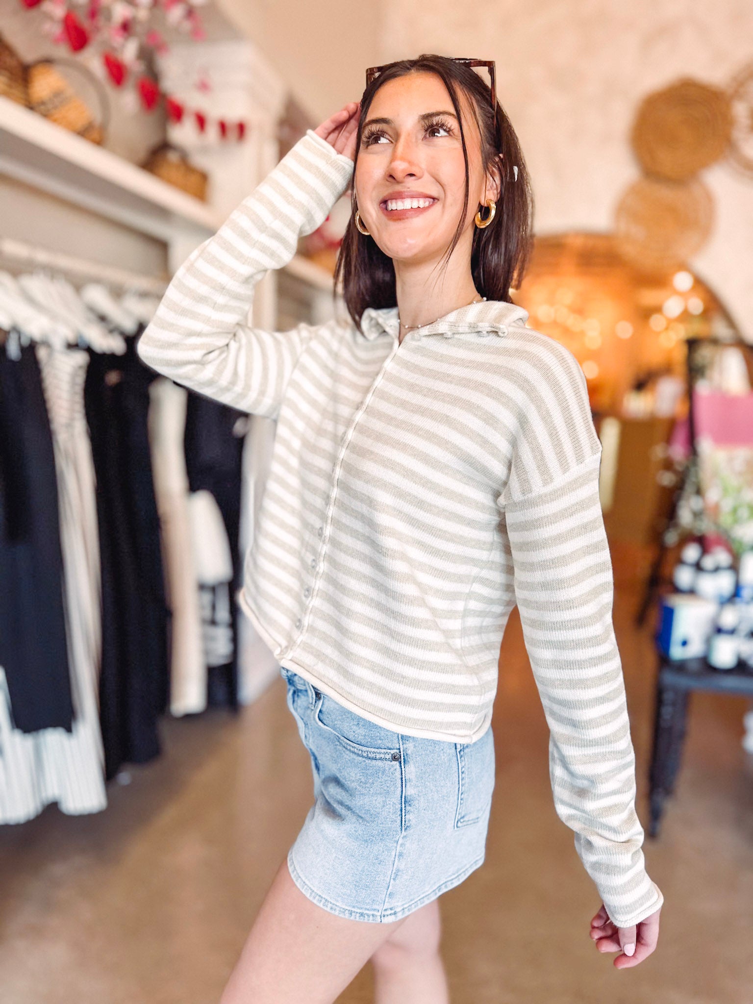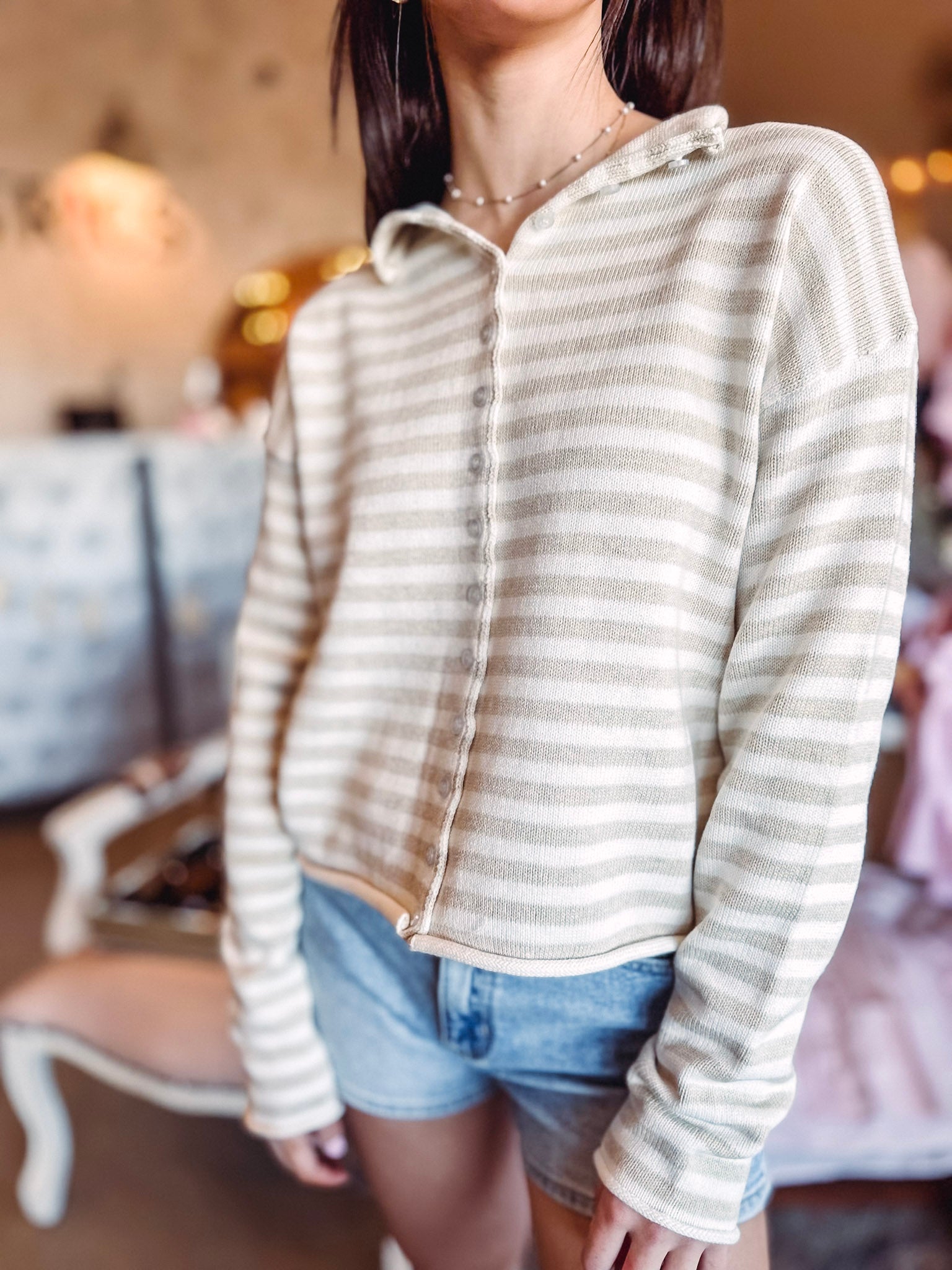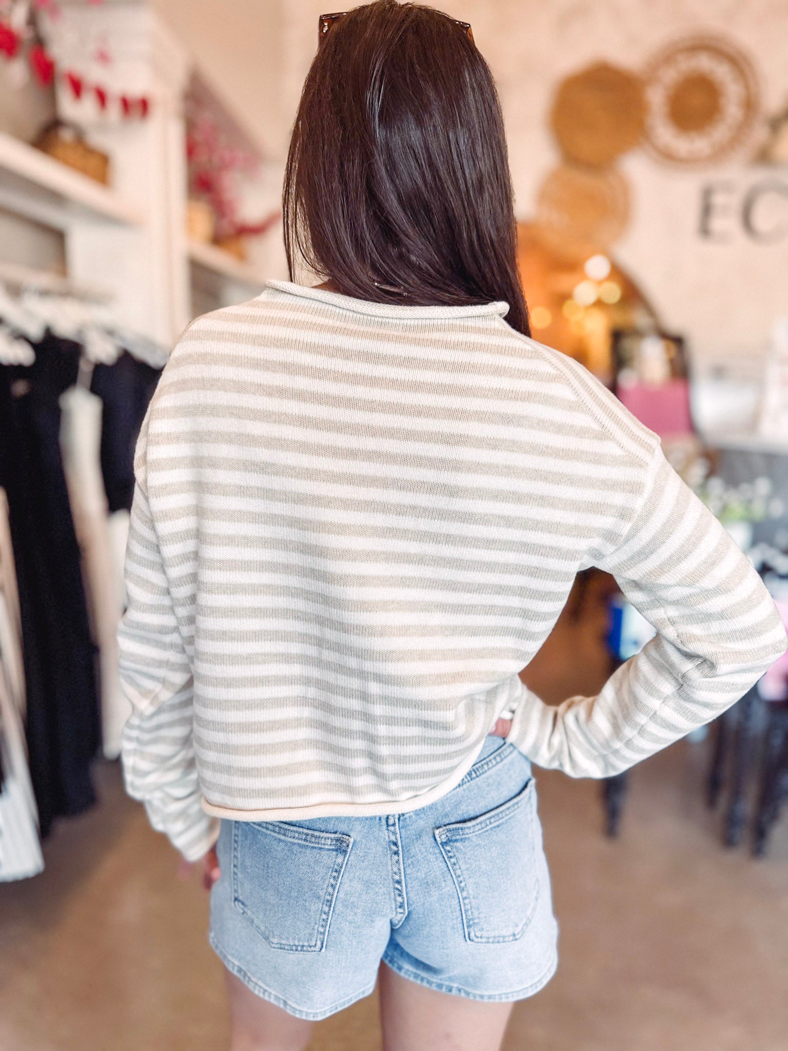 Meet your new layering essential—the Olivia Striped Cardigan. This charming piece features classic oatmeal and white stripes that pair effortlessly with everything in your closet. Crafted from wonderfully soft fabric, it's the perfect throw-on for adding warmth and personality to any outfit. The button-front design and trendy raw edge hems give it just the right amount of casual cool. Whether you're layering over a tee or a dress, this cardigan is ready to become your go-to favorite.