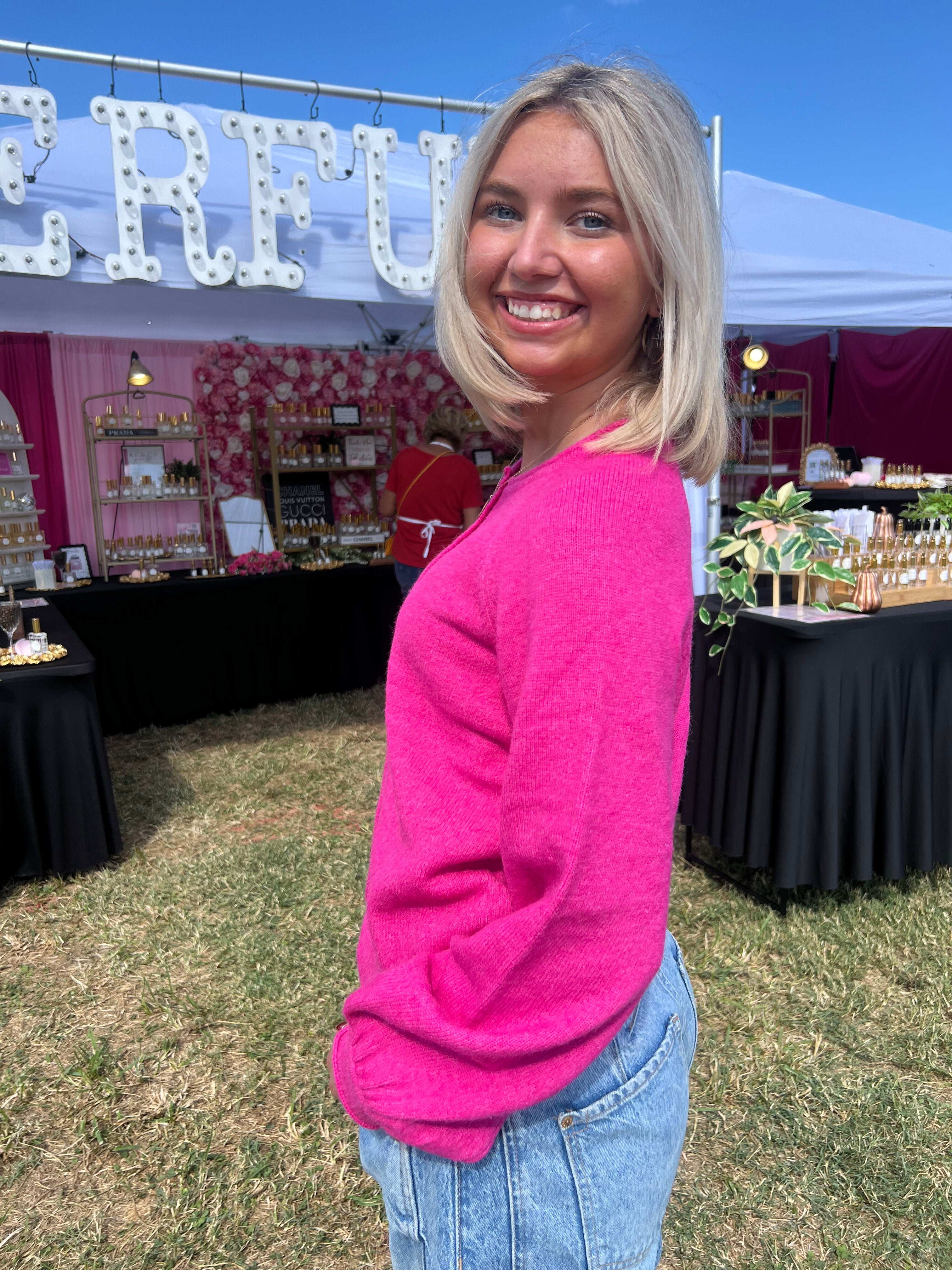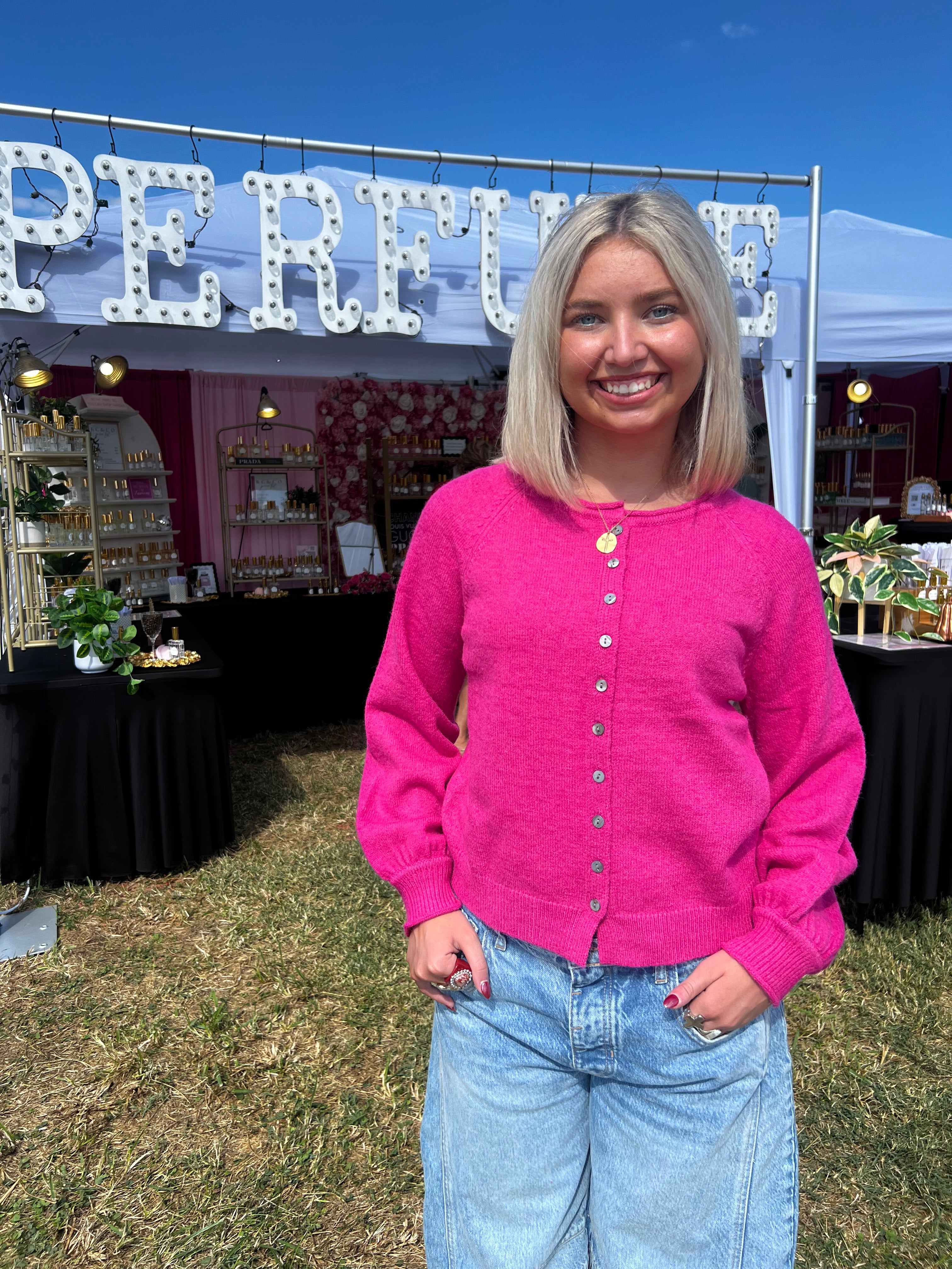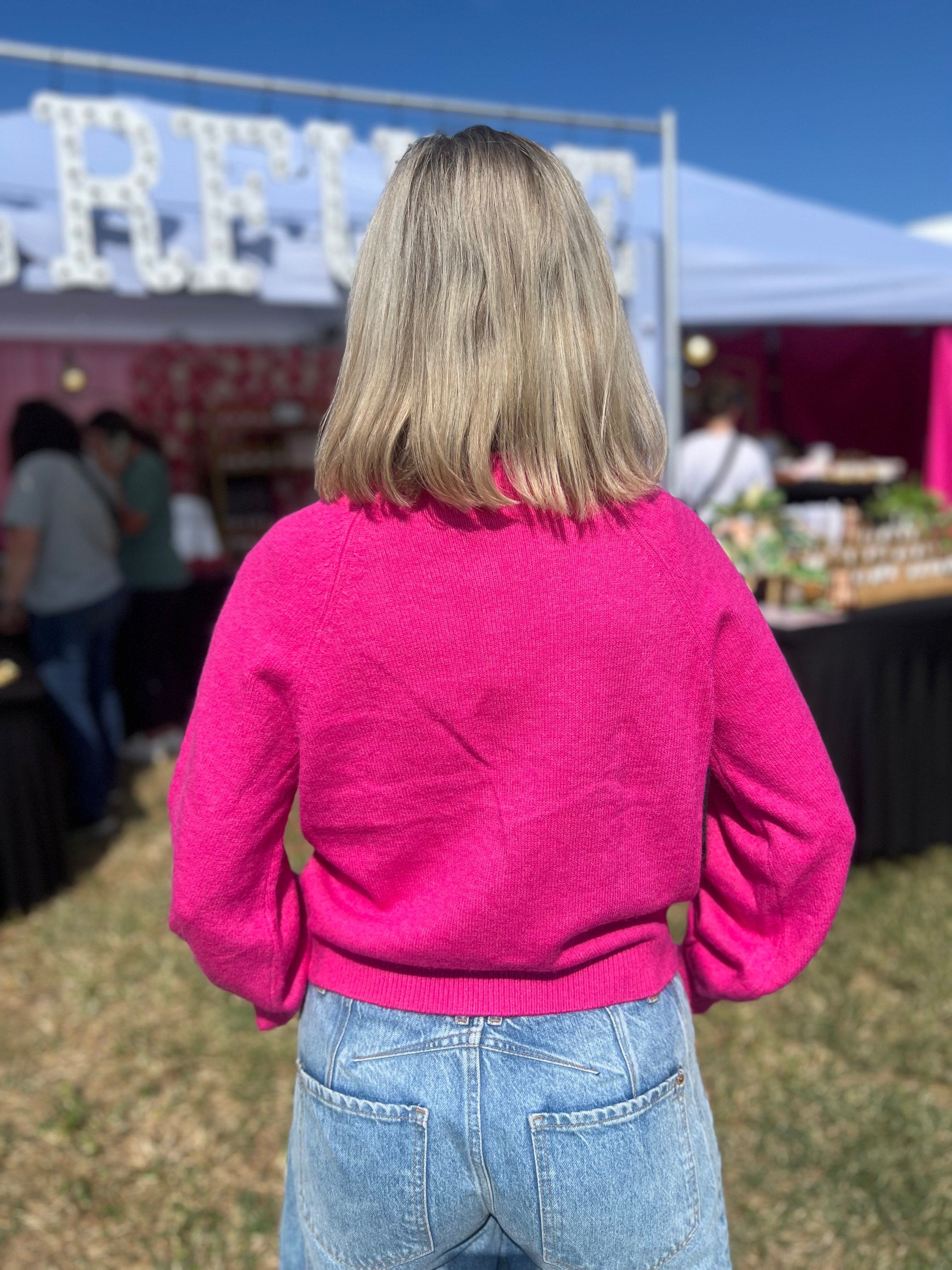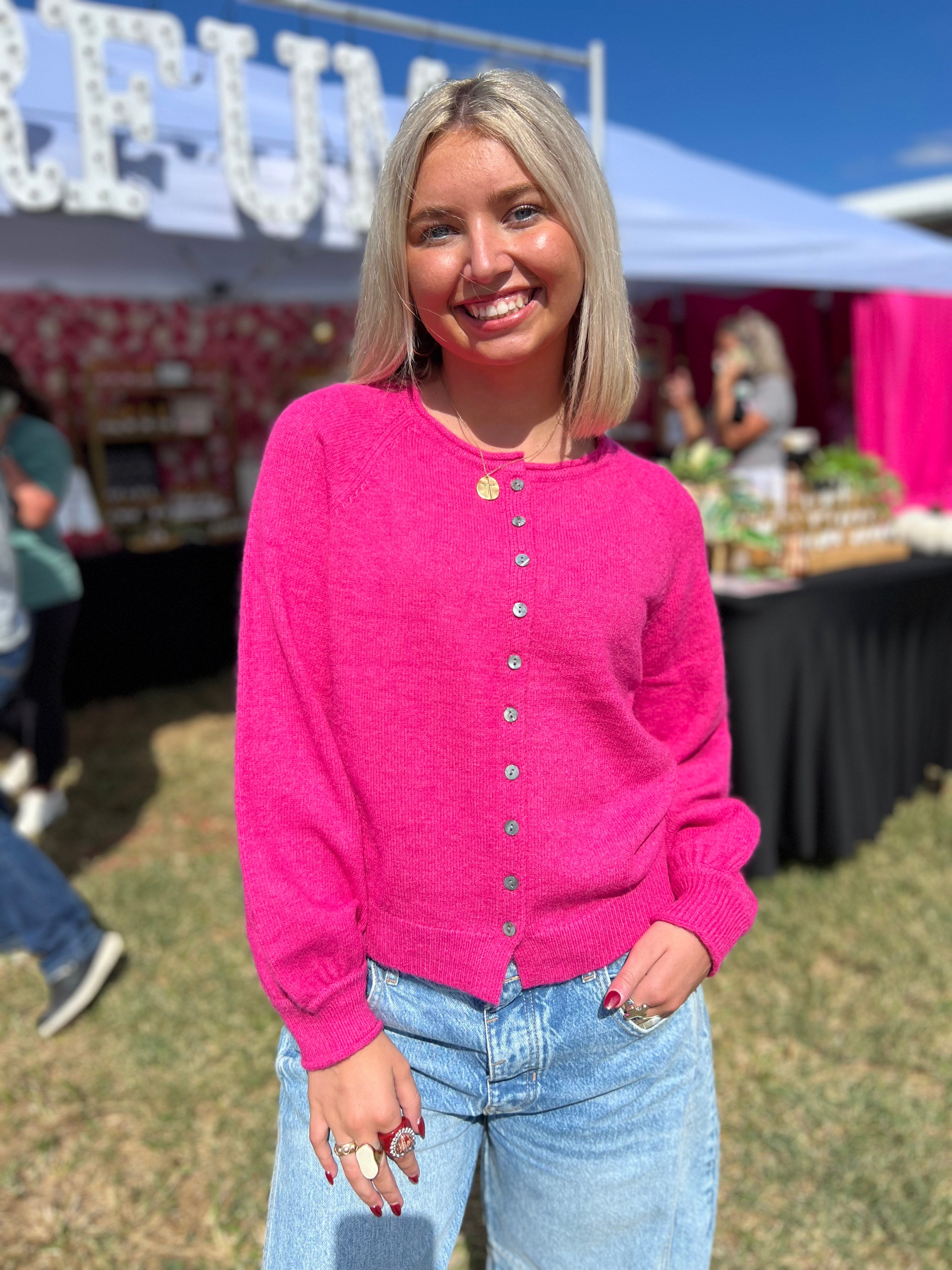 This bright pink button-up sweater combines cozy comfort with classic style for an effortlessly chic look. Its relaxed fit and soft pastel shade make it perfect for layering or wearing on its own when the air turns crisp. Whether paired with jeans for a casual day out or a flowy skirt for a playful, feminine touch, this sweater adds a splash of fun to any outfit.