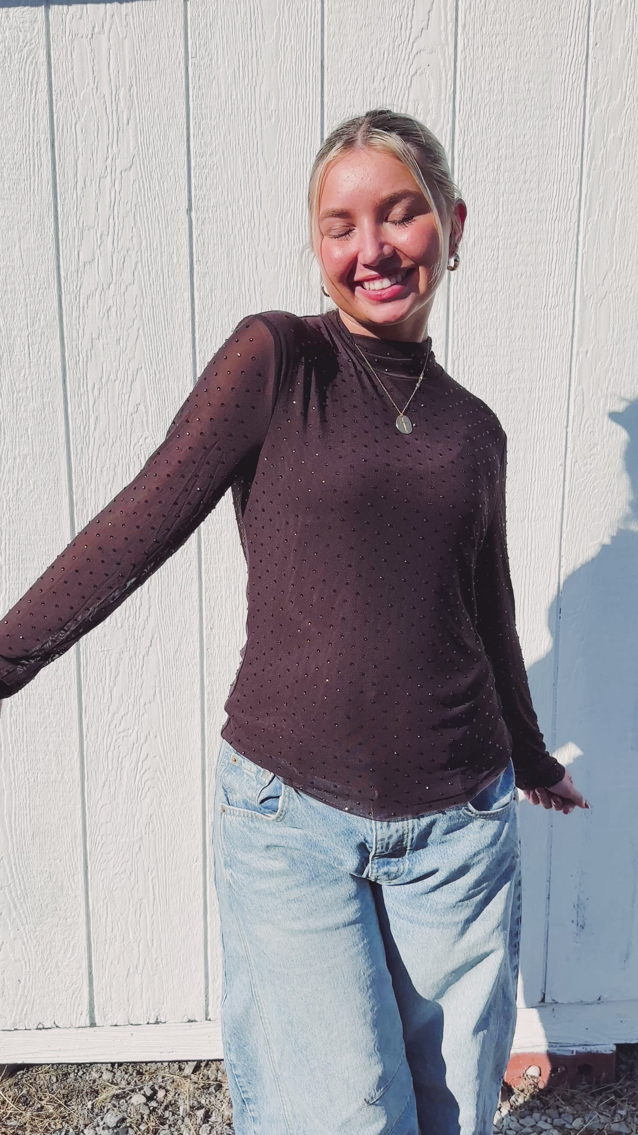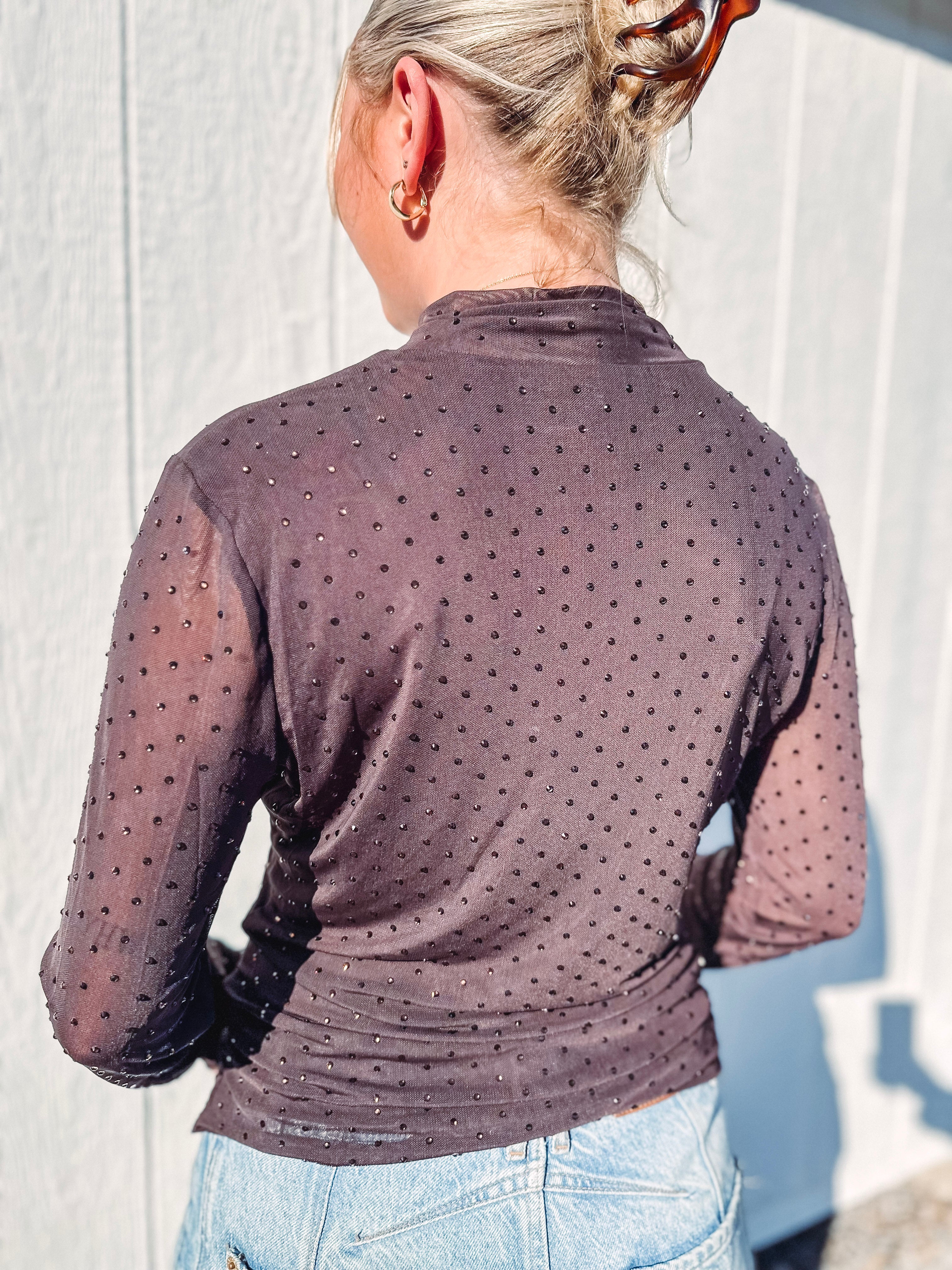 Elevate your style with this Embellished Mock Neck Long Sleeve Top. The playful sparkle and intricate embellishments add just the right amount of glam, while the fitted silhouette highlights your shape. Sheer mesh sleeves bring a flirty, modern twist that keeps this top both chic and fun. Perfect for evenings when you want to shine!