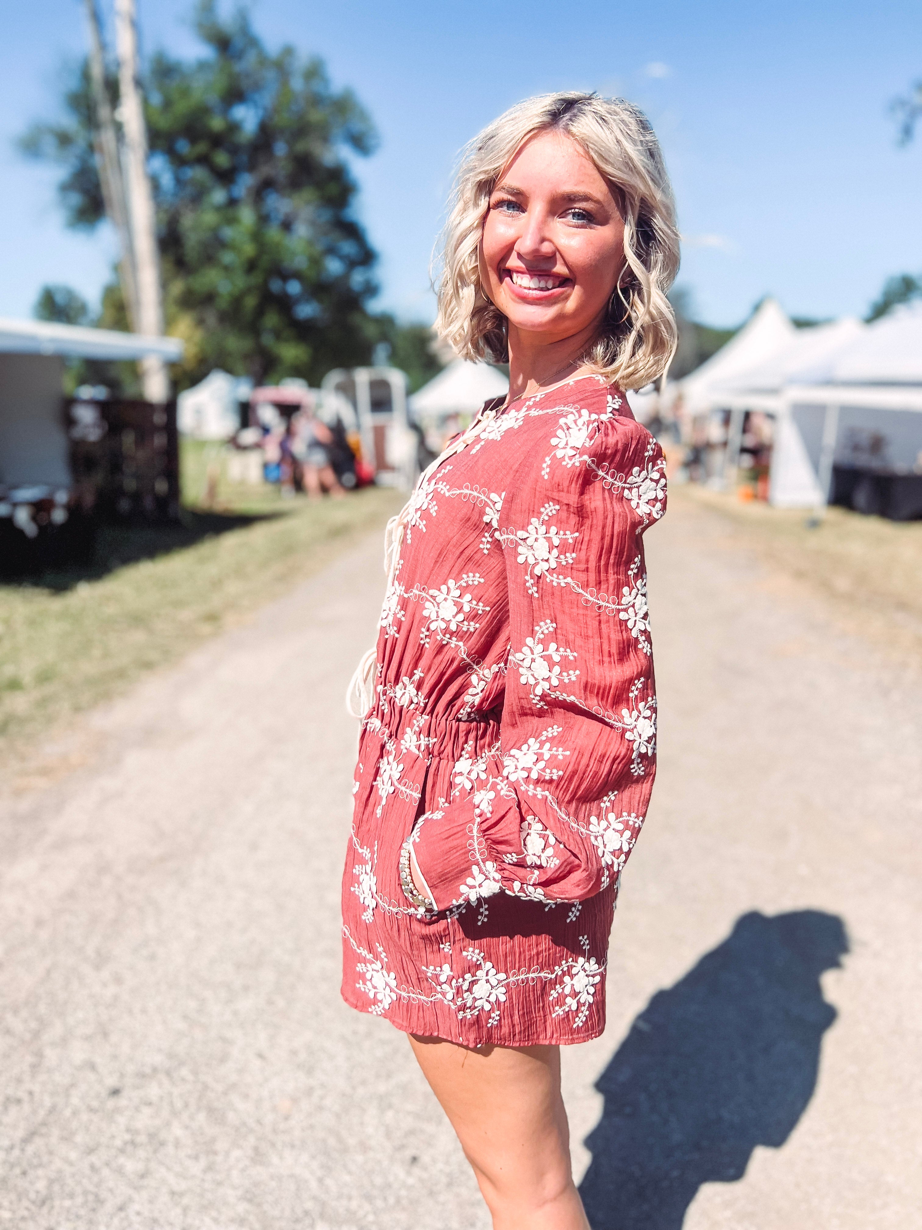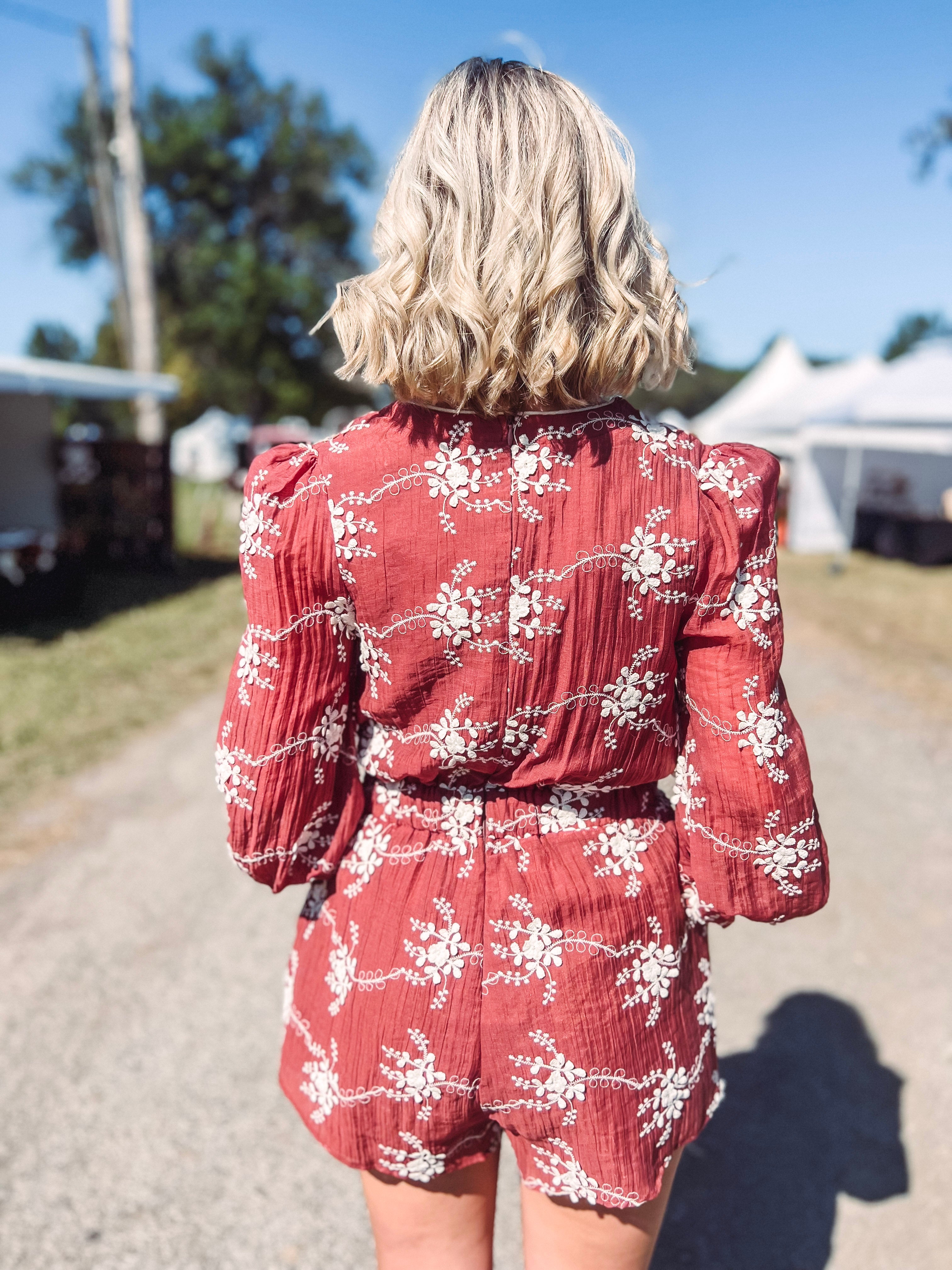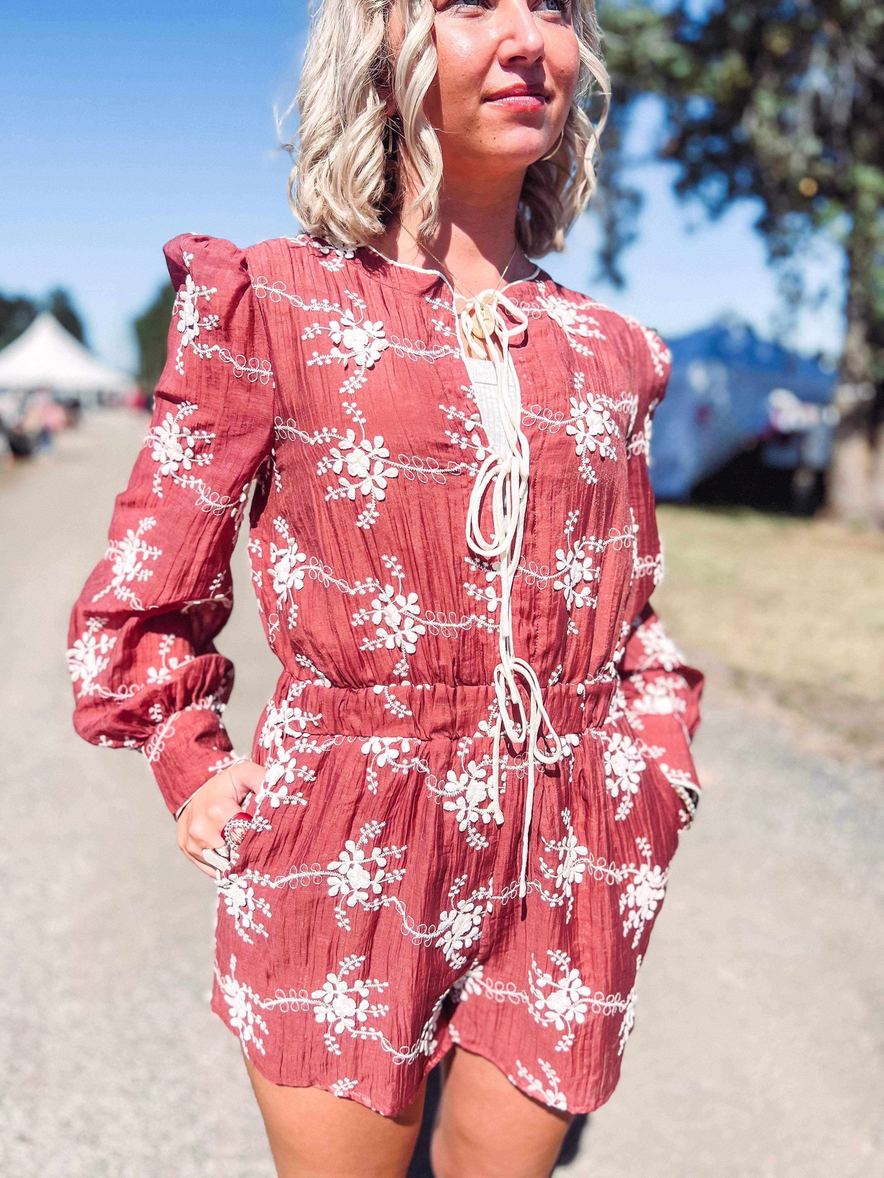 Step into cozy charm with the Essence Embroidered Tie Front Romper! This mocha long-sleeve romper flaunts a cinched waist and a playful brown tie-front, adding a dash of rustic flair to your look. Its soft neutral shade makes layering a breeze, perfect for pairing with your favorite boots and jackets as the leaves turn. Effortlessly stylish and ready for fall adventures!
