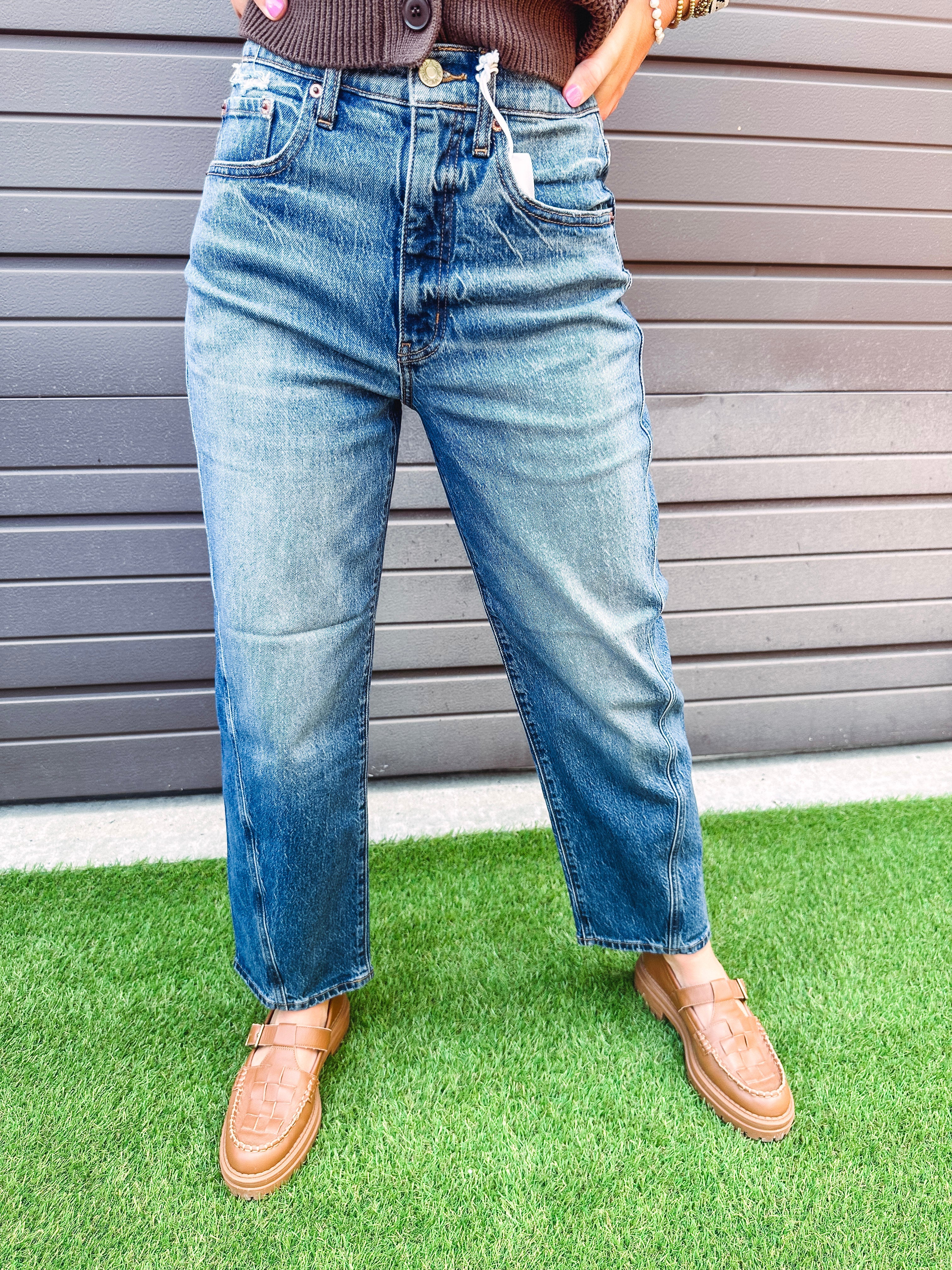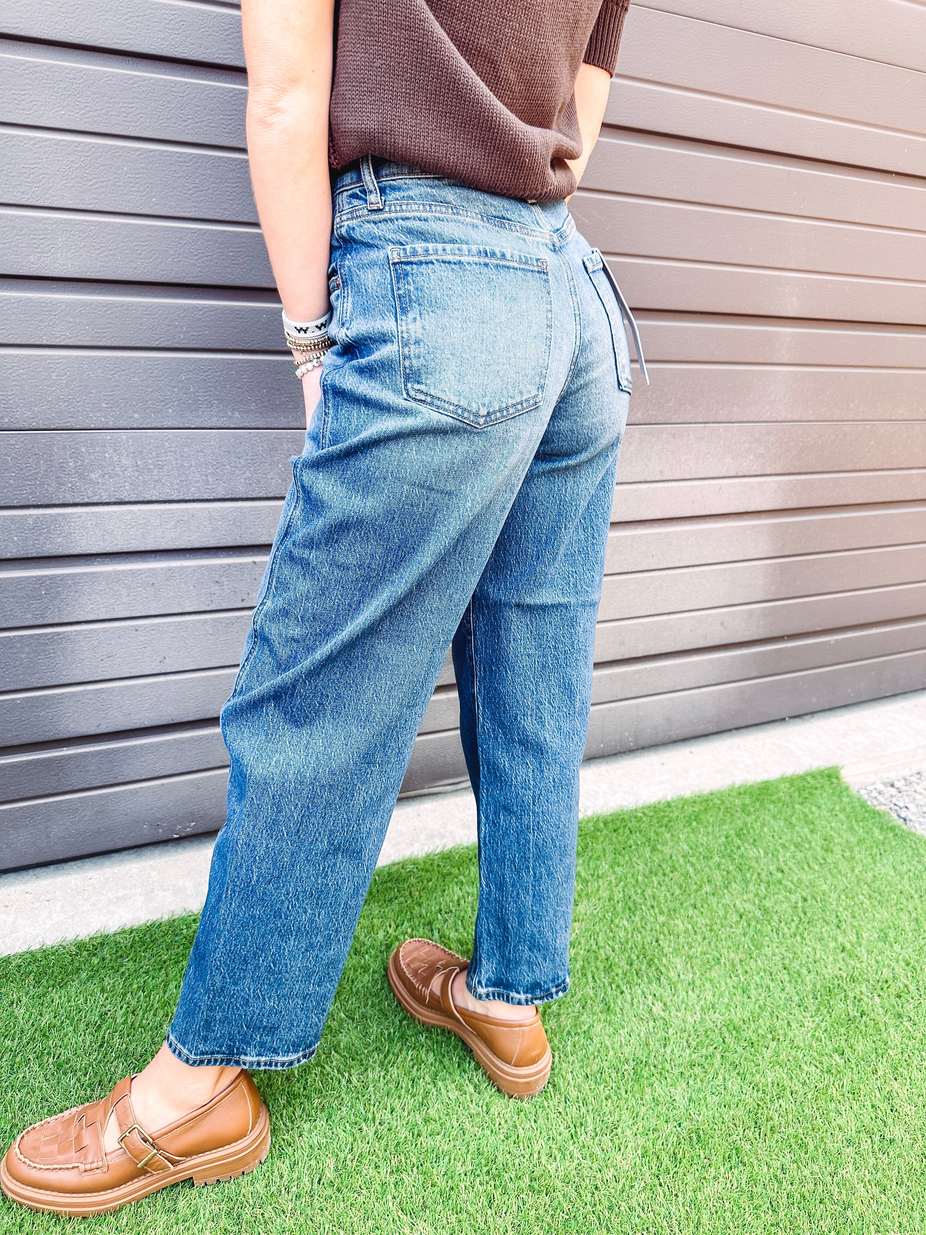 Elevate your denim game with the Daze Denim Westward Barrel Leg jeans—where vintage vibes meet modern sass. With a high-rise cinched waist and playful bowed leg, these jeans hug just right before tapering at the ankle. The dark wash adds mystery, while the Tough Love fabric gives you structure with a comfy stretch that moves like you do. Perfect for dancing through your day or stealing the spotlight wherever you go.
