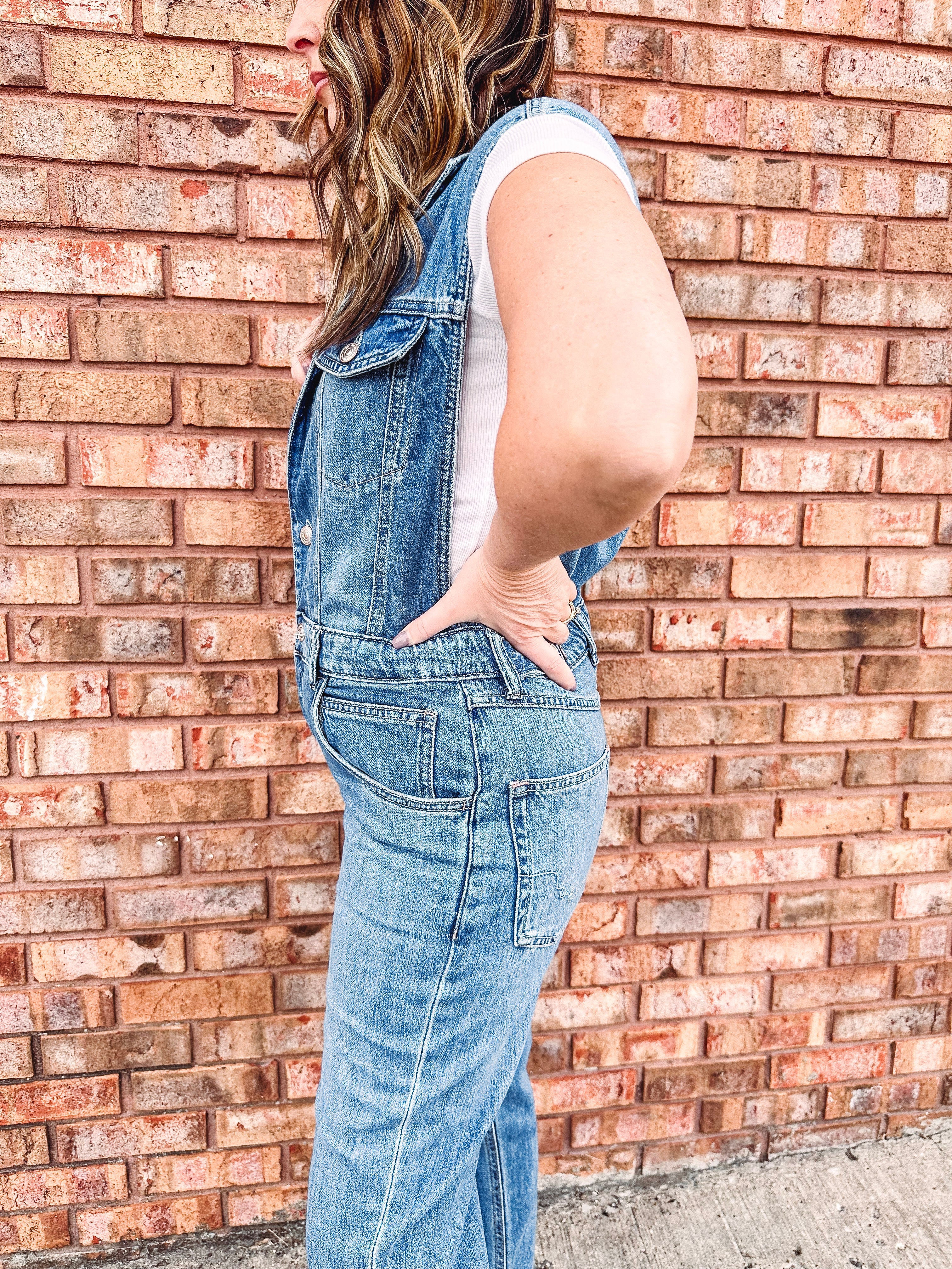 Skip the outfit-planning stress and reach for this sleeveless denim jumpsuit that does all the heavy lifting. The perfectly faded finish gives it that effortlessly cool vibe, while the fitted silhouette keeps things polished and put-together. Whether you're running errands or grabbing coffee with friends, this one piece handles it all—no second-guessing required.