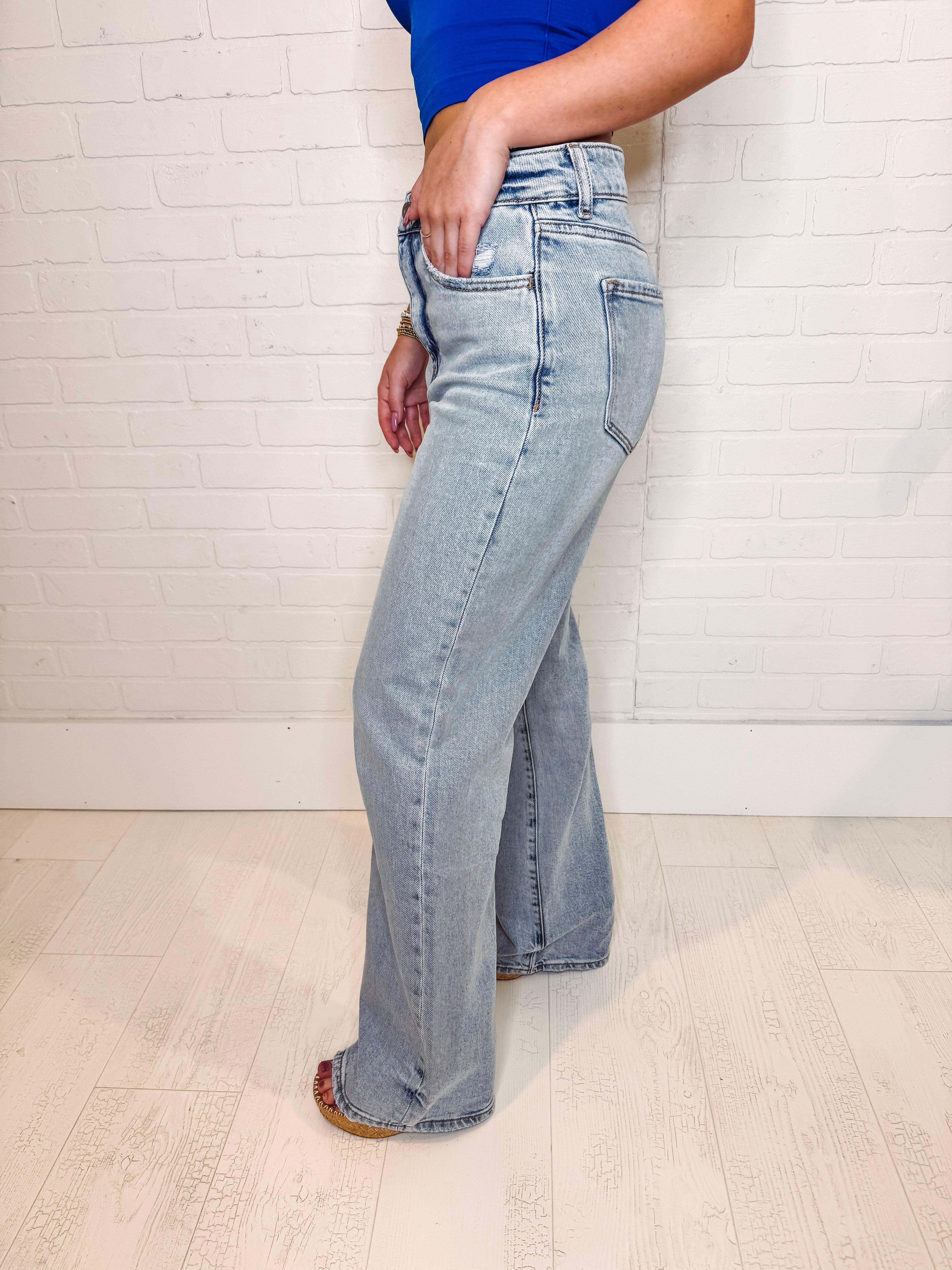 Step back in time with our Leslie 90's Vintage Flare Denim in Light Wash! These high-rise beauties start straight at the thigh before gracefully widening to a classic wide leg silhouette. The perfect light wash creates that coveted lived-in look without trying too hard. Make these your summer staple—they'll play nice with crop tops, graphic tees, or whatever mischief you're getting into this season! Your closet called, and it's begging for this throwback treasure.