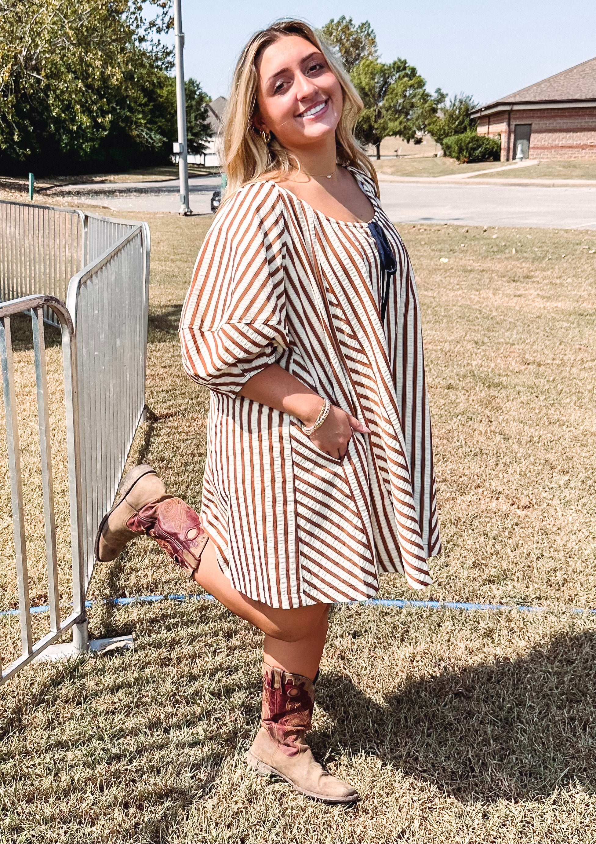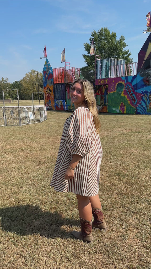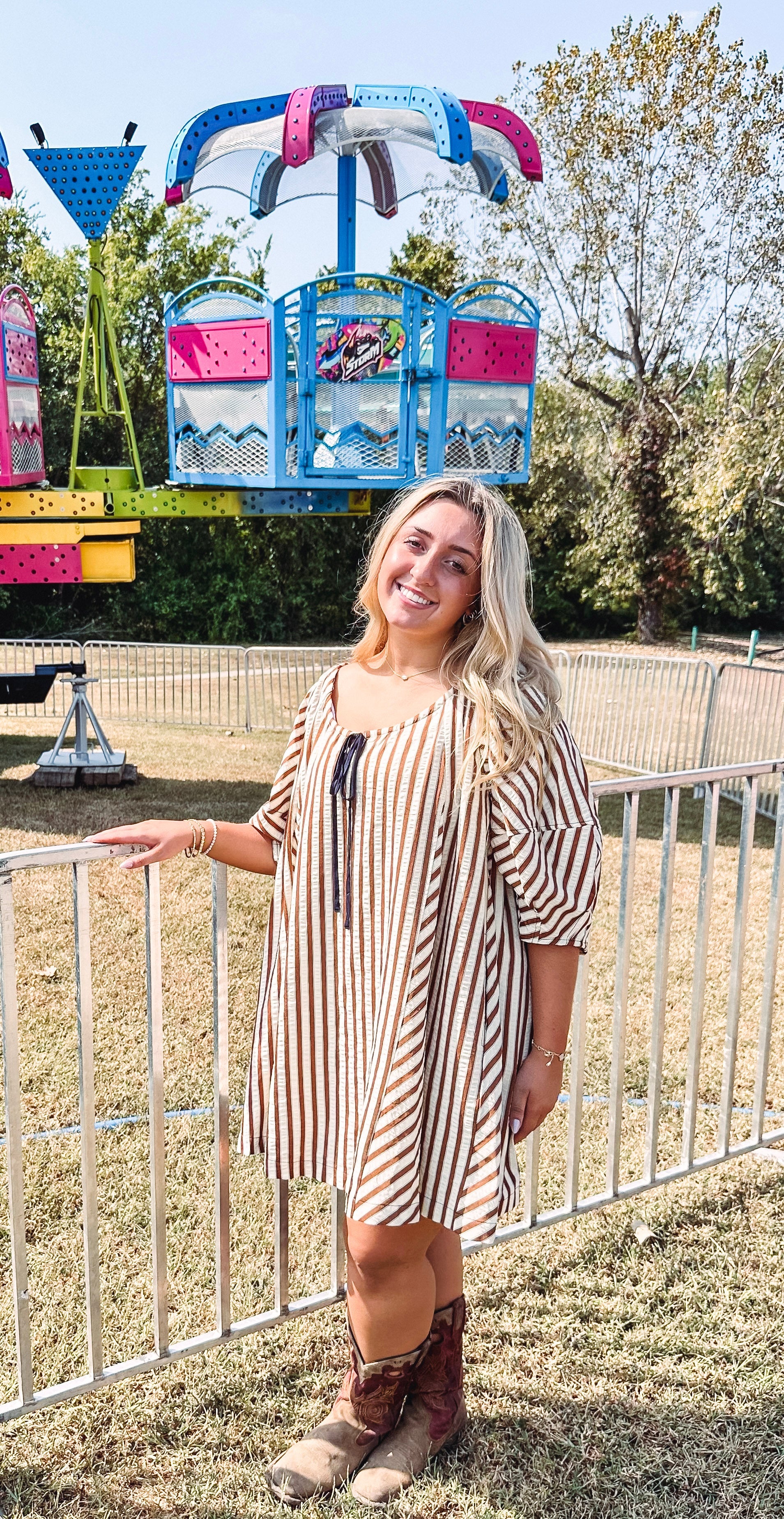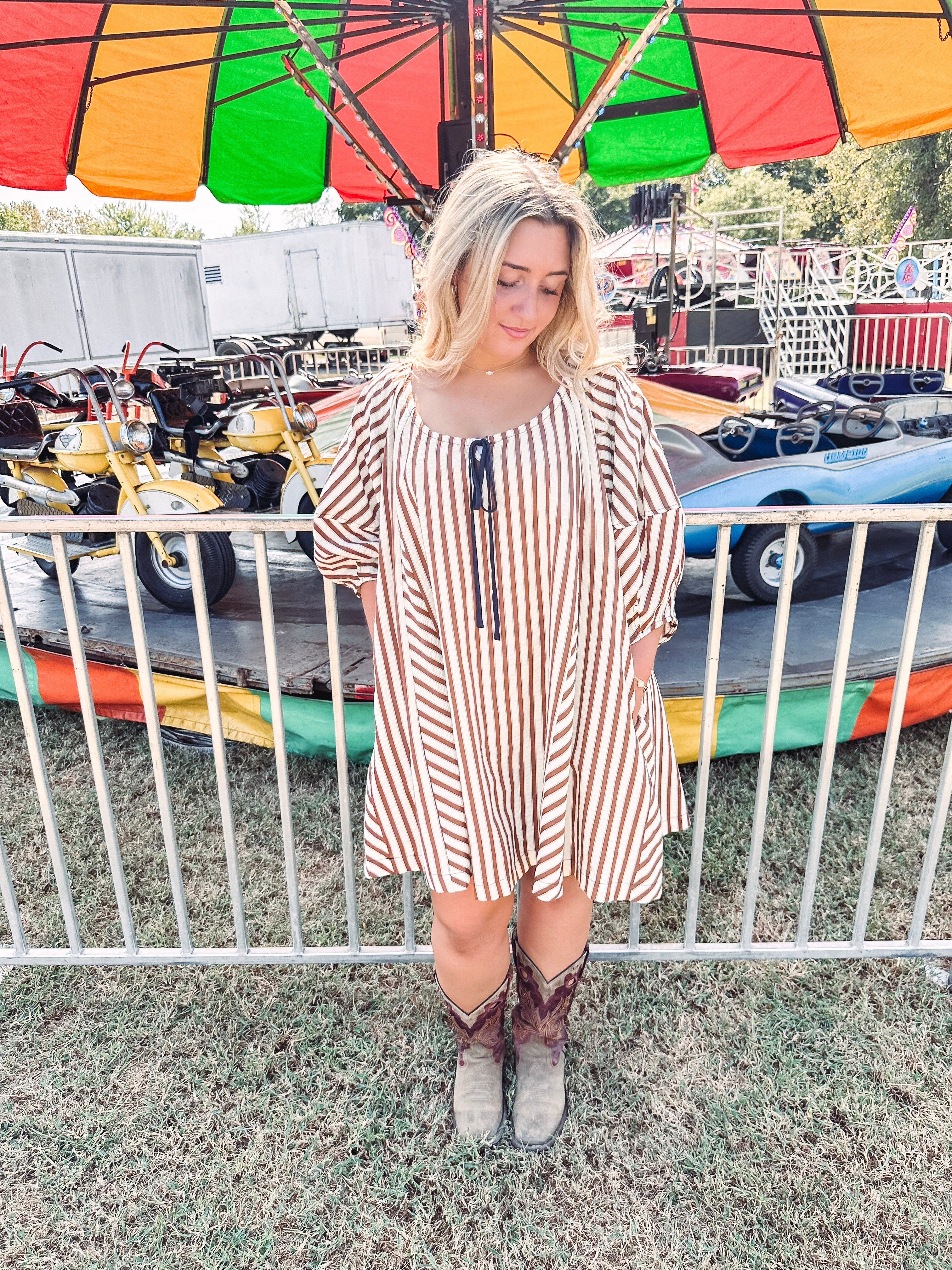 This striped stunner combines classic style with a fresh, playful edge. With its 3/4 puff sleeves and flirty hem, it’s perfect for cozy fall outings like pumpkin patch adventures or brunch dates. The vintage-inspired tie neckline and vibrant stripe print pop beautifully against the cream base, making it a fun and flattering choice for any autumn occasion.