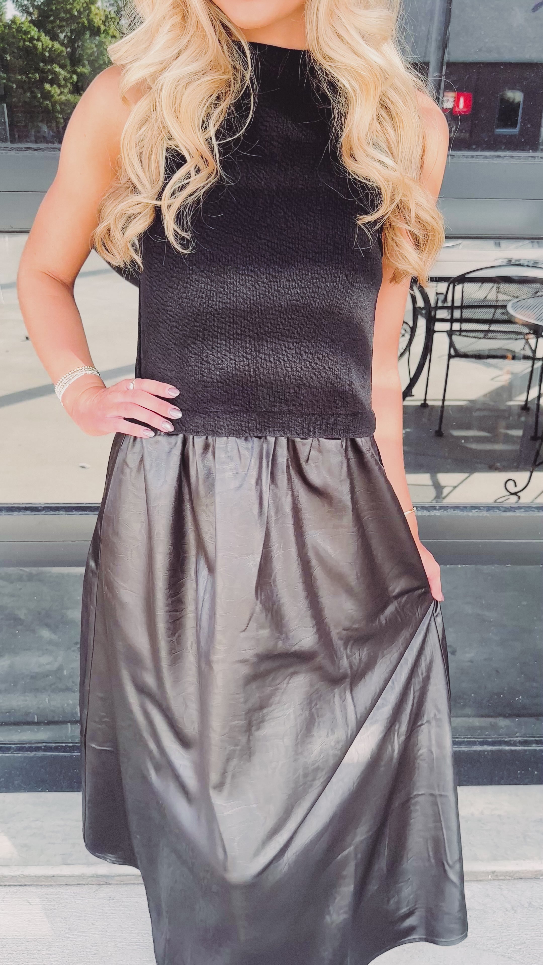 Step up your style game with the Celeste Sleeveless Mixed Media Maxi Dress! Enjoy the cozy comfort of soft knit fabric on top paired with a chic faux leather-like skirt that adds a bold, modern flair. The sleeveless design keeps things breezy and elegant, while the contrasting textures give your look a playful edge. Perfect for occasions when you want to make a subtle yet unforgettable statement.