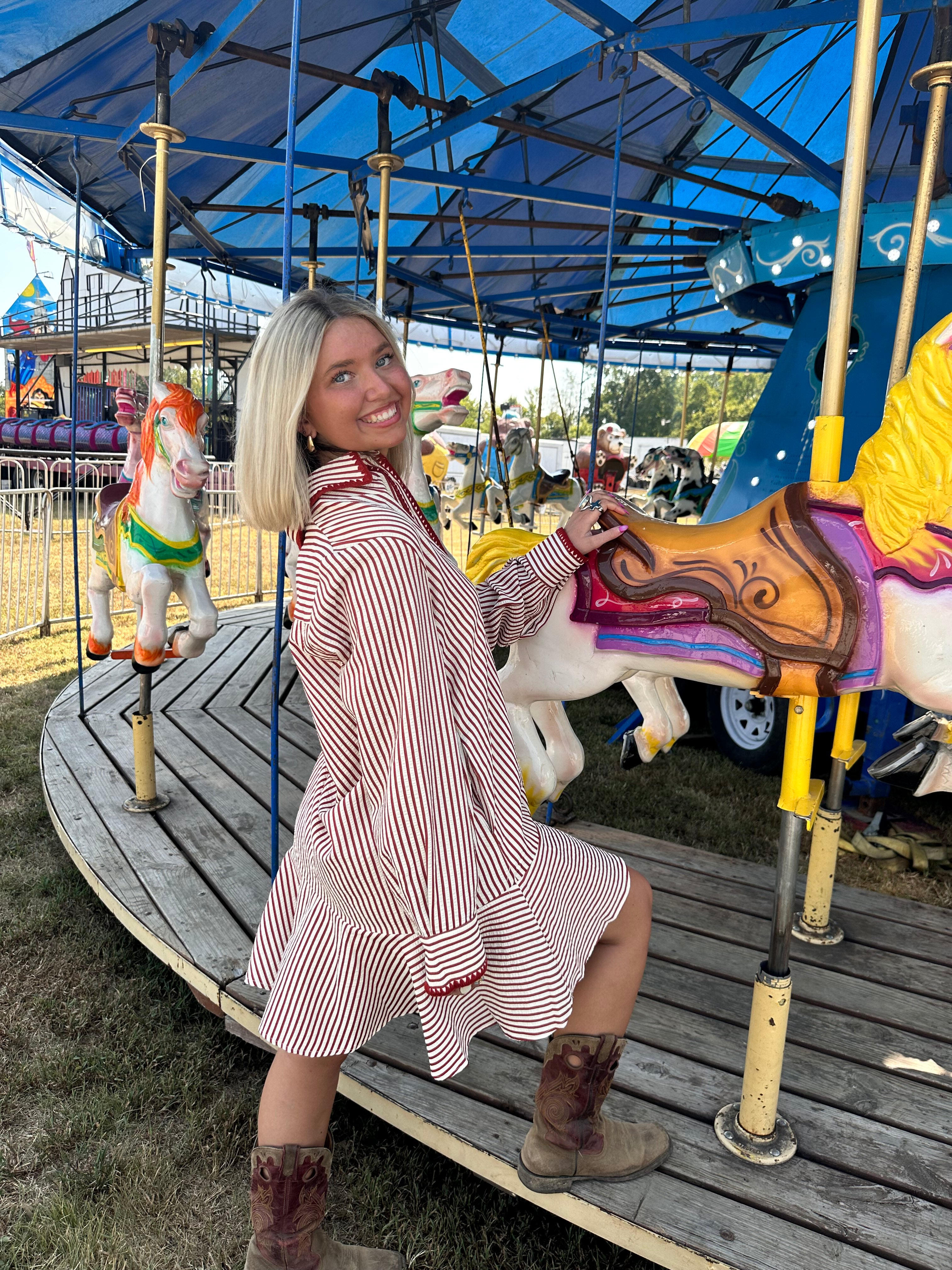 This playful striped mini dress combines style and comfort with its lightweight, woven fabric and lined design. Featuring a collared neckline and a half button front closure, it adds a touch of charm, while the buttoned cuffs and long sleeves keep it classy. Convenient side pockets and front button details complete this non-sheer, easy-to-wear piece perfect for lively days and fun nights.