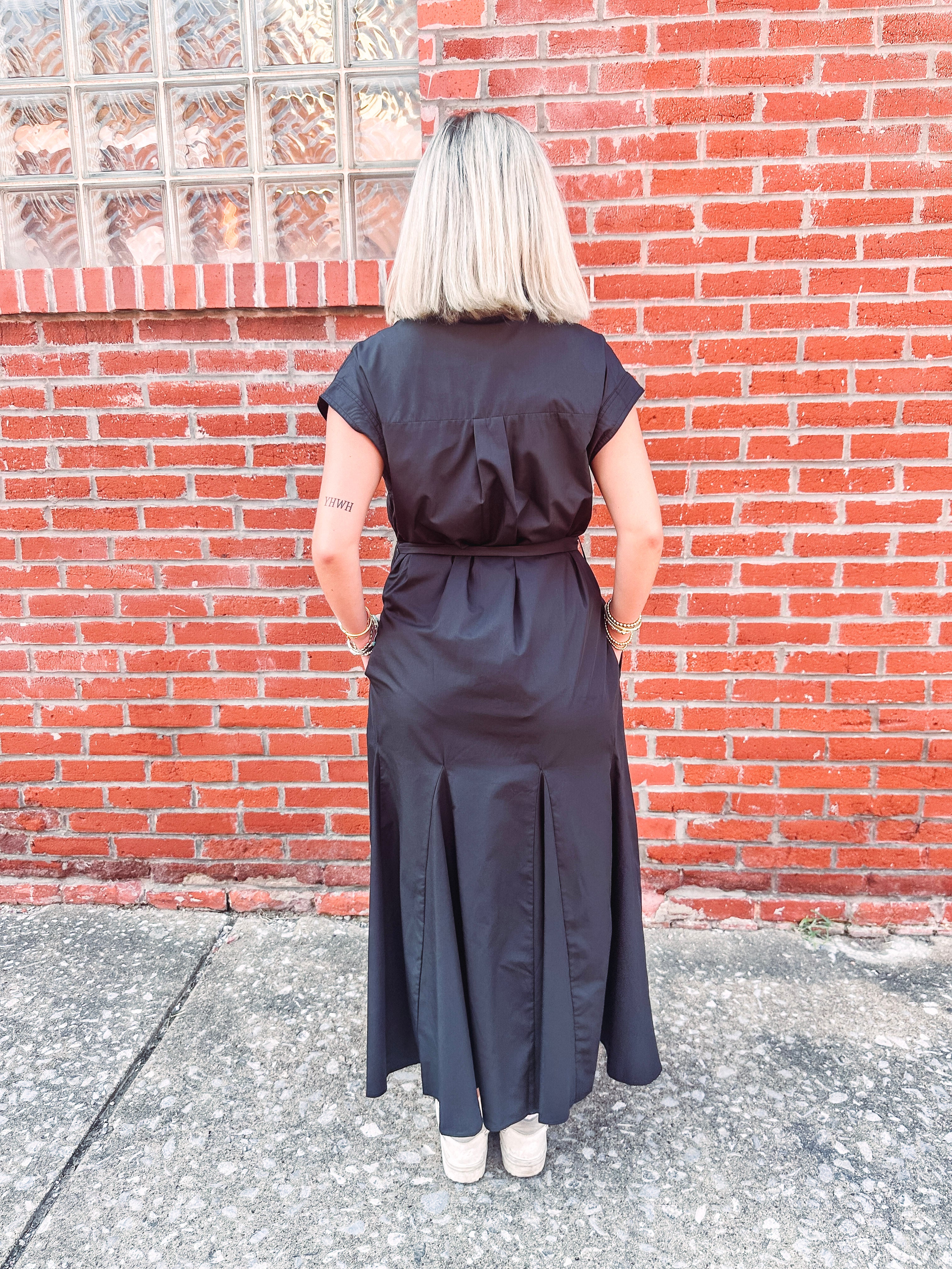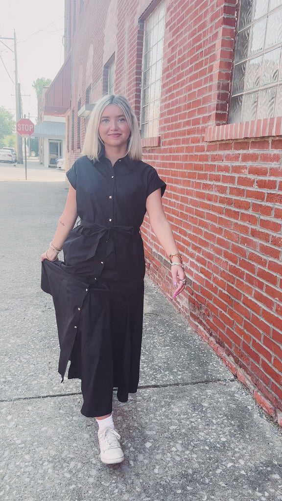 Step into autumn fun and effortless date night style with the Sable Cap Sleeve Dress. This black midi dress features charming cap sleeves, a classic collar, and a long button front that adds a touch of vintage flair. Practical pockets keep essentials close, while the belted waist flatters your silhouette for a playful yet polished look. Perfect for crisp evenings and spontaneous adventures.