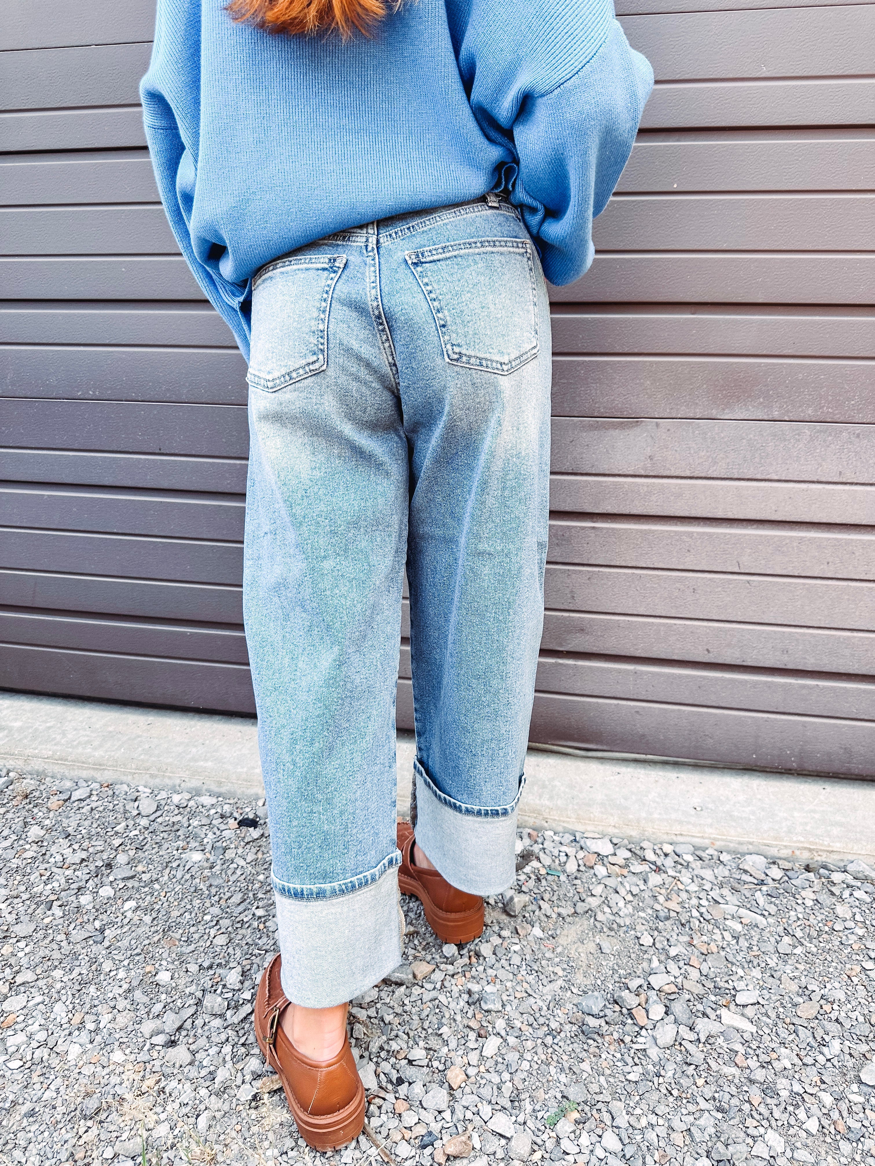Step into effortless style with our Mid Rise Cuff Barrel Denim. Featuring an 11" rise and a 26" inseam, these playful jeans flare just right with an 11" opening, accentuated by a cool cuffed finish. Perfect for adding a fun twist to your everyday look!