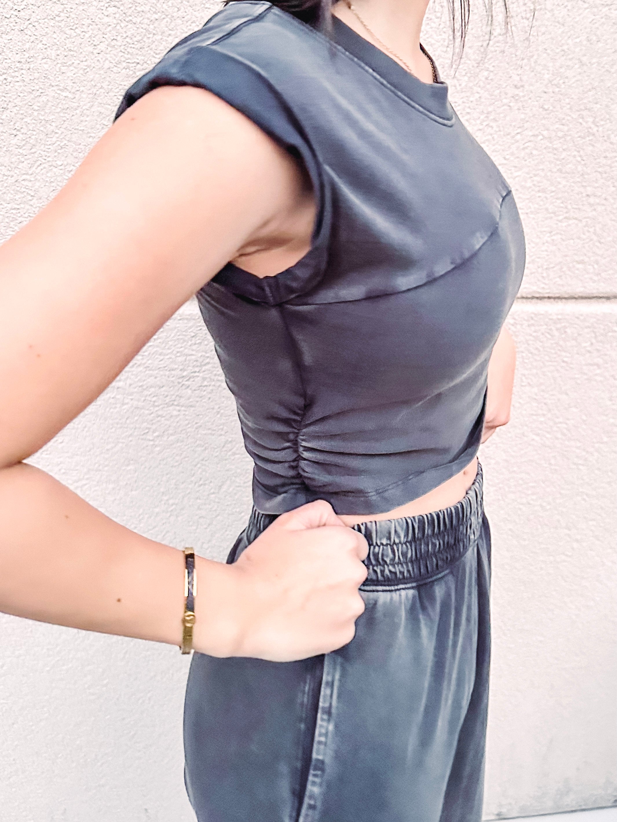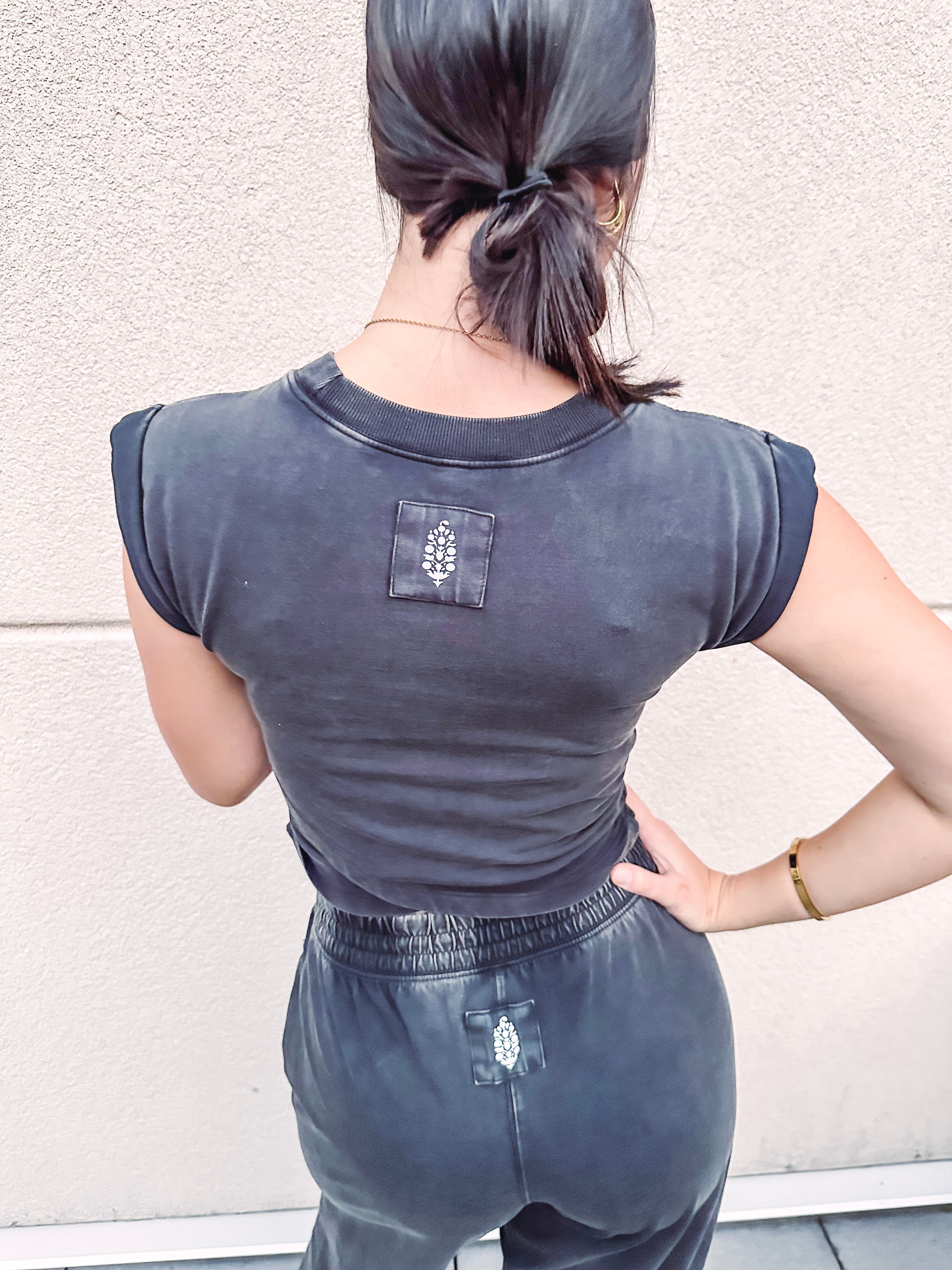 Throw on this effortlessly cool set and you're ready for anything—gym, errands, or just vibing at home. The cropped muscle tee features a chic crossover detail and ribbed collar, while the high-rise wide-leg pants deliver that perfectly lived-in vibe with side seam pockets. Crafted from super soft jersey fabric with elasticated waistband and cuffs, it's the cozy-meets-stylish combo that works everywhere. Your new go-to for comfort that actually looks put-together.