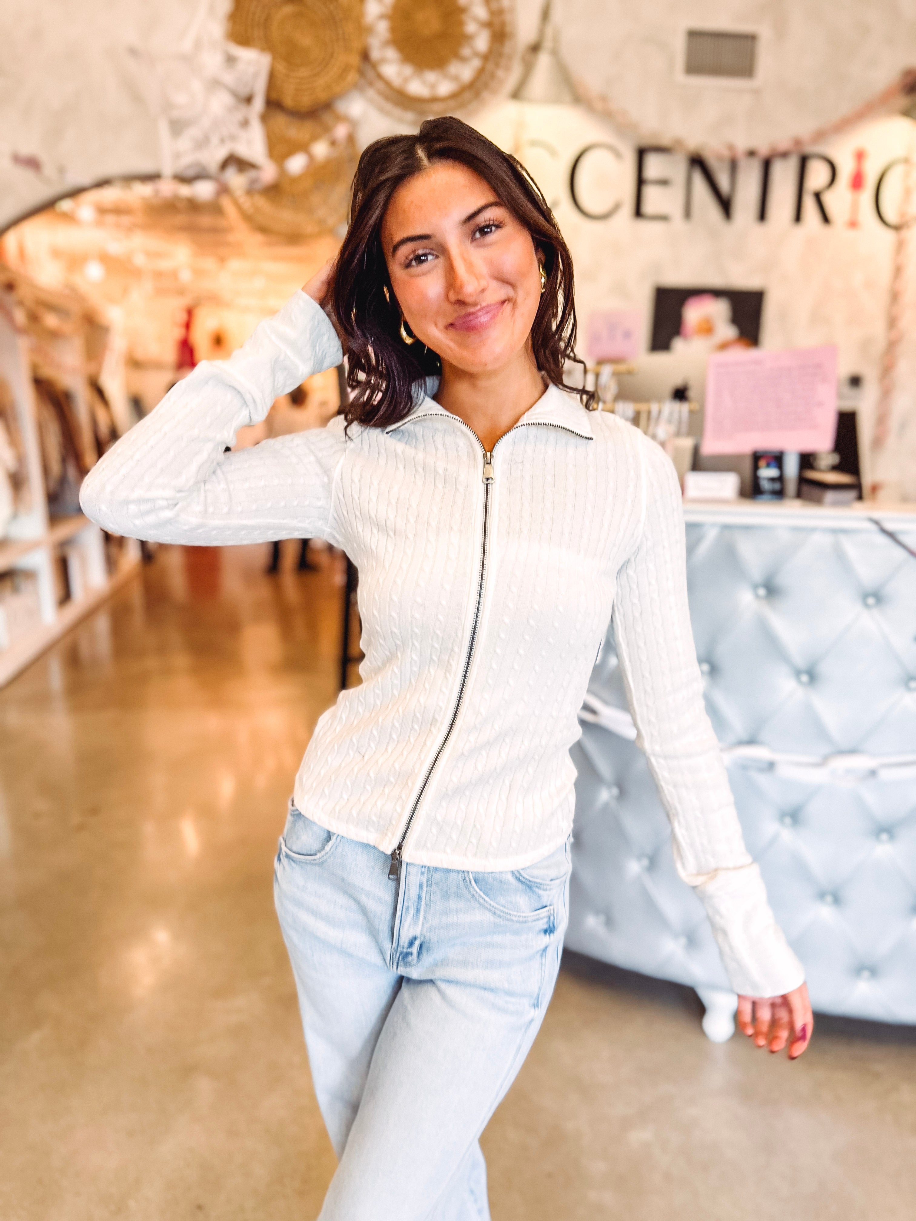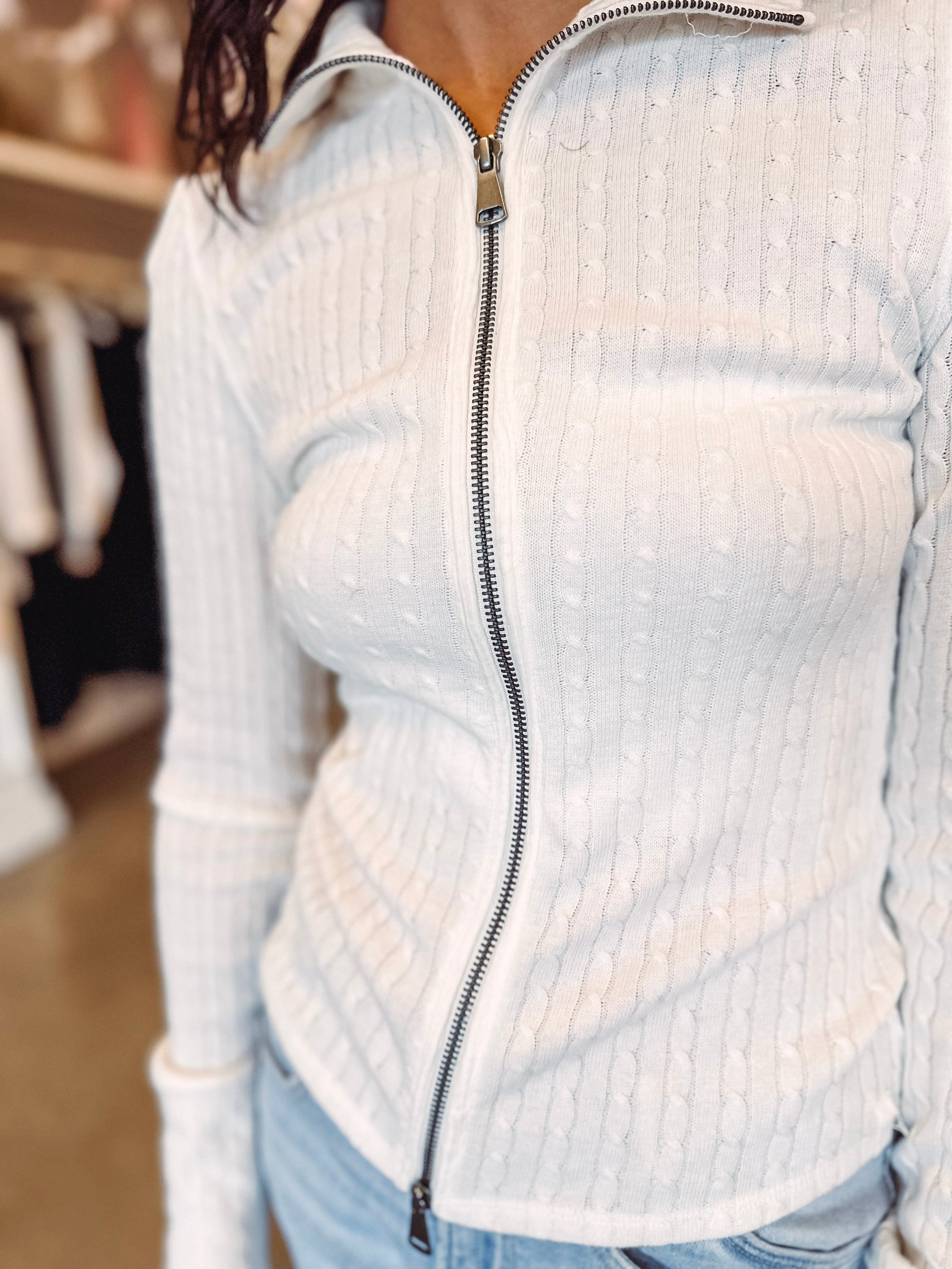 Preppy meets modern in this We The Free zip-up that's ready for anything. The light cable knit keeps things cozy while the two-way zipper lets you style it your way—fully zipped for polished looks or open for layered vibes. Fitted silhouette, collared neckline, and long sleeves make it the kind of piece that works from brunch to casual hangouts. Effortlessly versatile and undeniably chic.