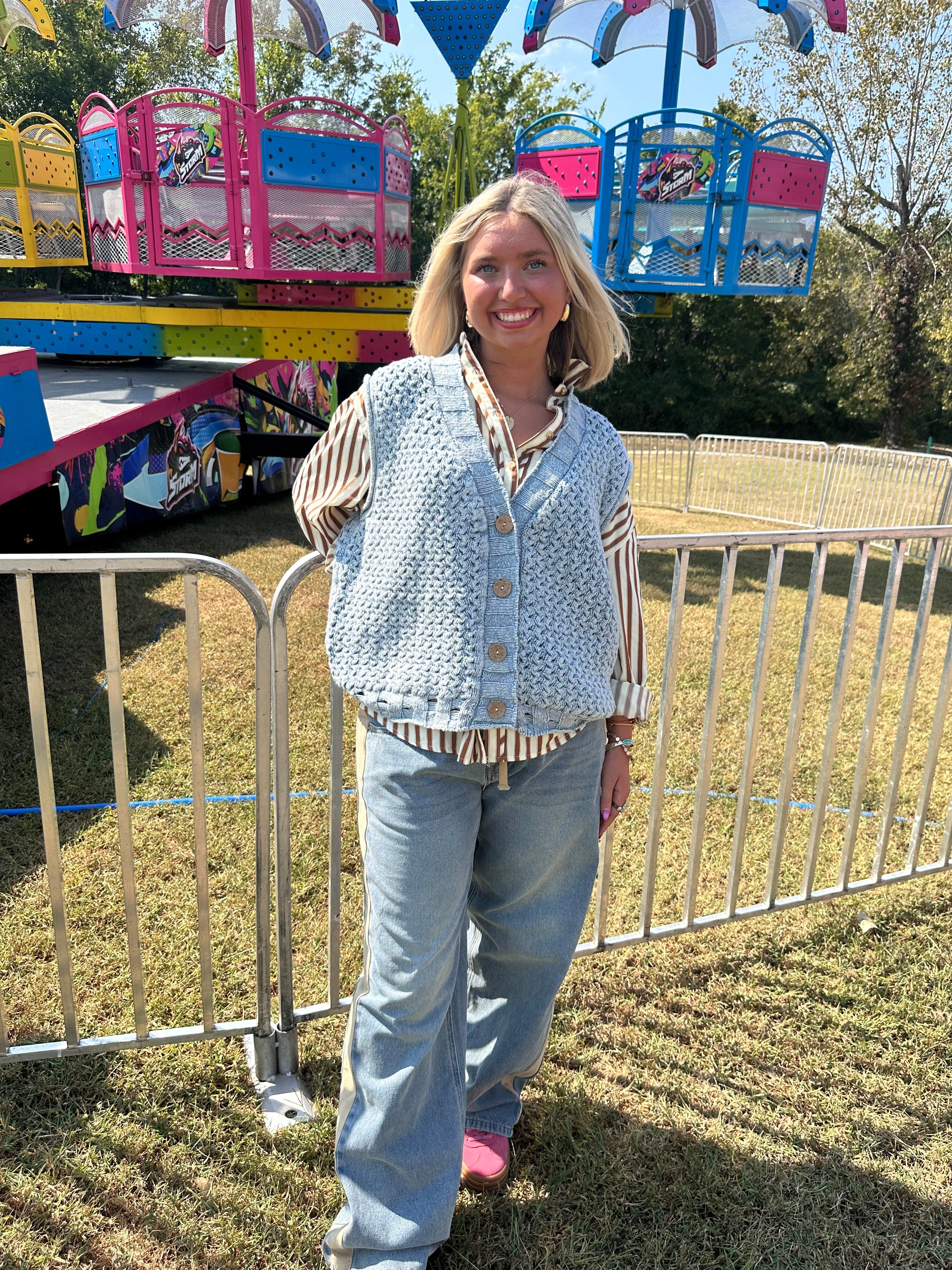 This playful cable knit vest in a trendy blue mineral wash adds a fun twist to your layering game. Its mid-length cut offers just the right amount of coverage, making it perfect for mixing and matching with your favorite shirts or dresses. Cozy up with a touch of texture and color that’s as spirited as you are!