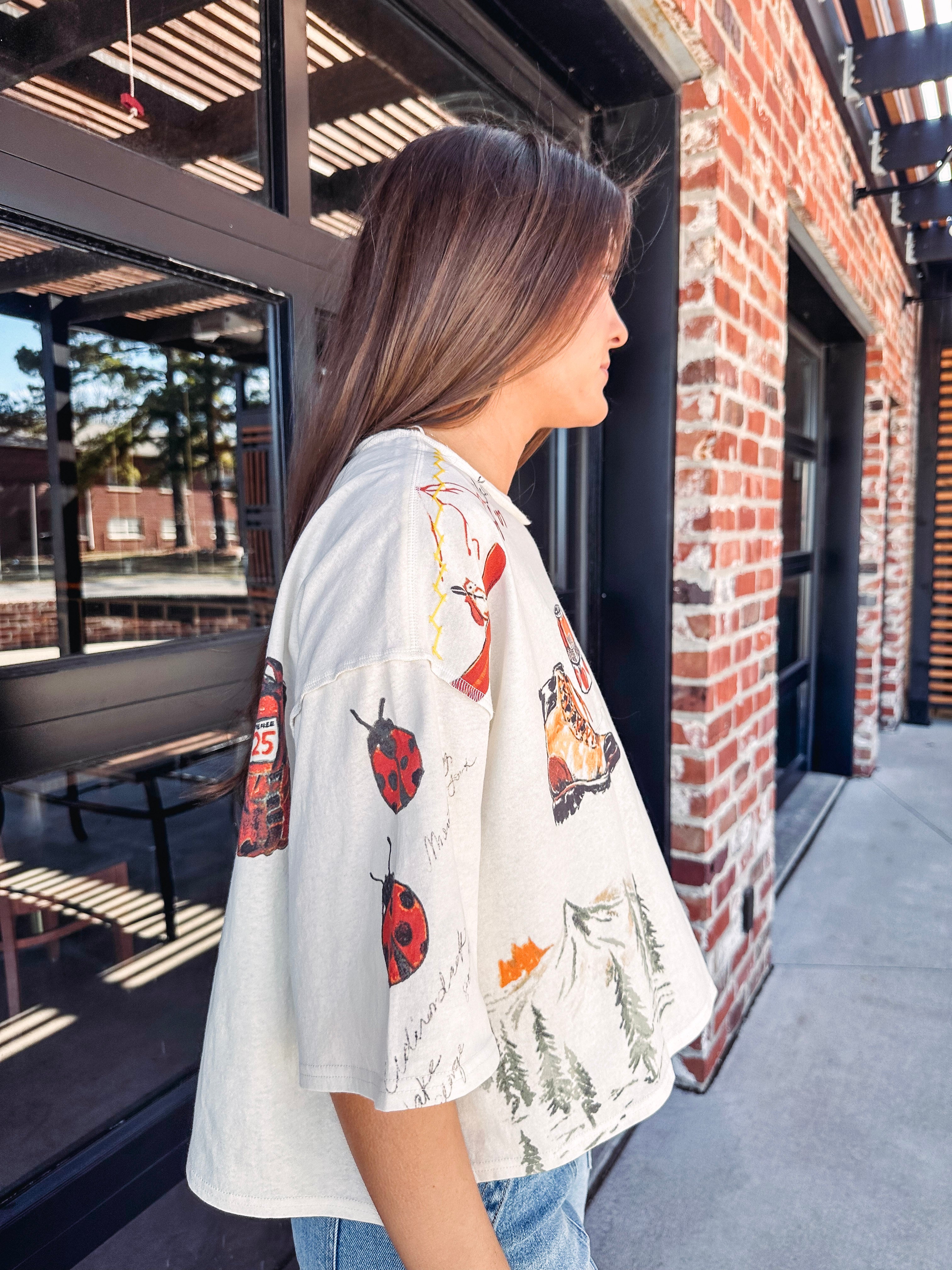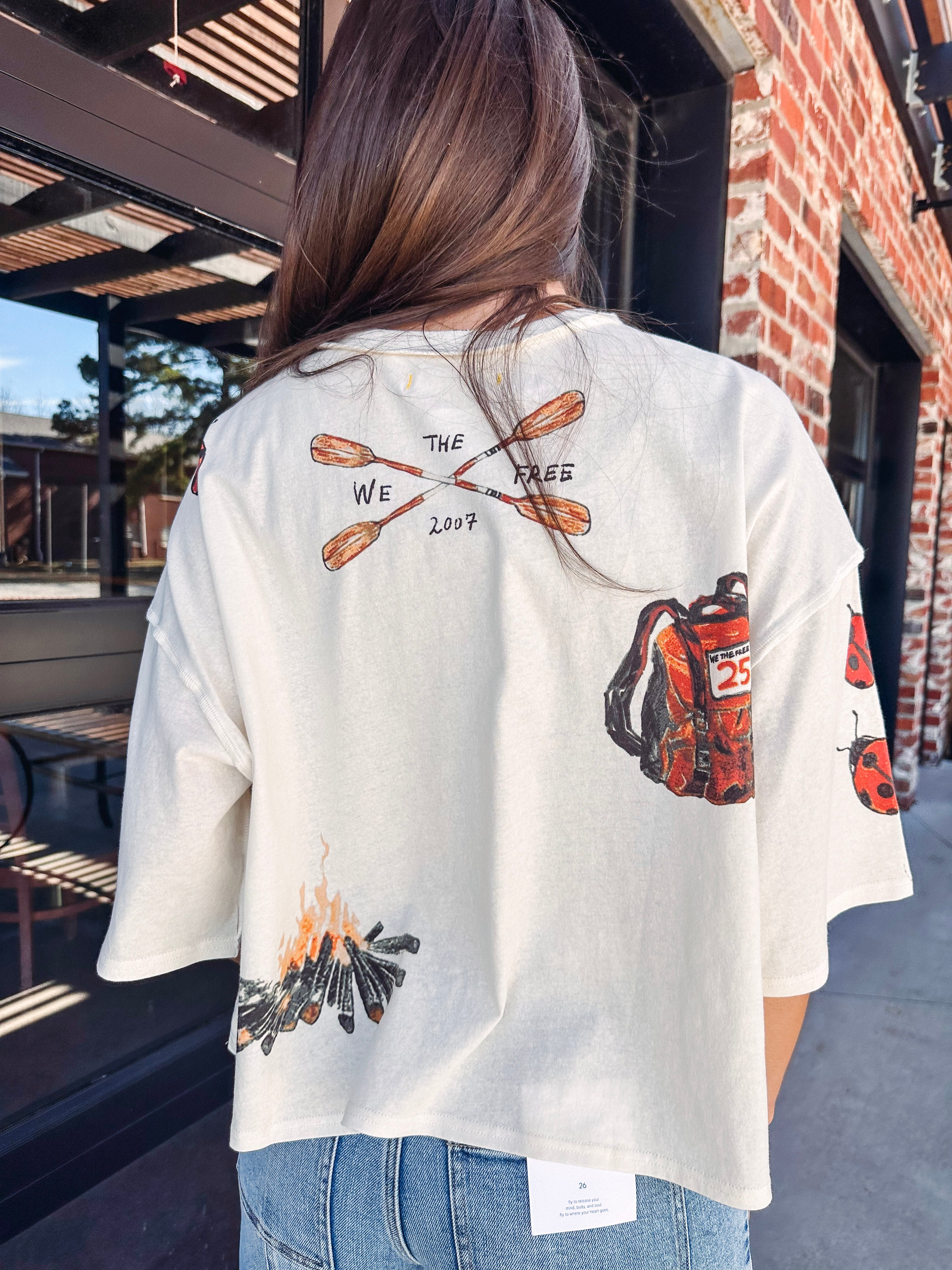 Hit the trail in style with this elevated staple tee from our We The Free collection. Crafted from lightweight cotton, it features a boxy, slightly oversized fit with dropped shoulders and a cropped length that's perfect for layering or wearing solo. Camp-inspired graphics bring a folksy, adventurous vibe to your everyday rotation. Complete with a classic crew neckline and short sleeves, this tee is your go-to for weekend wanderings and laid-back days.