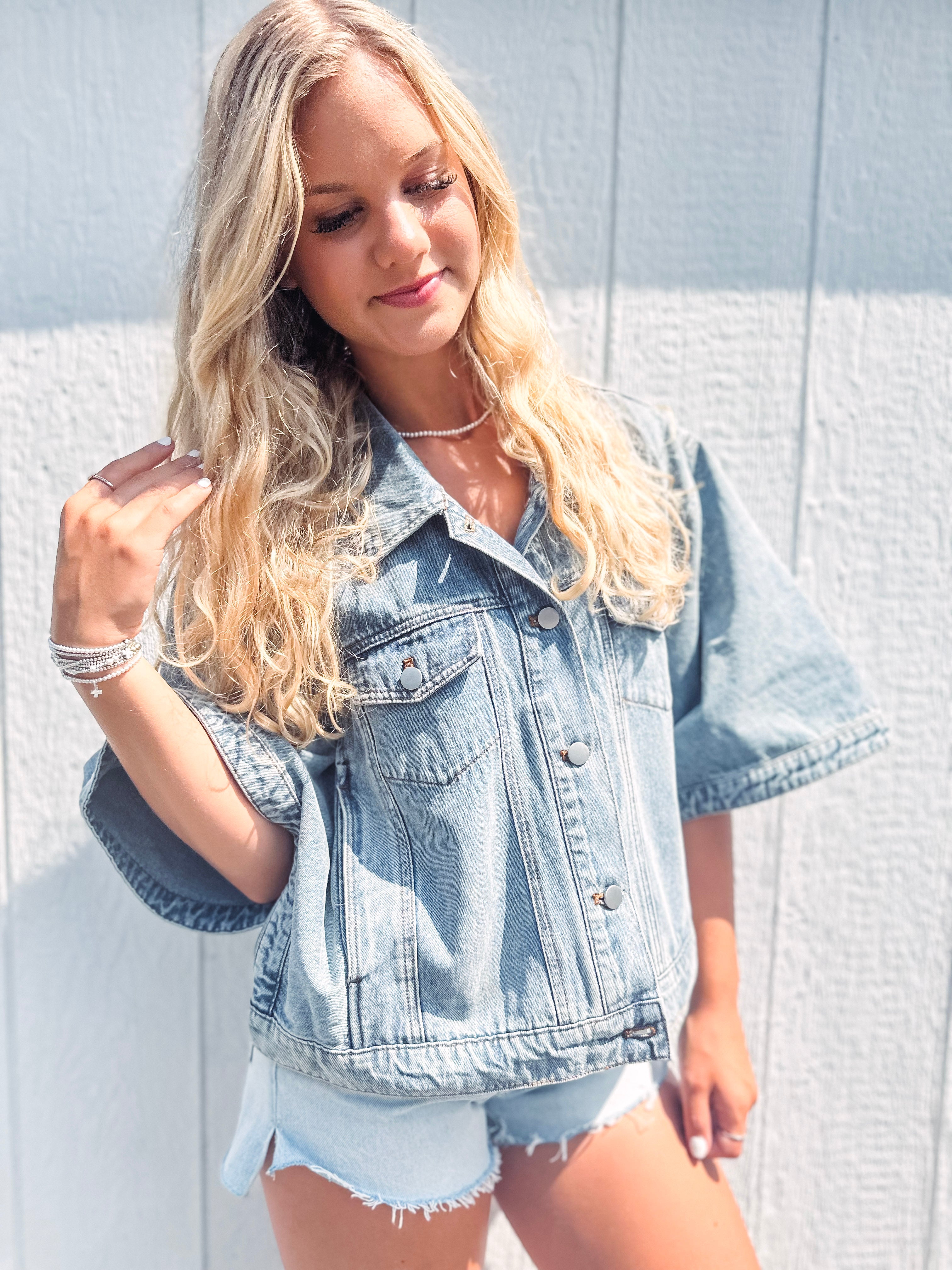 Add a playful twist to your wardrobe with the Indigo Girl Cape Style Denim Jacket. Featuring a fun swing silhouette and breezy 3/4 sleeves, this jacket reimagines the classic denim look with a unique, carefree vibe perfect for layering and making a statement wherever you go.