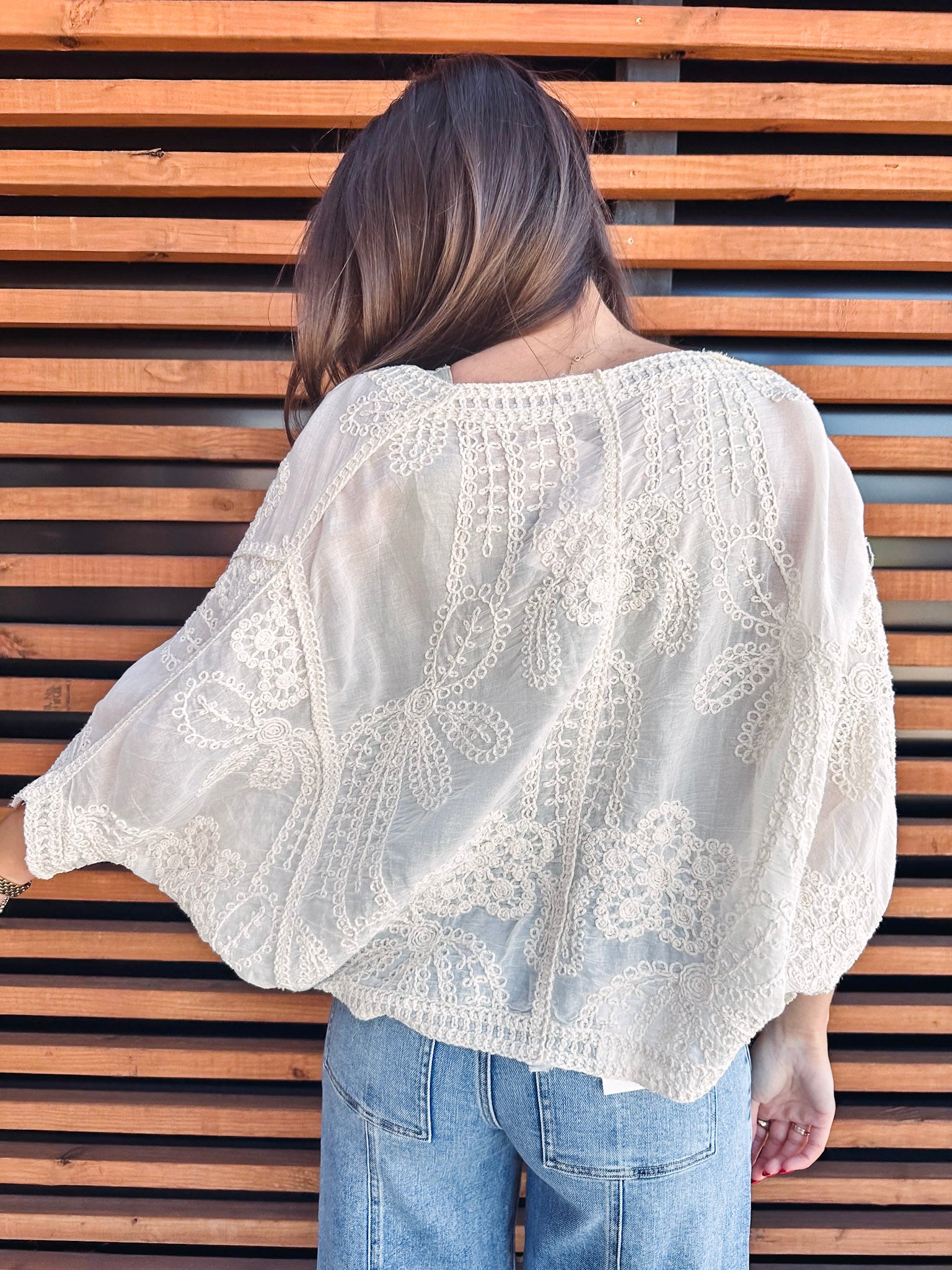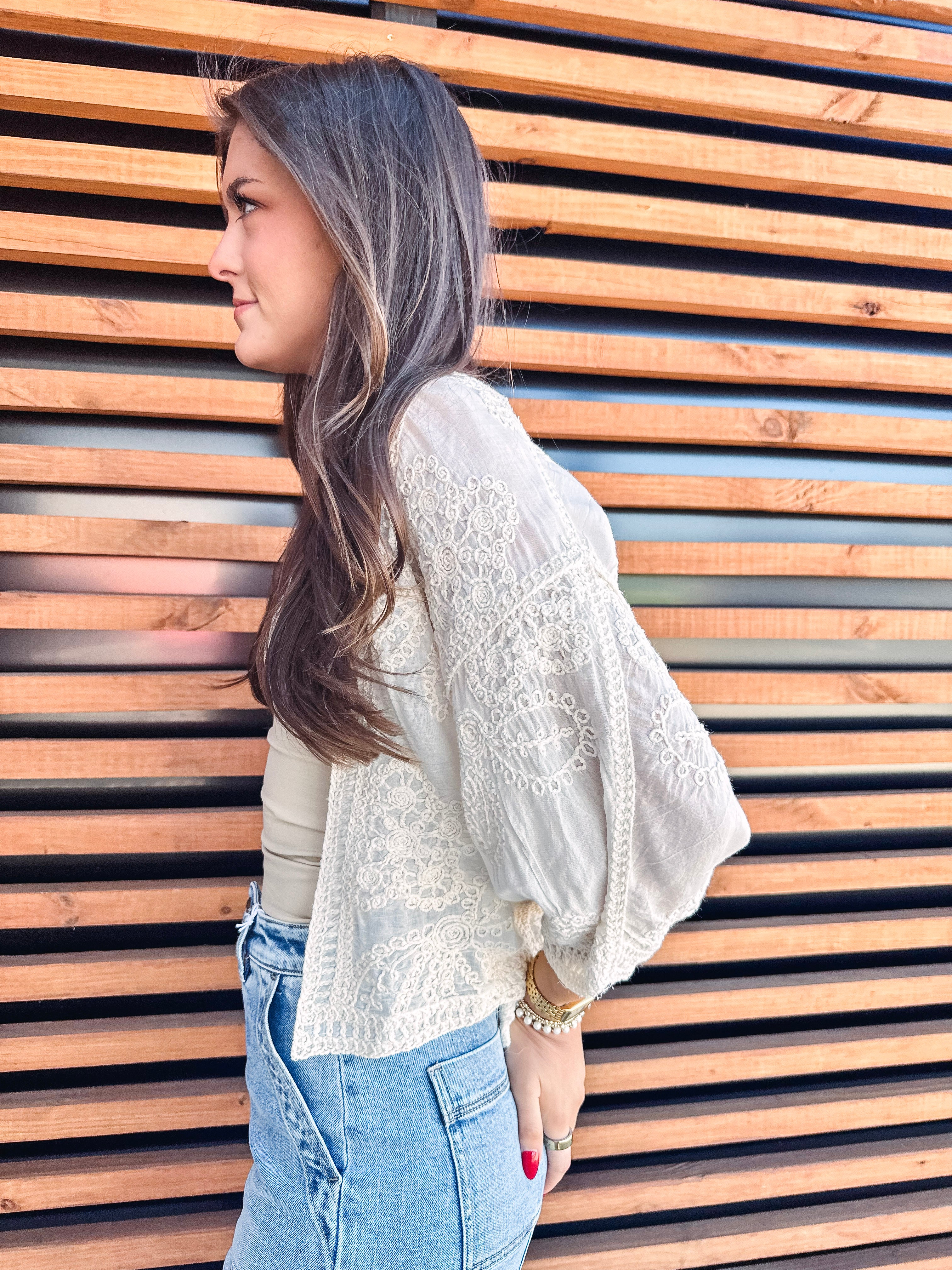 Slip into vintage-inspired charm with the Mona Cardigan, a cropped beauty in soft ivory that's anything but ordinary. Delicate paisley appliqués dance across the fabric, while dramatic batwing sleeves add a touch of whimsical flair. Perfect for layering over your favorite tees or dresses, this playful piece brings nostalgic elegance with a modern twist. Effortlessly chic and endlessly versatile.