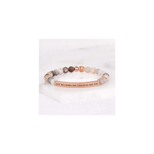 • Inspire Me Bracelets are beautiful reminders that are crafted with earth stone beads and featuring a message of inspiration engraved on a stainless-steel bar.  Wear them throughout the day to fill your mind with inspiration.