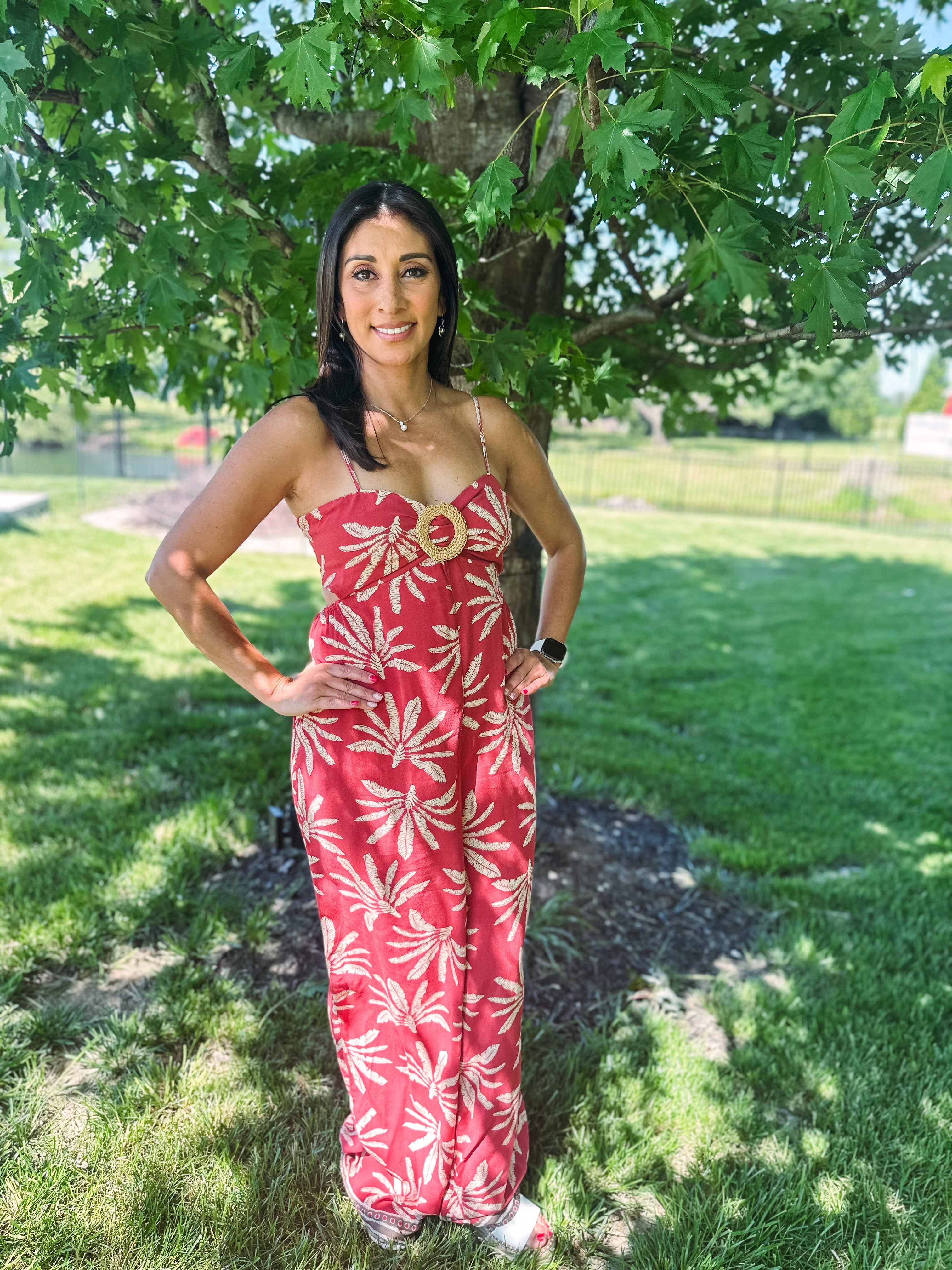 Let your wild side out on vacay with our Palm Island Printed Crepe Jumpsuit! This bold red jumpsuit features a playful palm tree print and a fun open back, perfect for dancing the night away. Don't be afraid to let loose and have some fun!