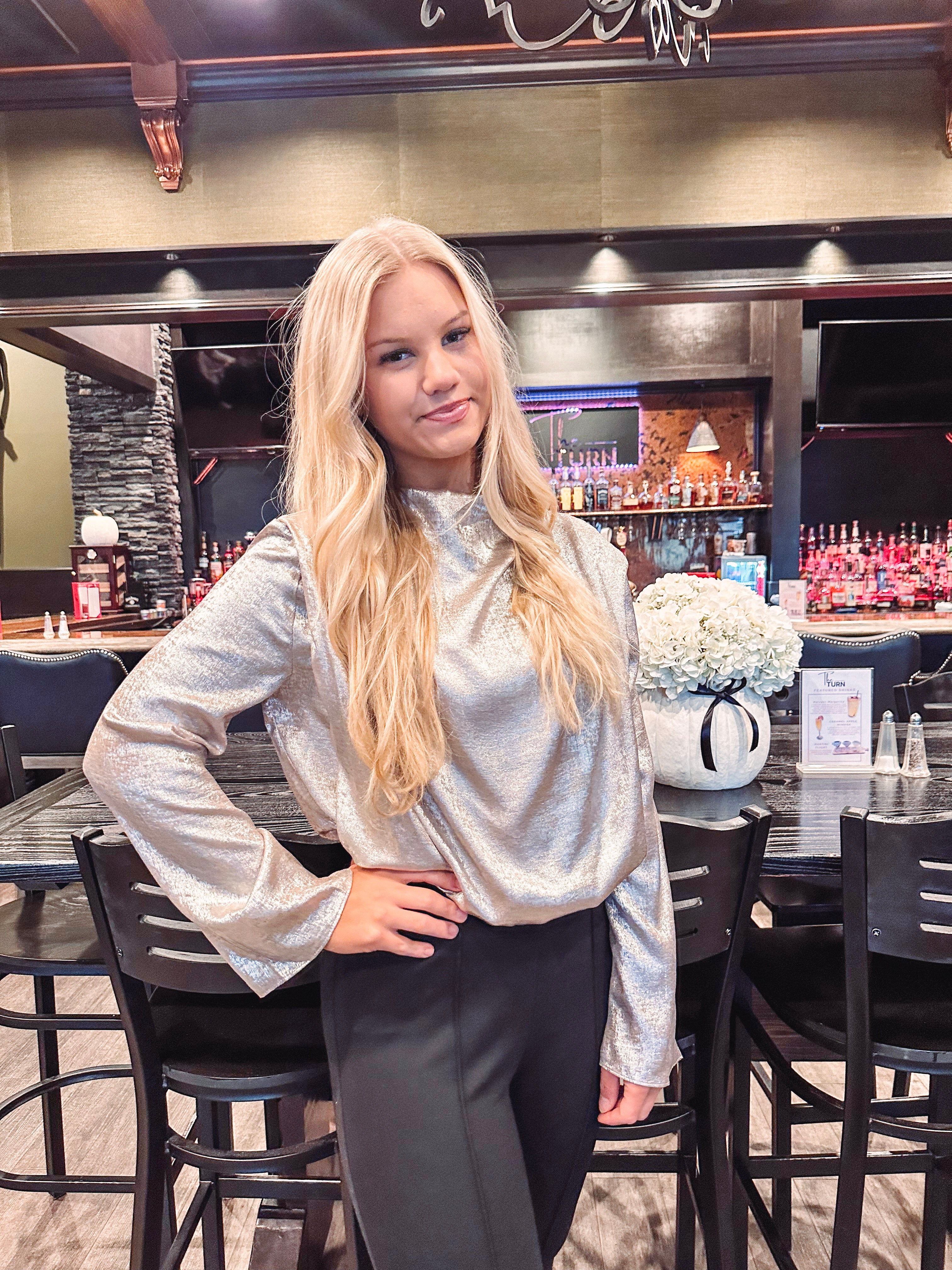 Elevate your date night style with the Lenore Gold Metallic Crop Shirt. Featuring a chic mock neck and wide sleeves, this top shimmers with gold fleck metallic detail. The gathered bottom adds a fun, flirty touch, making it the perfect statement piece to sparkle all evening long.