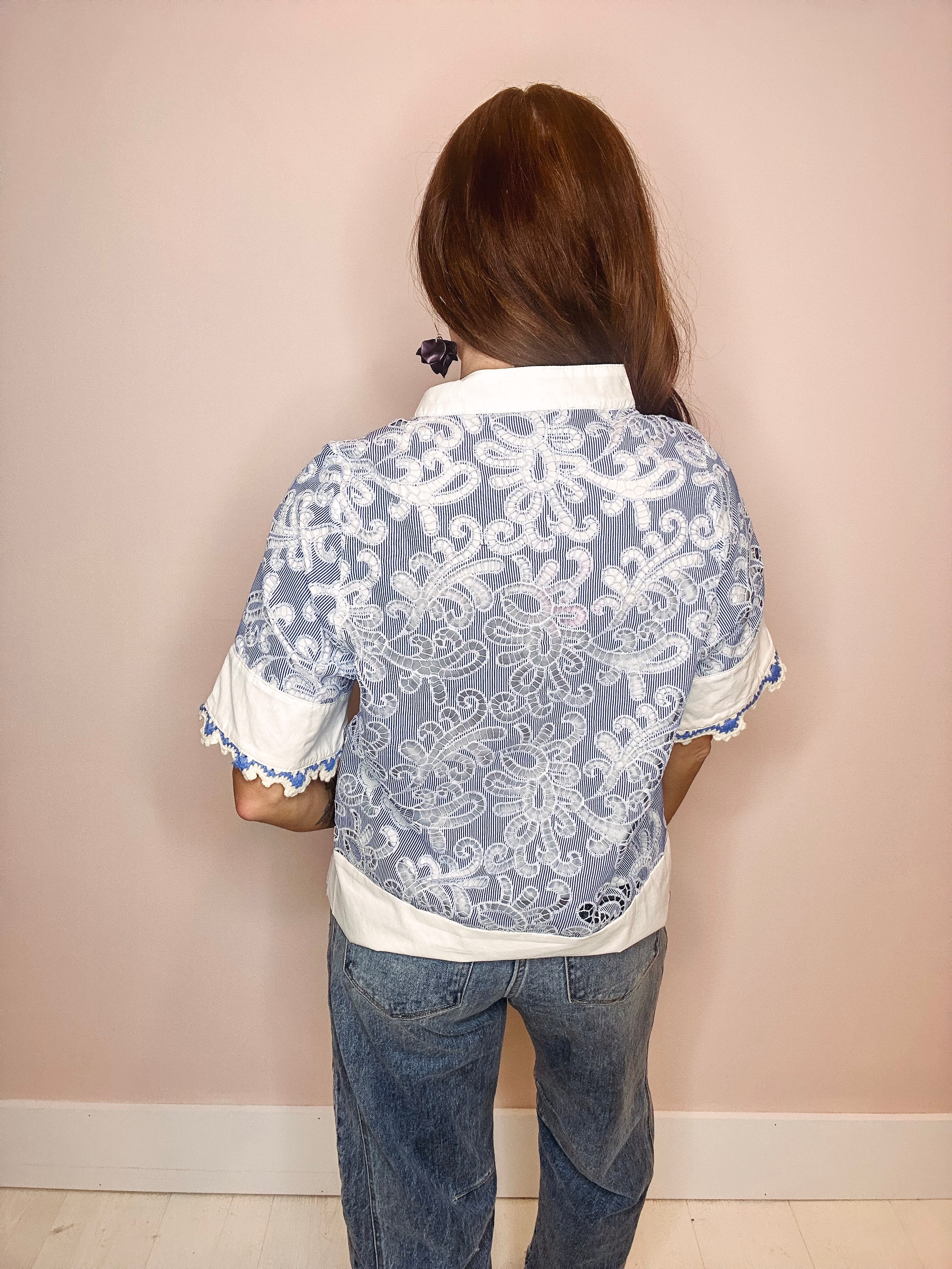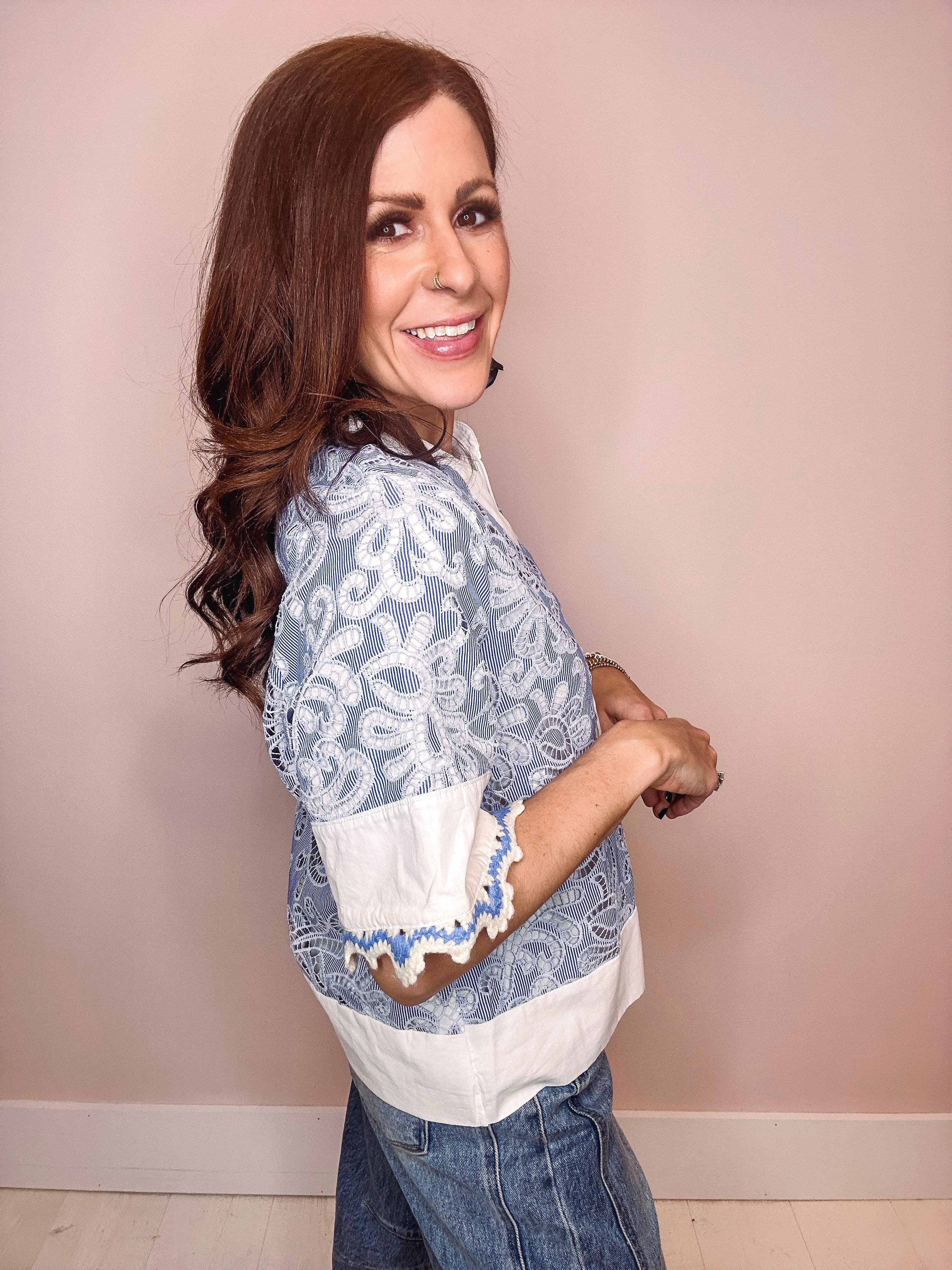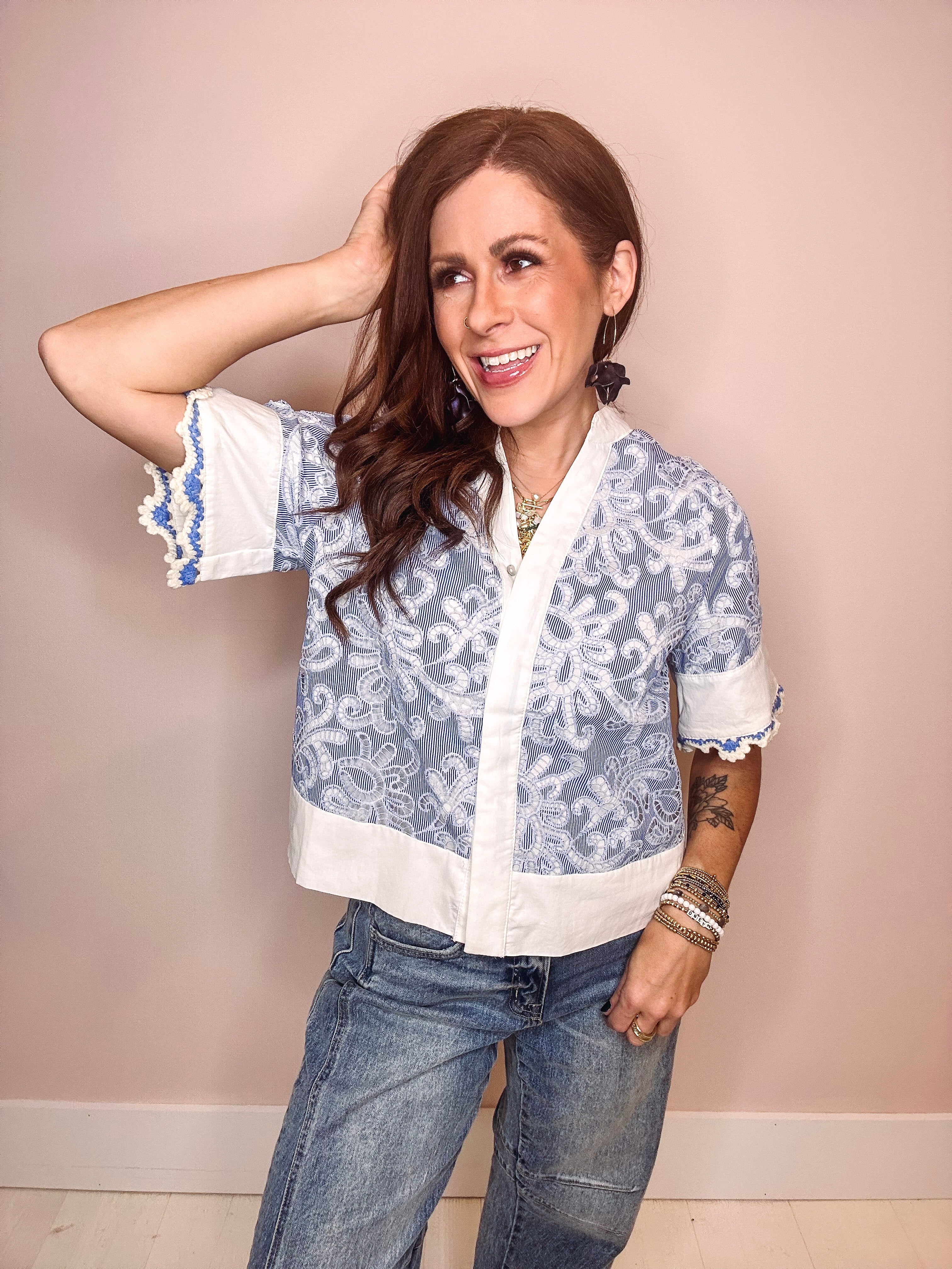 Effortless elegance meets delicate detail in this charming short-sleeve top. The split neckline showcases intricate blue broderie anglaise, adding a touch of vintage-inspired sophistication. Scalloped hem detailing completes the look with refined femininity. Perfect for layering or wearing solo, this piece transitions seamlessly from casual to dressed-up occasions.