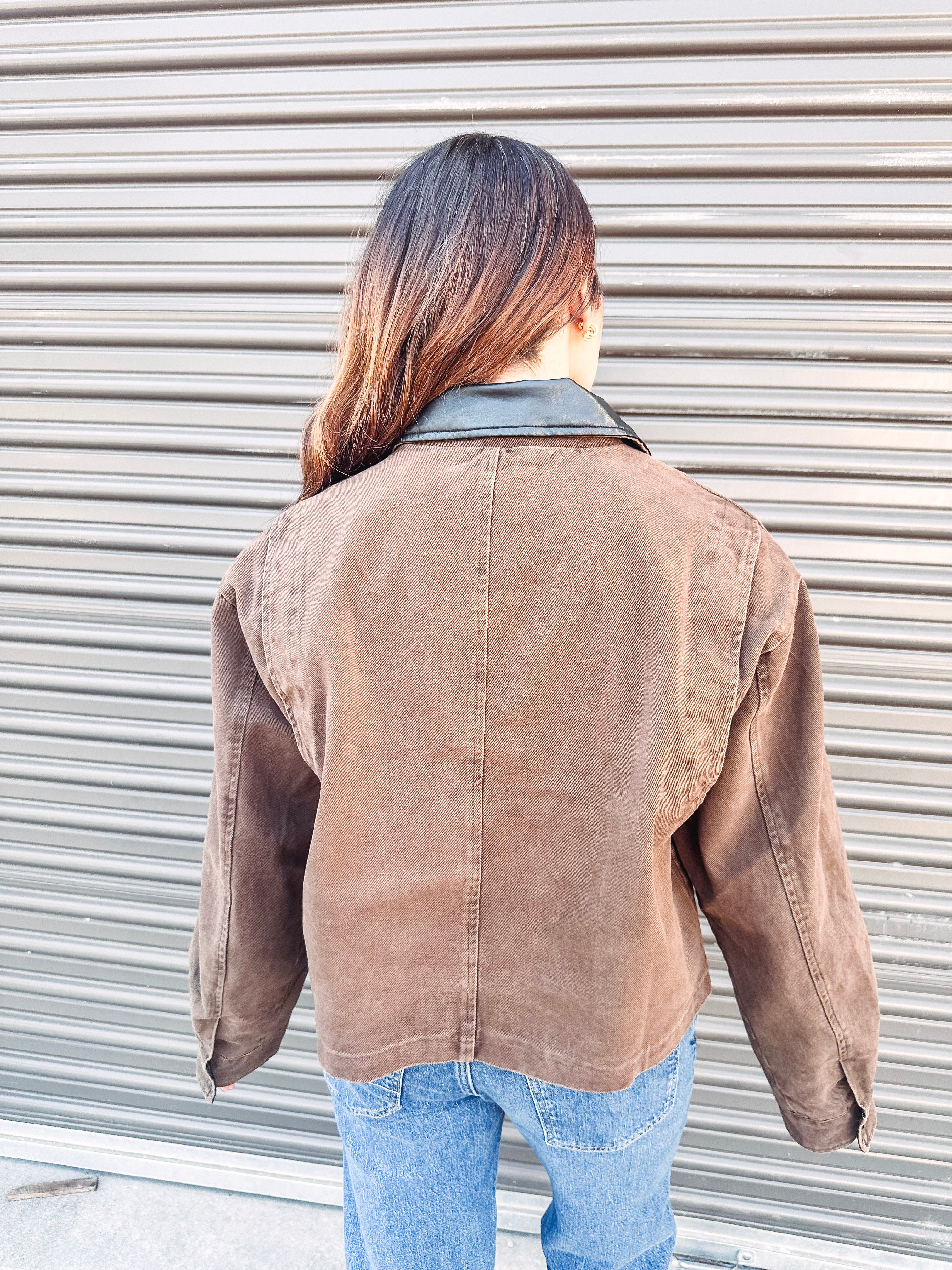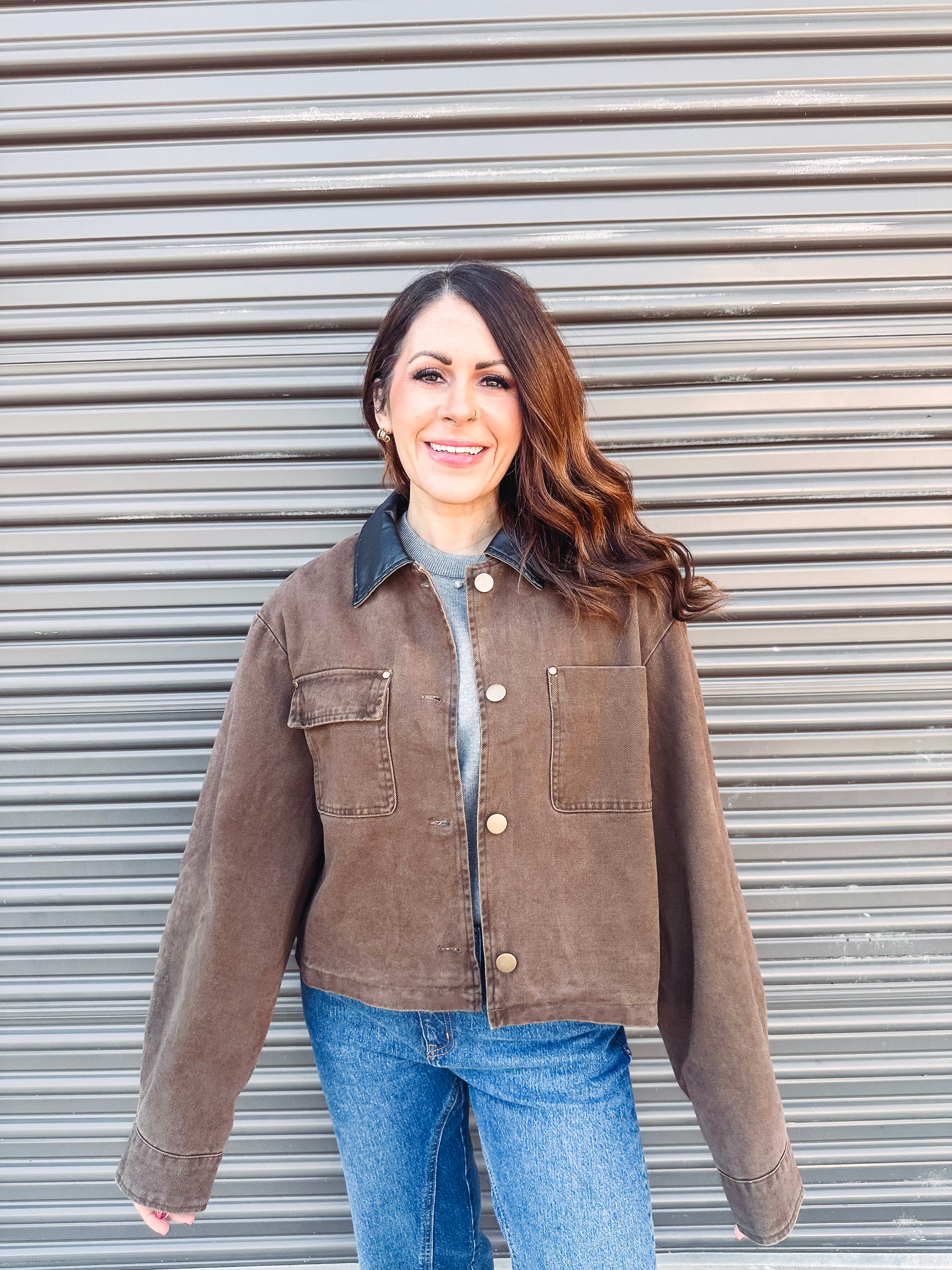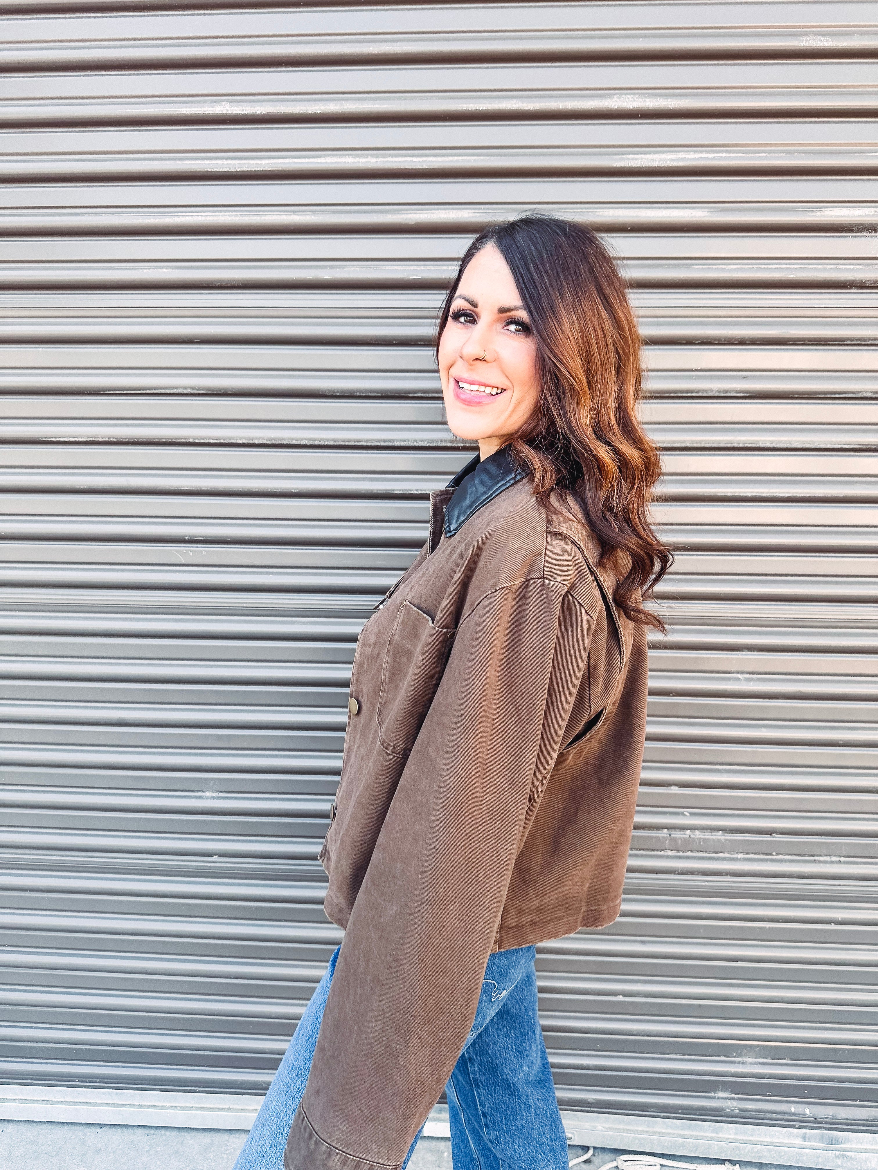 This cocoa cropped jacket with button front and leather trim brings playful style to your outerwear game. Its trendy design pairs perfectly with any look, making layering fun and fashionable. Step out in confidence with this chic, on-trend piece that’s as stylish as it is versatile.