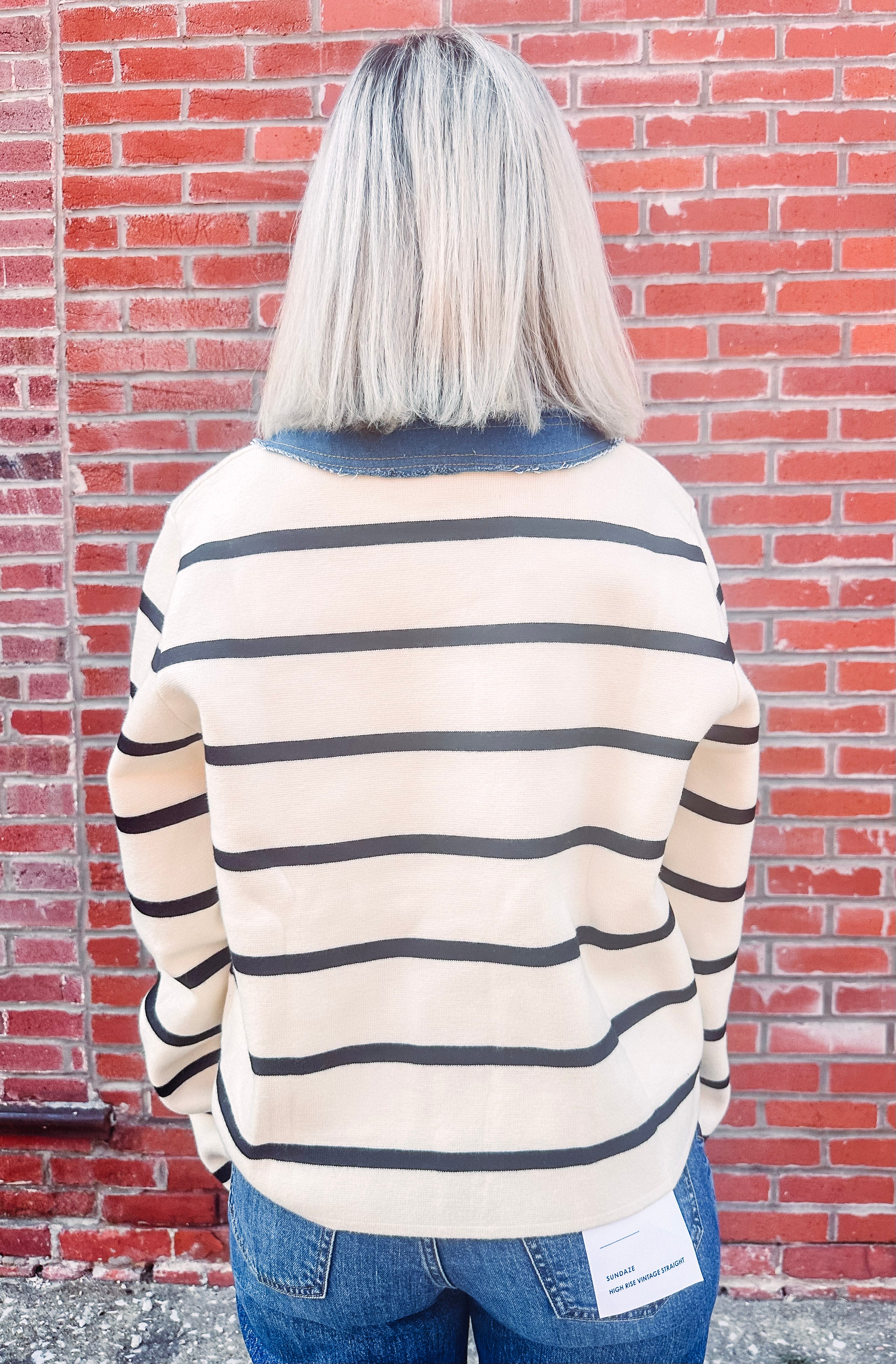 This cozy long-sleeve knit features a fun stripe pattern and a standout denim-accented neck band for a touch of edge. With patch pockets and a handy front button closure, it’s perfect for stashing your essentials or showing off your style. Midweight and non-sheer, it’s comfy enough for casual dinners and polished enough for workdays—your new go-to for versatility with a playful twist!