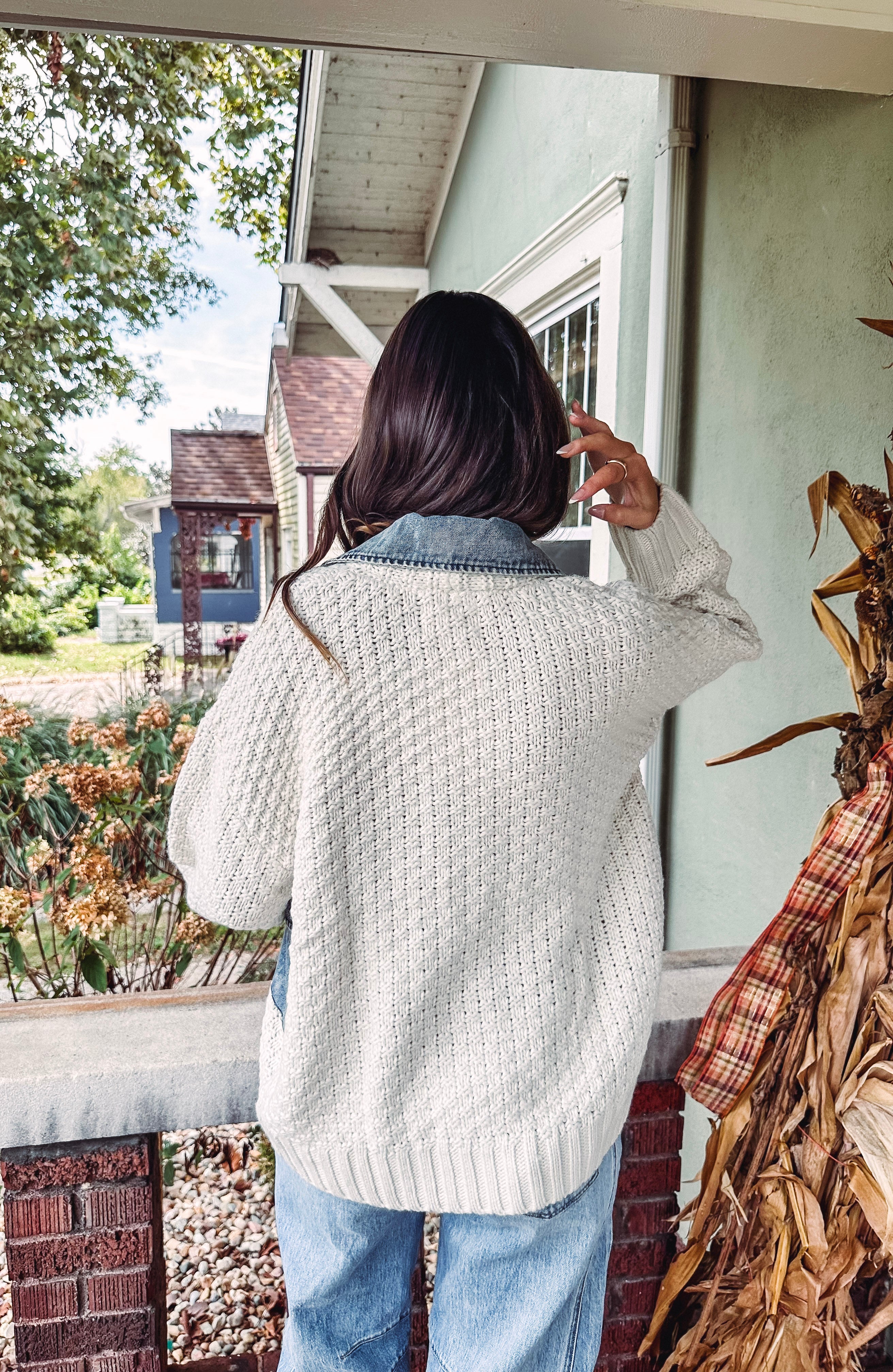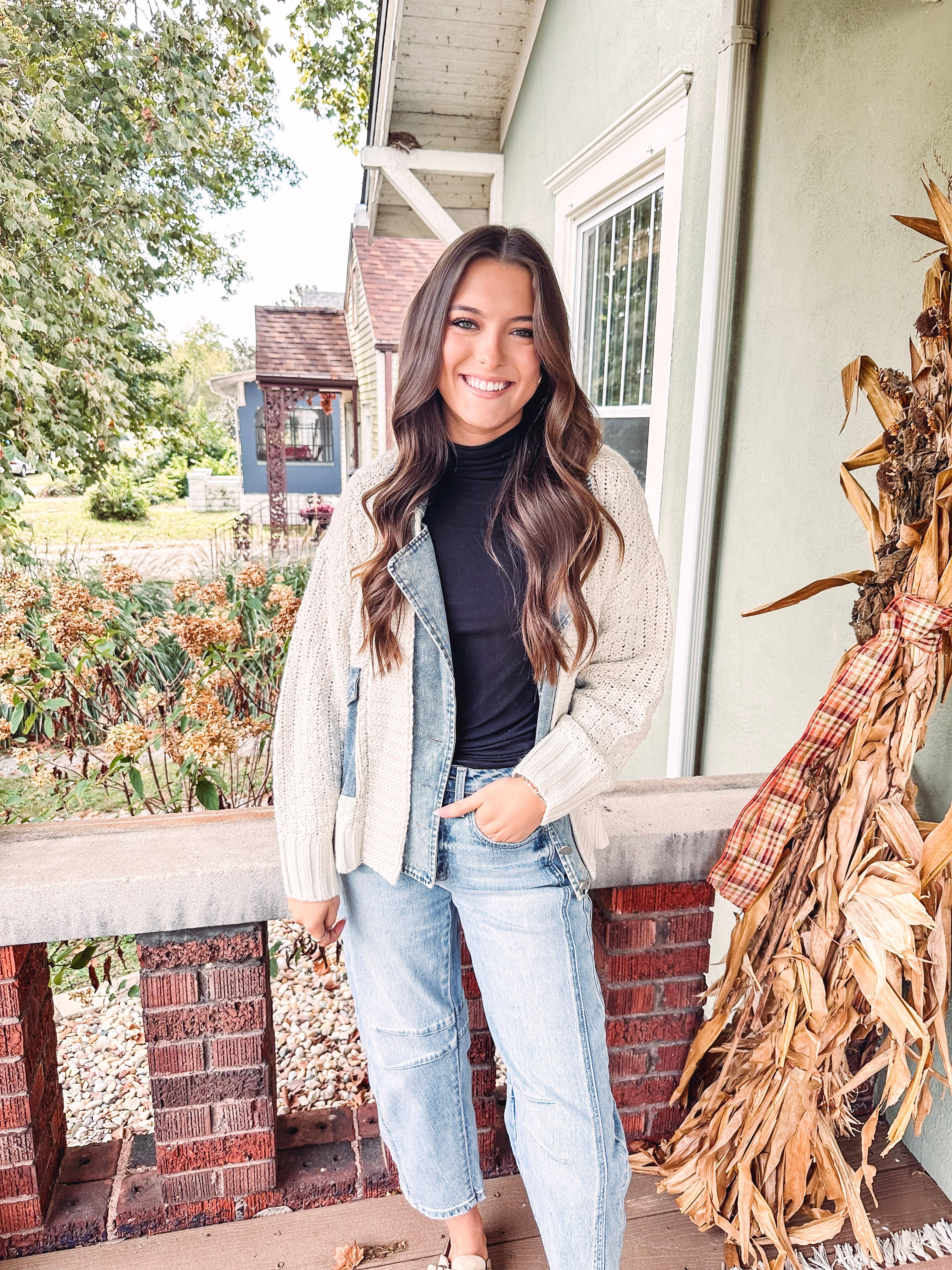 Stay cozy and stylish with the Whitley Mixed Media Cable Knit Jacket. Featuring a playful blend of large cable knit fabric and denim-trimmed pockets, this collared jacket buttons up for easy layering. Perfect for adding a charming touch to any outfit while keeping you snug and comfortable.