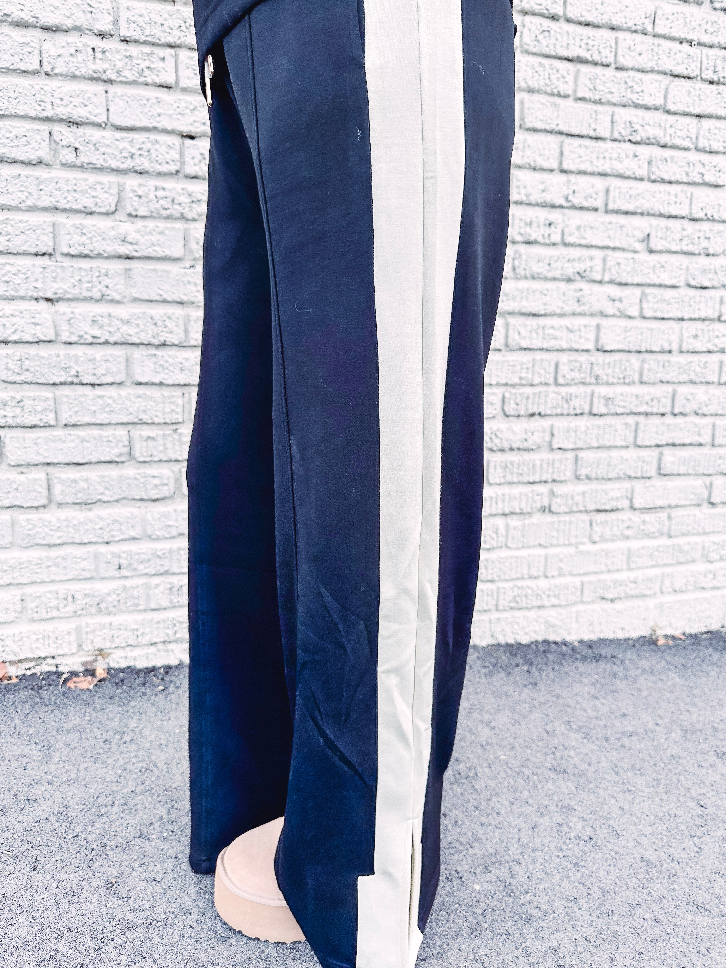 Slip into the Edith Relaxed Athleisure Pants for an effortlessly cool vibe. Featuring a sleek seamed front and a bold white stripe down the side, these wide-leg, long pants bring a sporty twist to your comfy days. Perfect for lounging or low-key outings, they combine relaxed comfort with standout style.