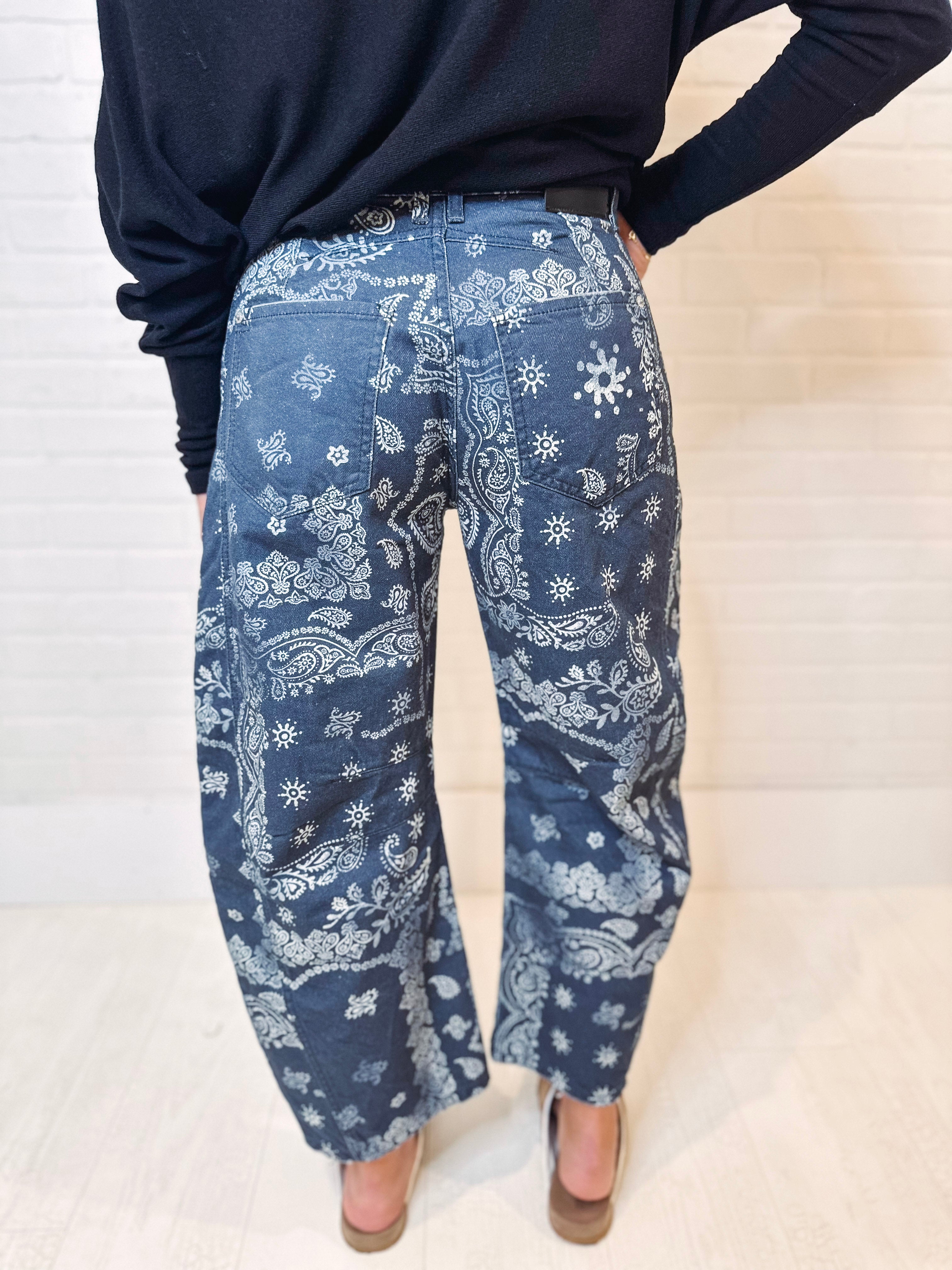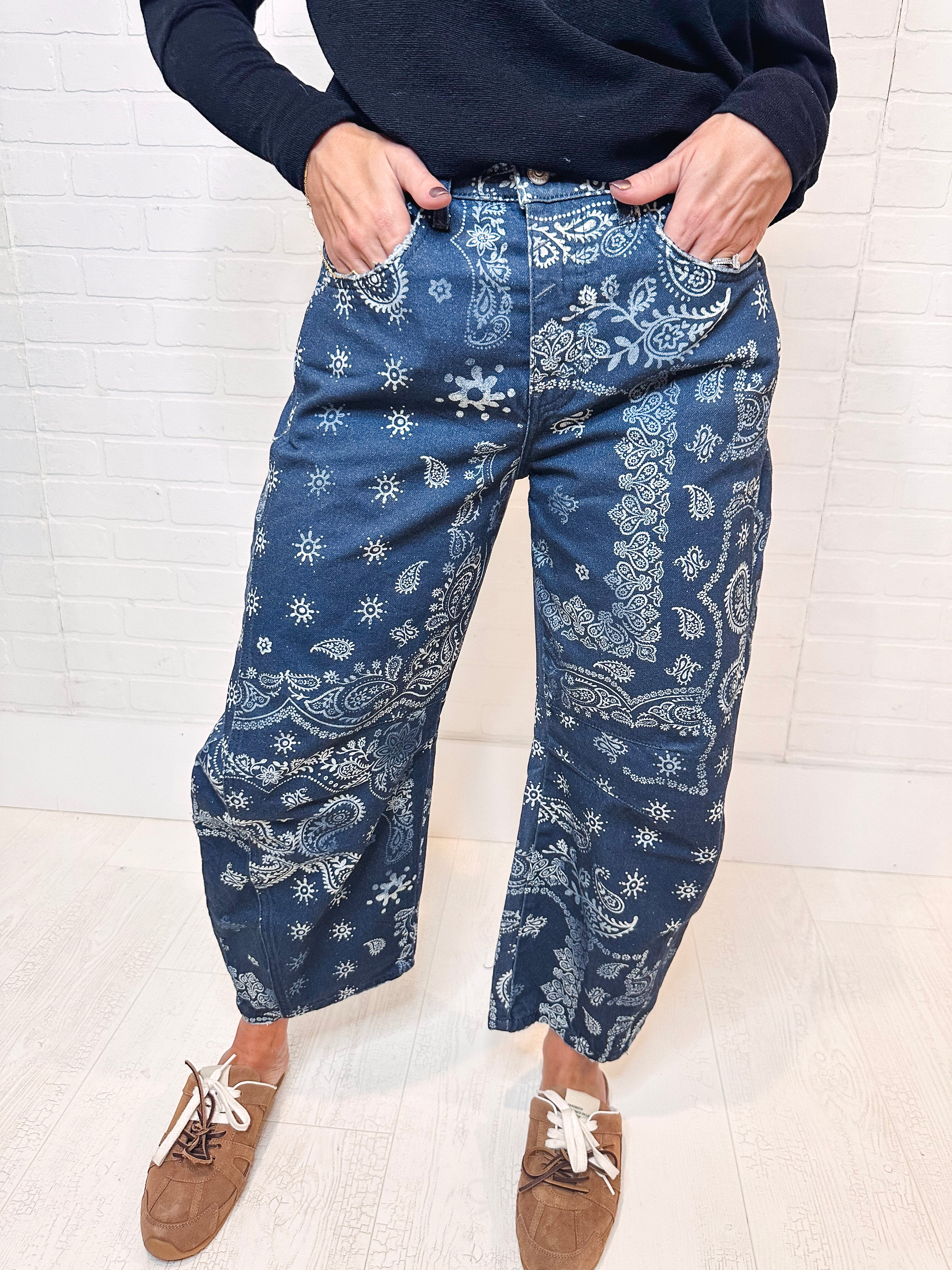 Free People Good Luck Printed Barrel Jeans--Navy Bandana