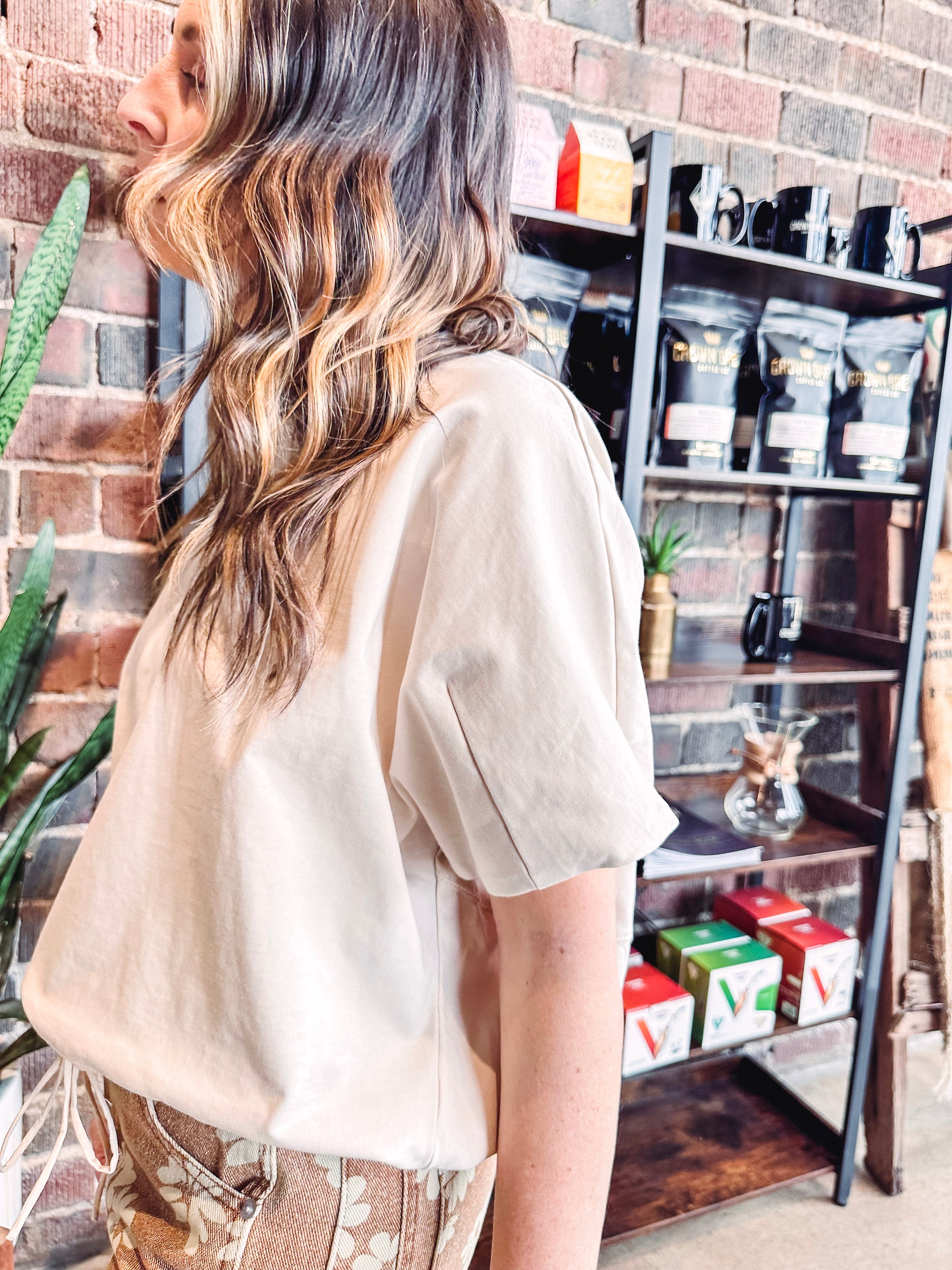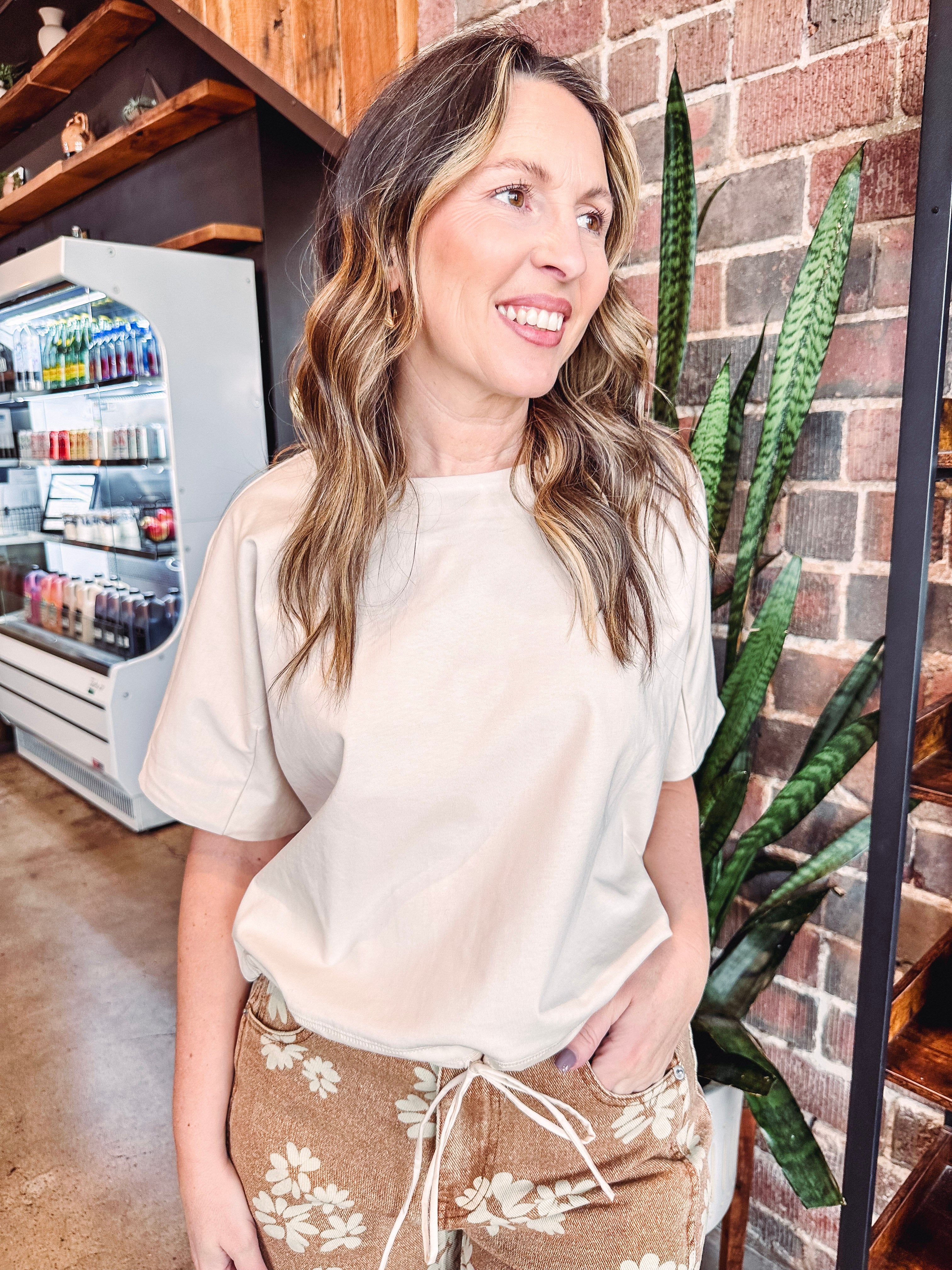 Elevate your everyday look with the Reya High Low Hem Top in creamy perfection. Featuring a playful tie waist detail and a flattering high low hem, this short-sleeve, round-neck tee adds a fun twist to your outfit. Perfect for layering or wearing solo, it’s your new go-to for effortless style with a dash of charm.