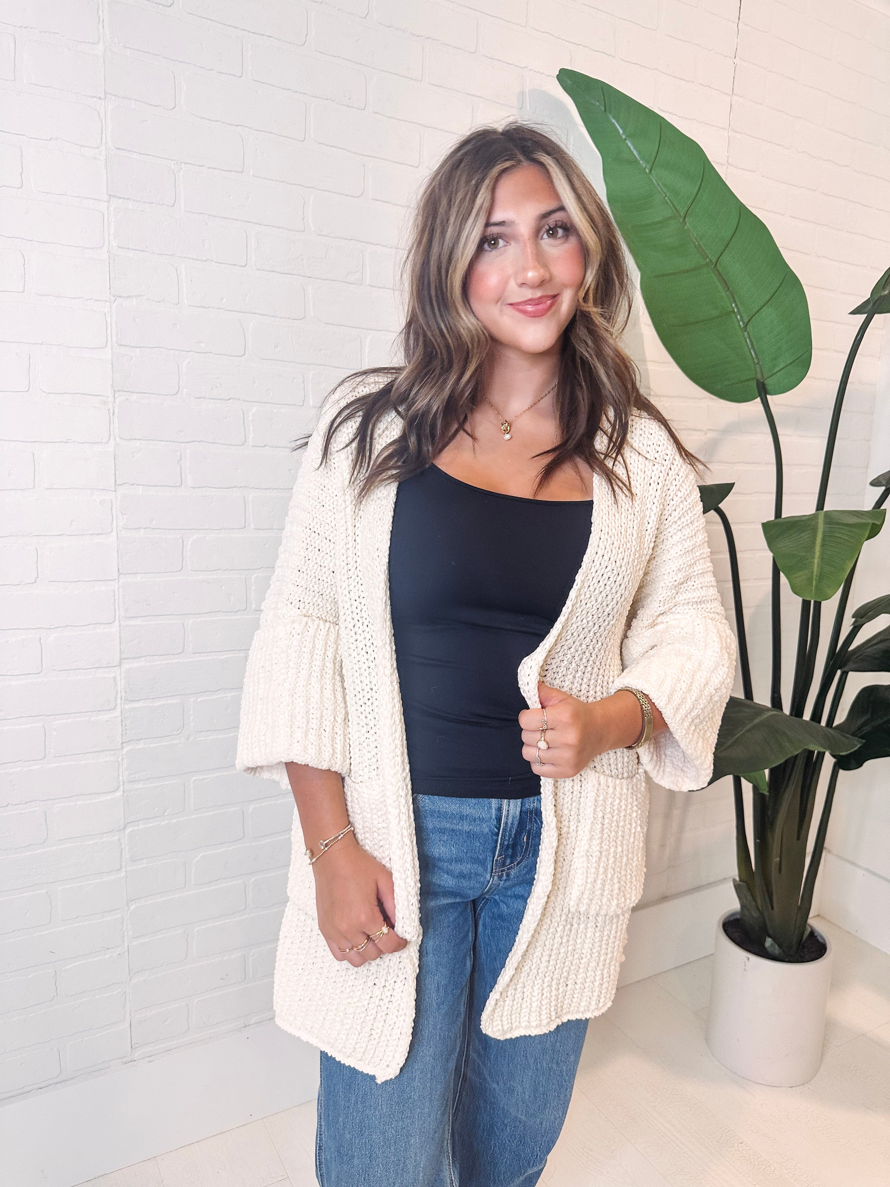 Wrap yourself in cozy charm with this chunky chenille cardigan in a warm creamy hue. Featuring an open front and roomy fit, it offers comfort without sacrificing style. The super soft fabric and quarter-length sleeves make it perfect for layering on sunset strolls or lazy days at home. Embrace the playful vibe and cuddle up in this irresistibly snug piece.