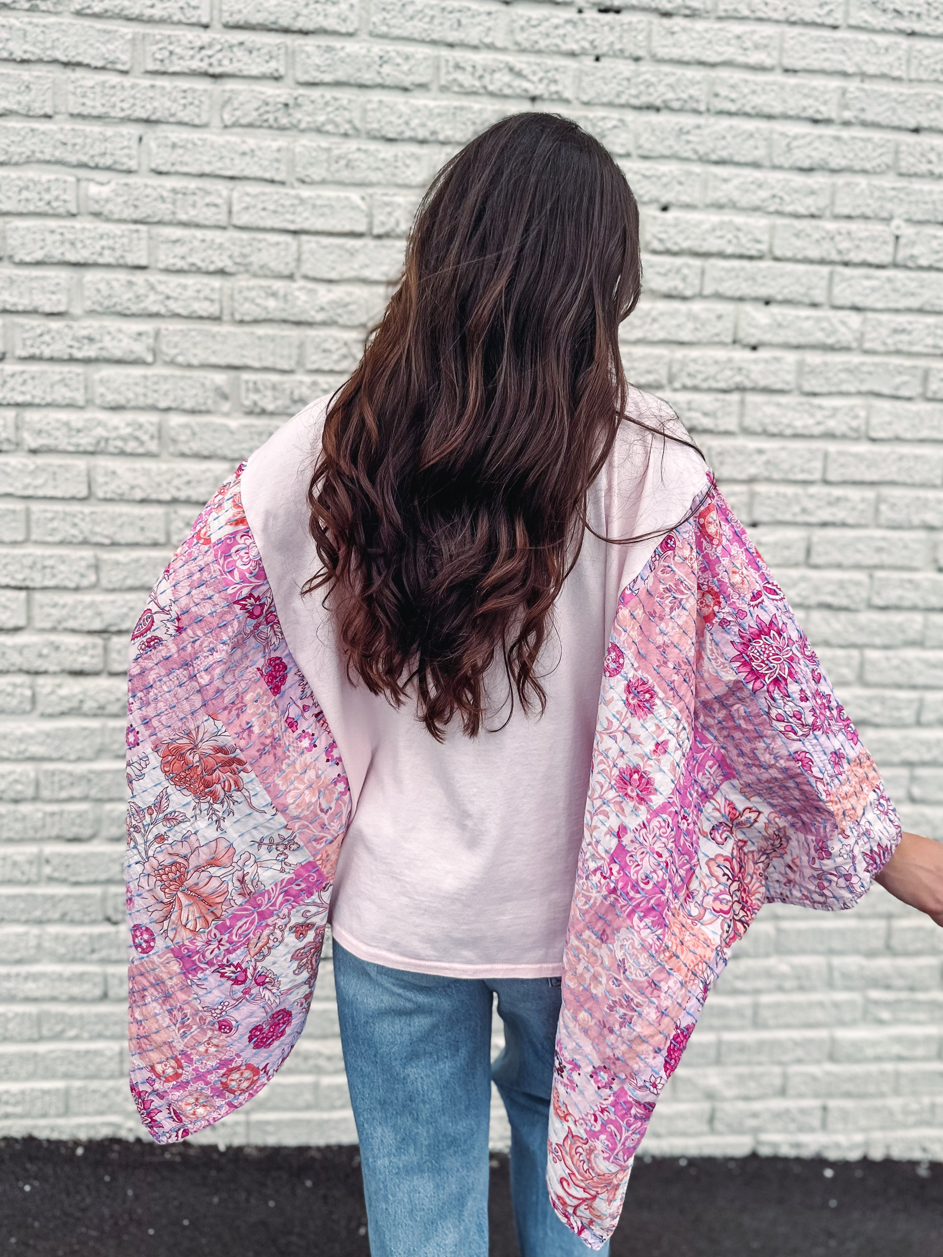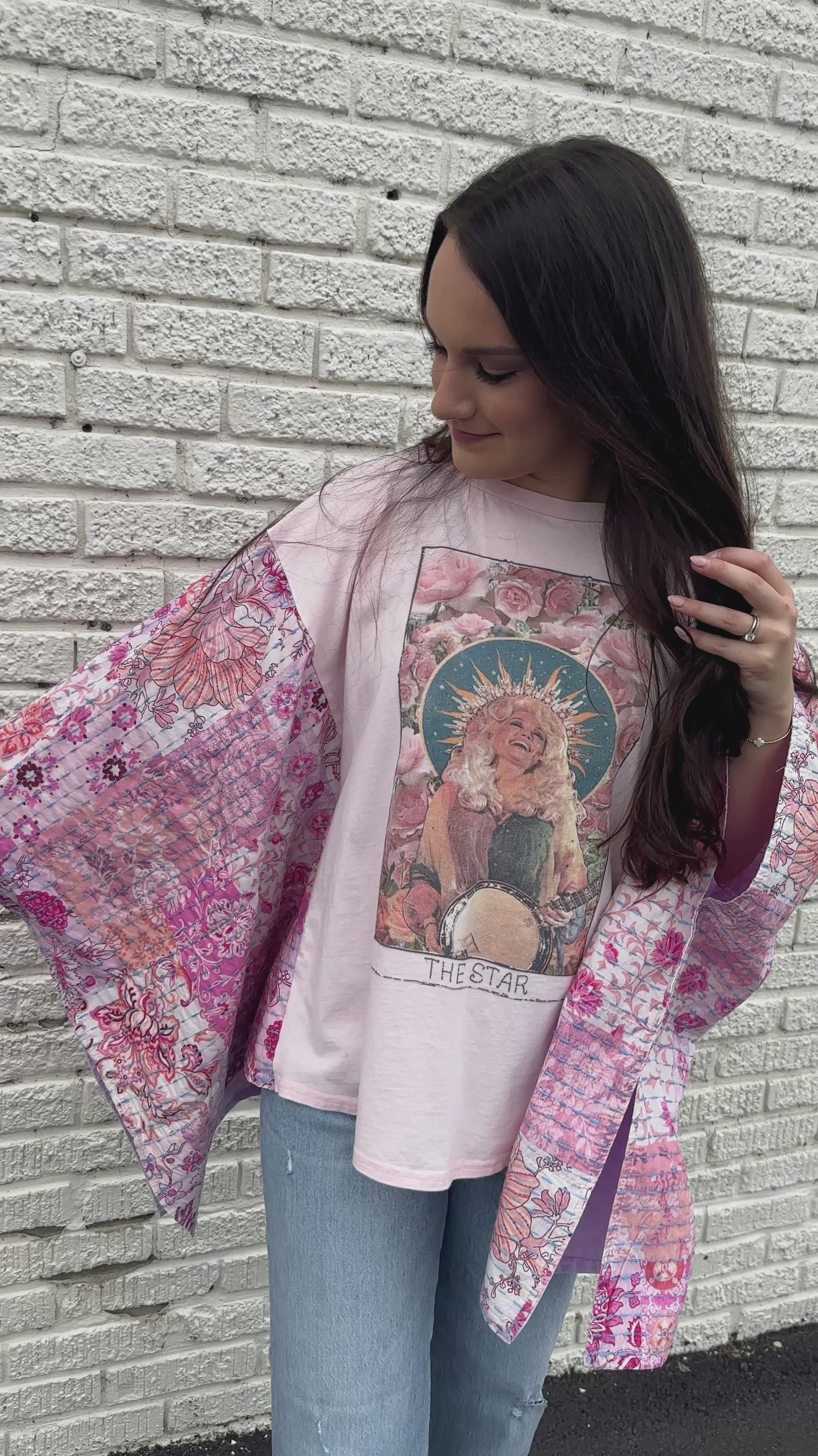 Be the queen of country in our Dolly Mixed Media Poncho Top! Featuring a screen printed tee of the iconic Dolly Parton and colorful floral poncho sleeves, this top is perfect for any music lover. All hail the queen!