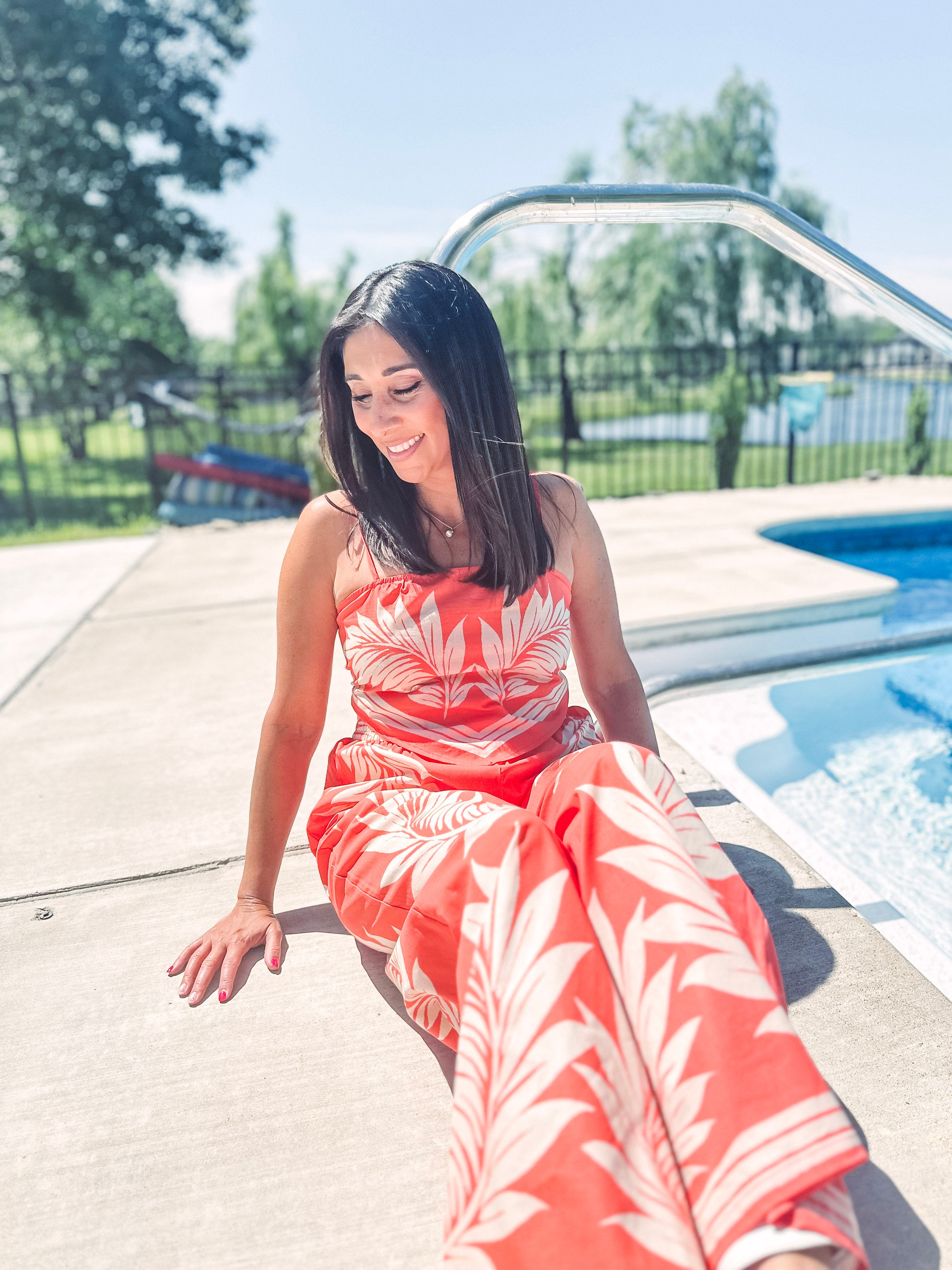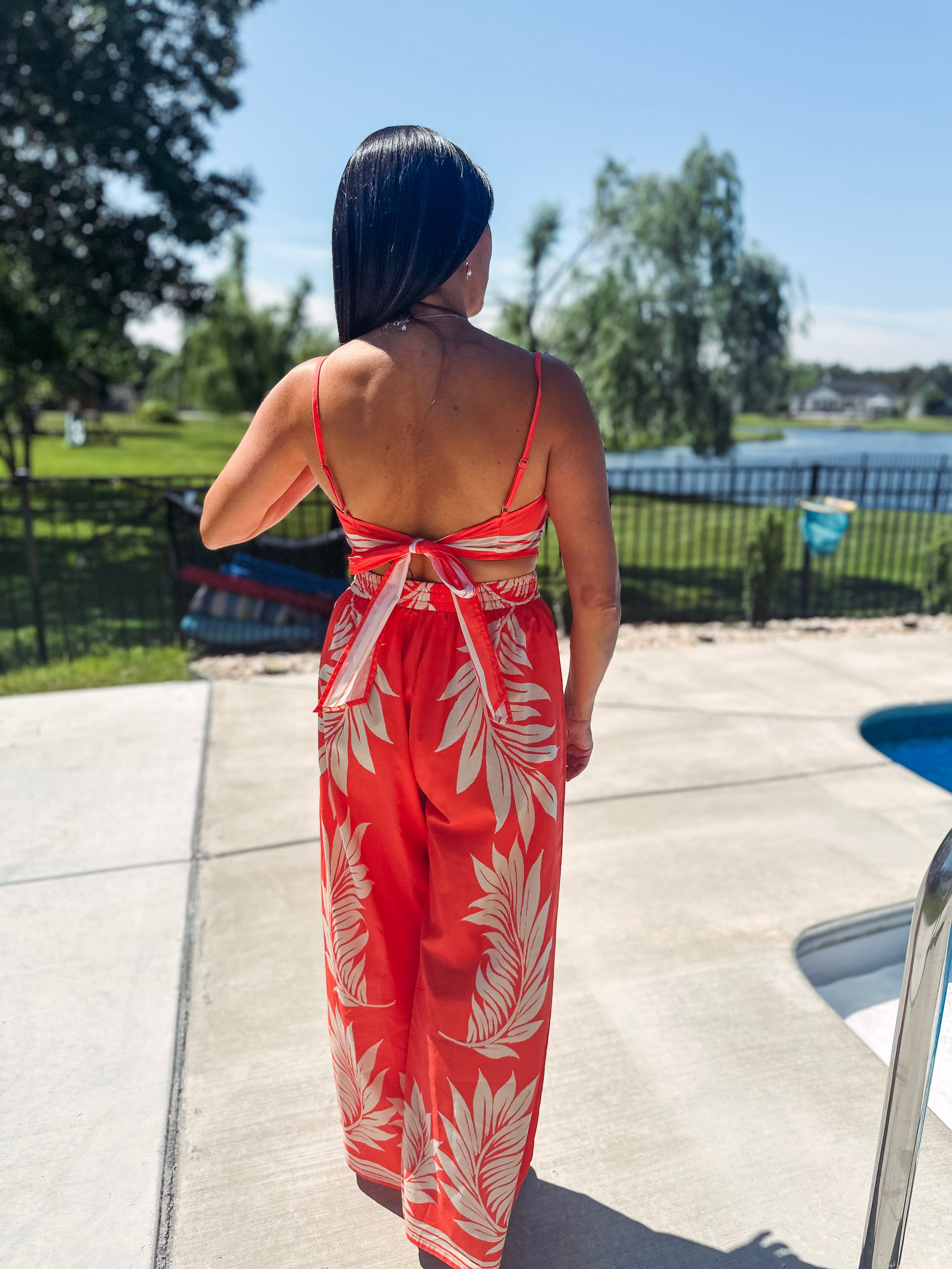 Take your vacay fashion to the next level with our Fiji Orange Scarf Printed Two Piece Set. The vibrant orange color and matching tiny scarf top exude boldness while the wide leg pants provide comfort and style. Perfect for the babe who doesn't take herself too seriously.
