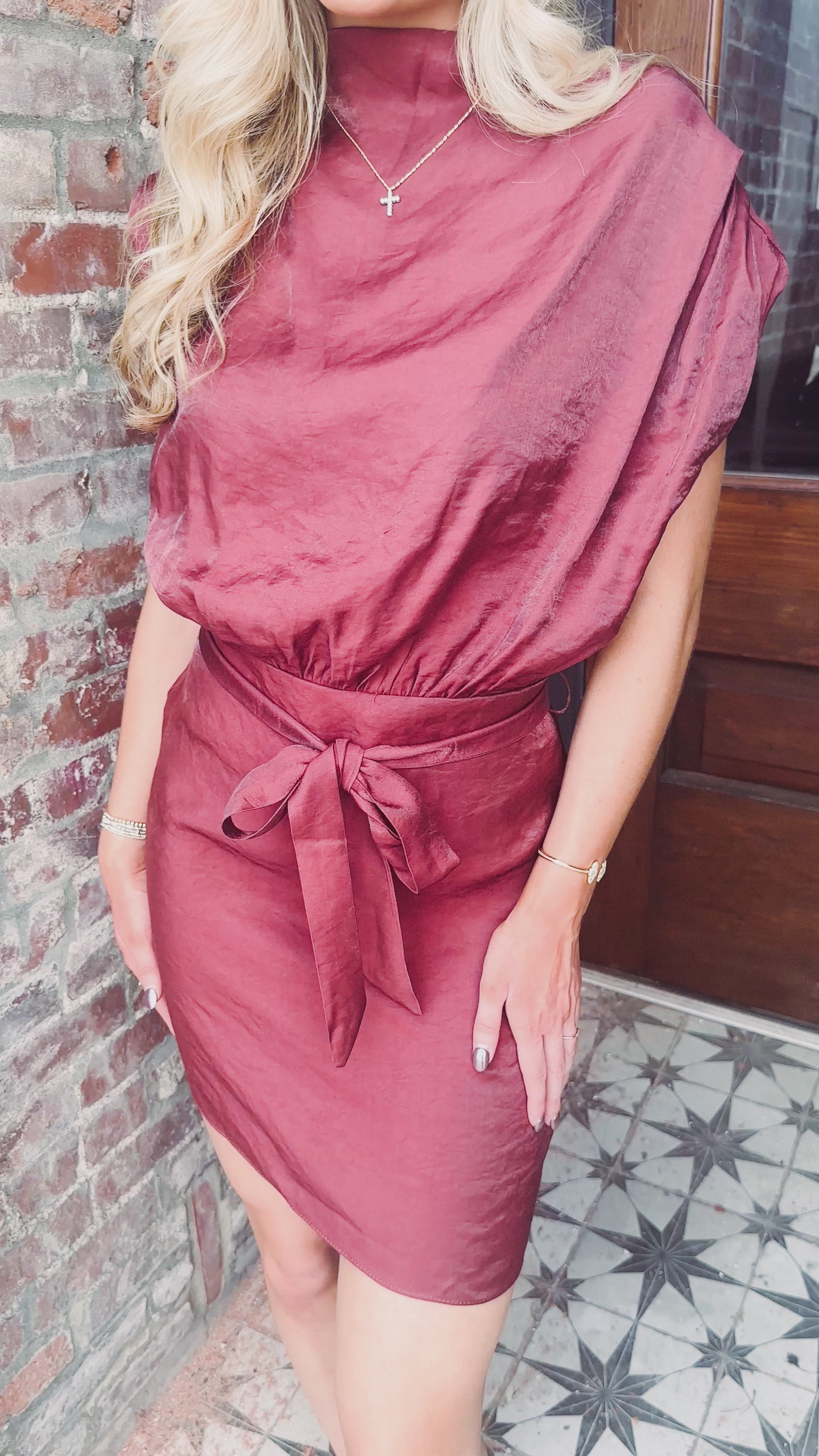 Step into the spotlight with this beautiful rust-colored mini dress, designed to make every festival party unforgettable. Featuring a chic sleeveless mock neck and a tie waist that highlights your silhouette, the satin fabric glows with an elegant sheen. Perfect for those sleepless nights filled with dancing and fun, this dress blends classic style with playful charm.