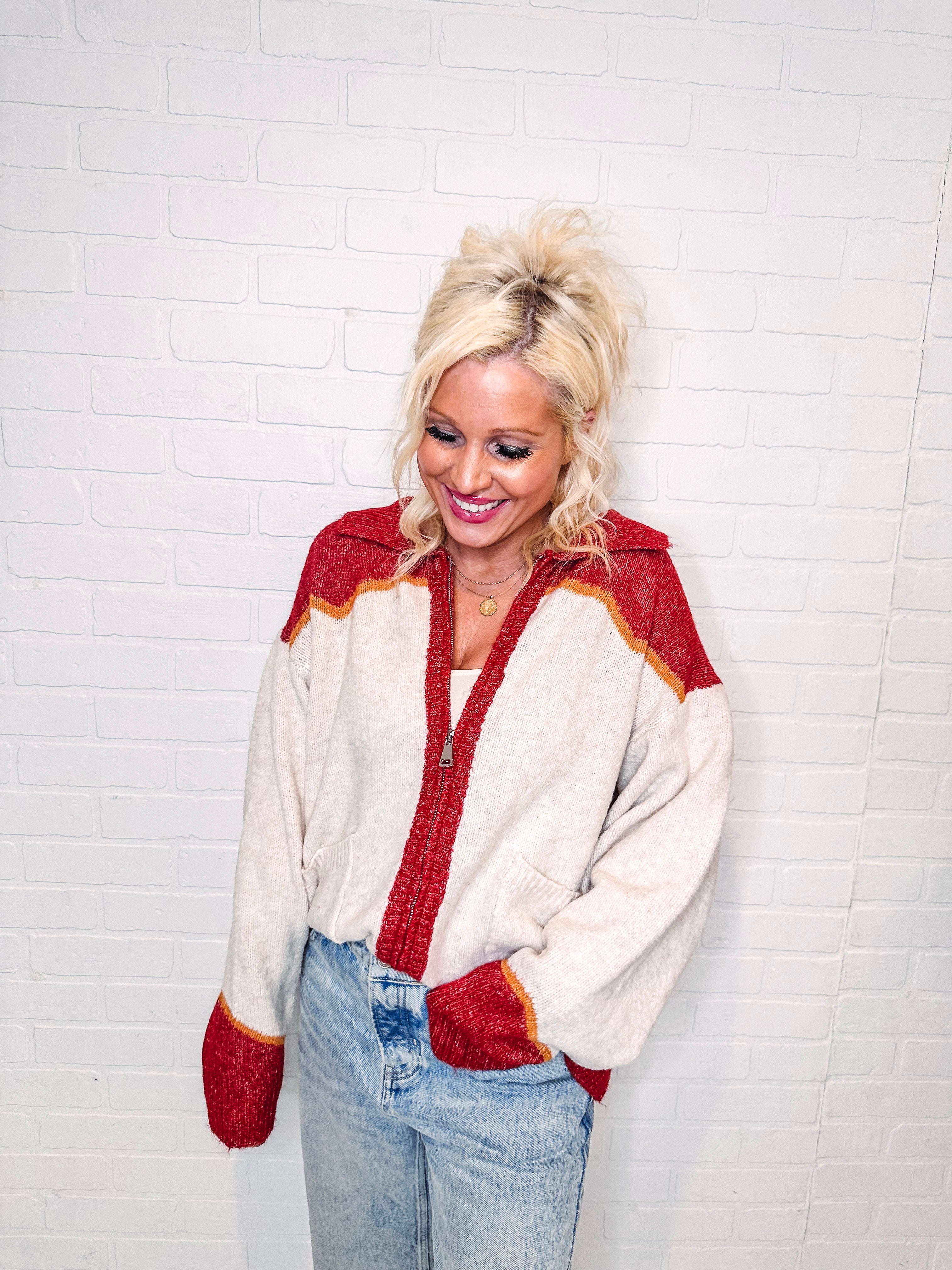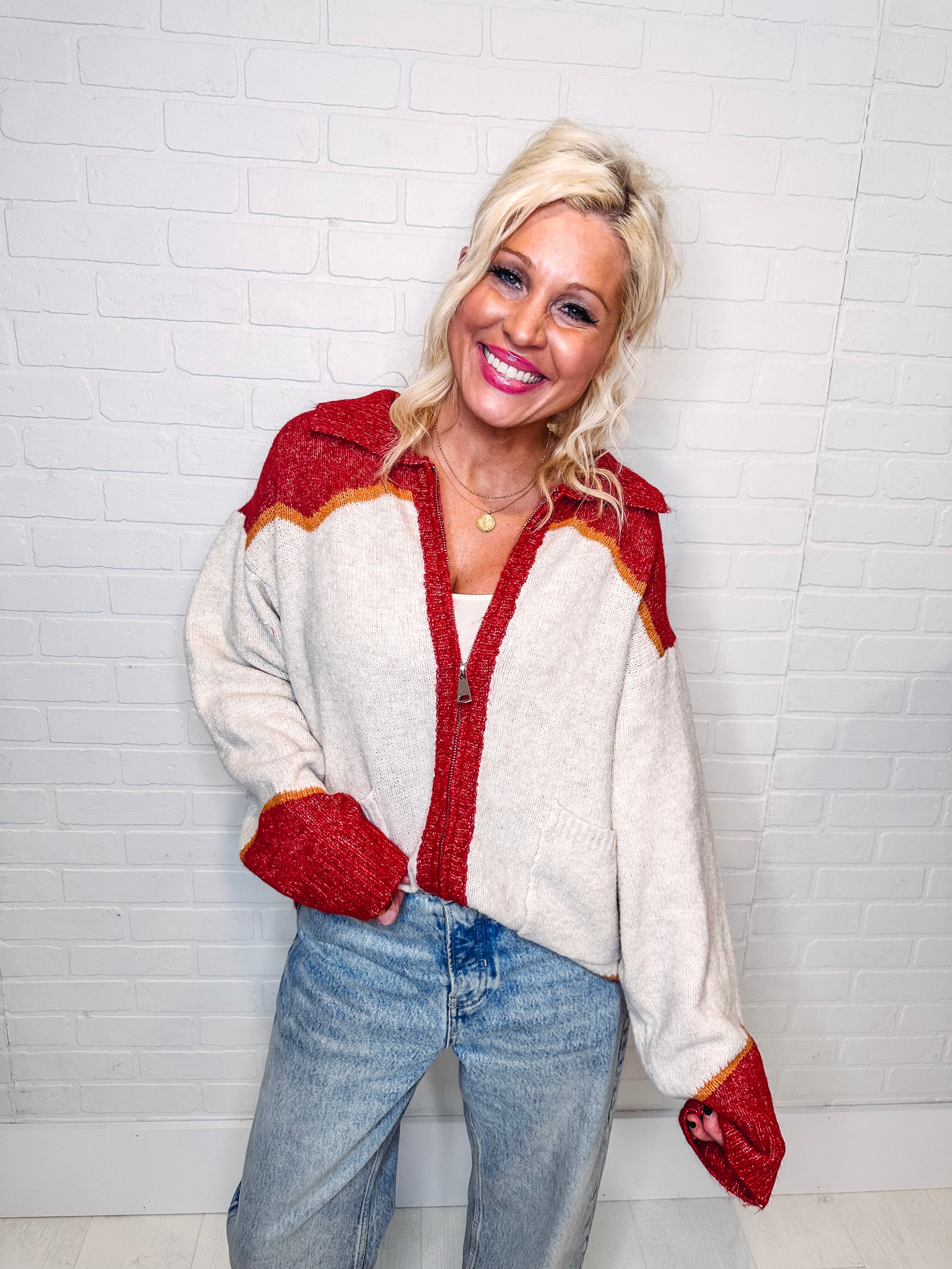 Reel in cozy vibes with this charming oatmeal knit sweater featuring a playful fish motif on the back—perfect for those who appreciate a little aquatic whimsy. The convenient zip-up front makes layering effortless, while festive red accents add a pop of personality to the neutral base. With its relaxed western-inspired silhouette and soft, huggable knit, this sweater is your go-to for casual comfort that doesn't take itself too seriously. Cast your line toward comfort and style.