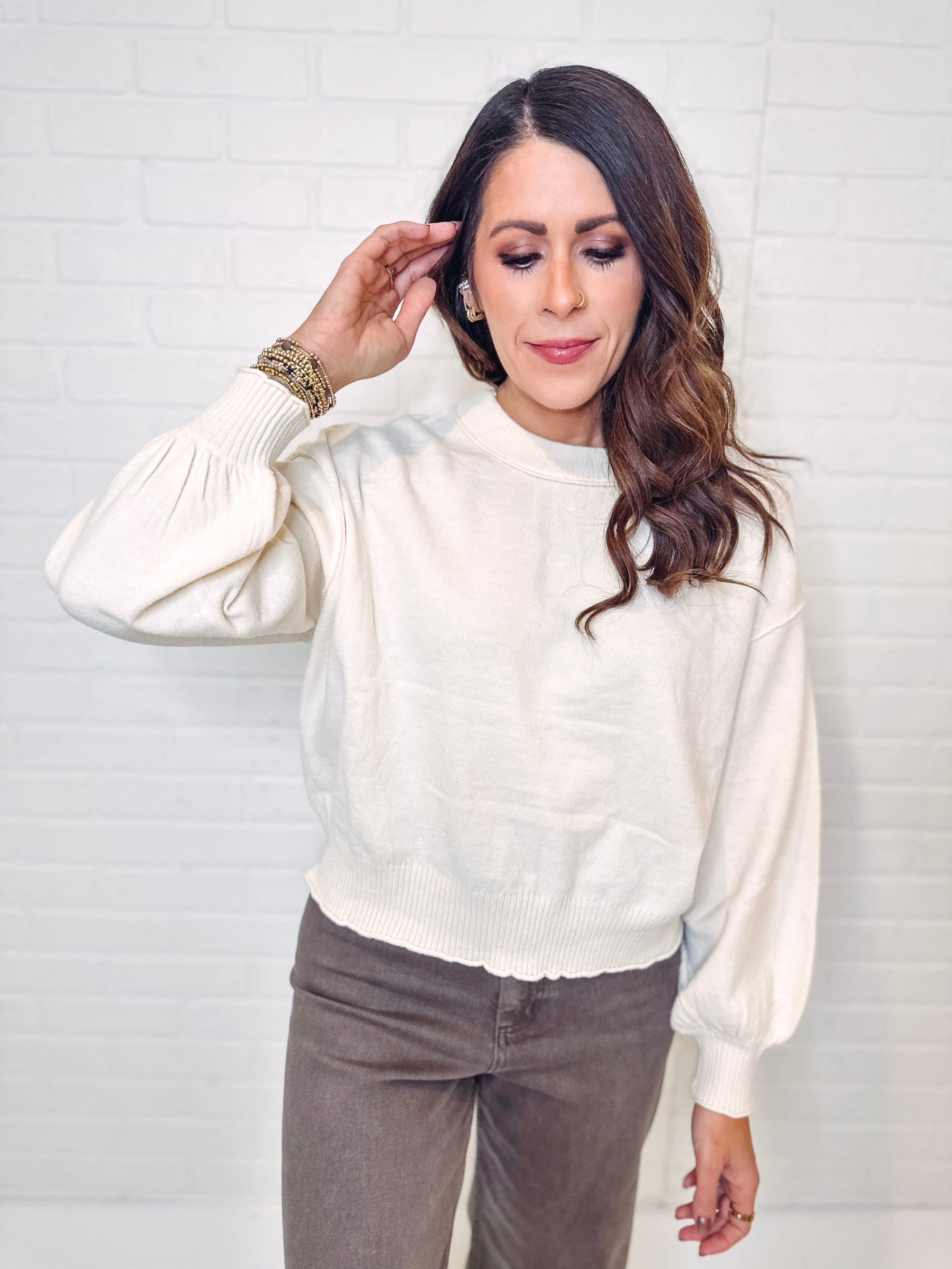 Wrap yourself in comfort with the Christina Plush Sweater, your new favorite piece for those crisp autumn evenings. This cream-colored beauty features charming puff sleeves that taper elegantly at the wrist, paired with a classic round neckline for effortless style. Perfect for layering or wearing solo, it's the cozy companion you've been craving all season long.