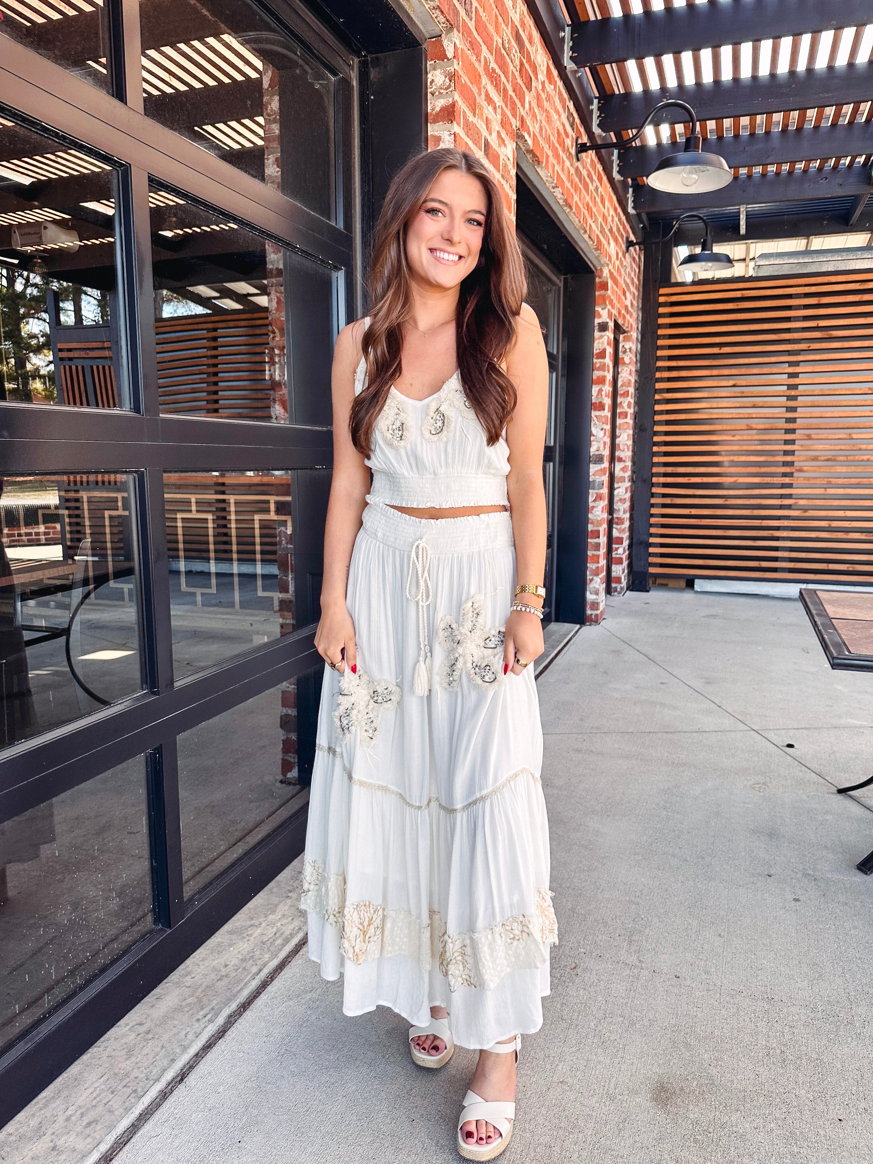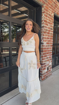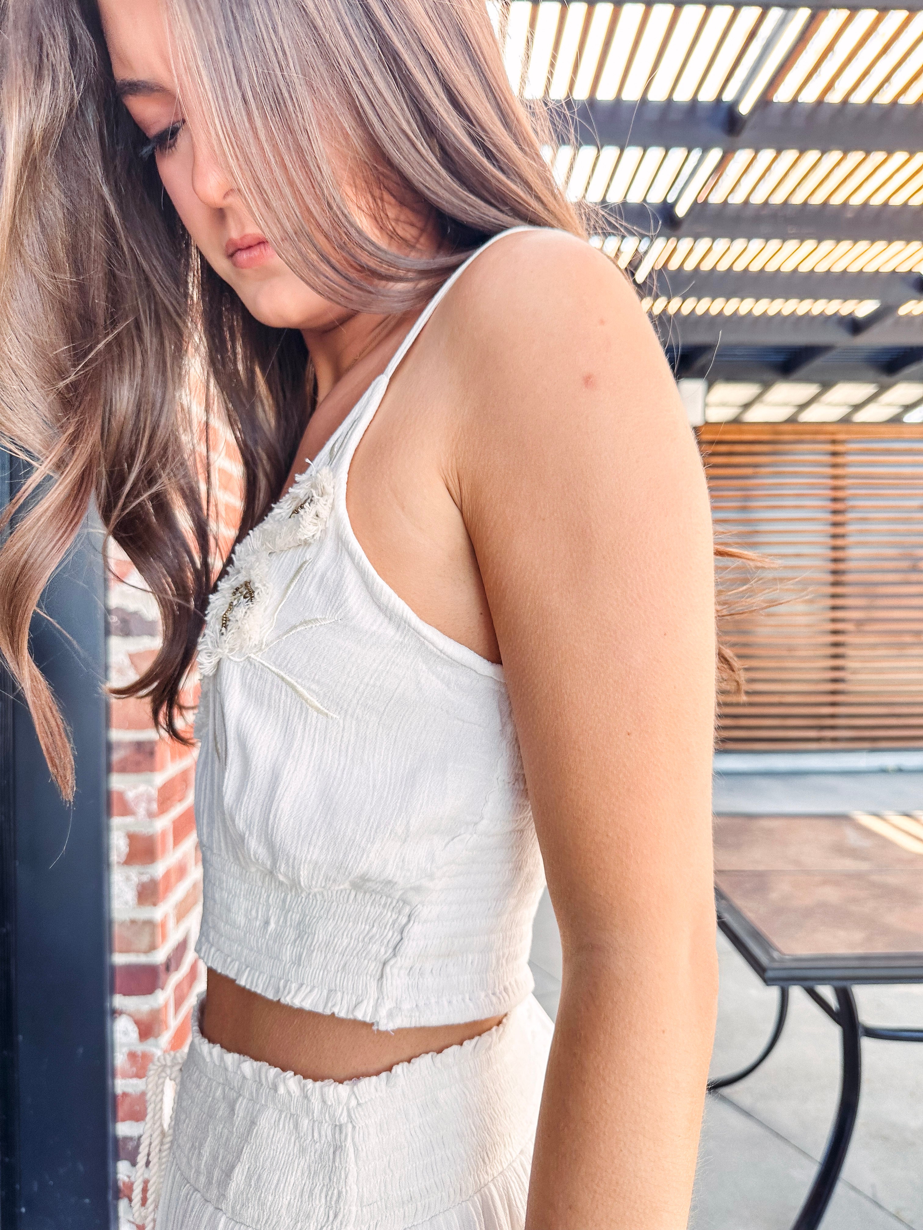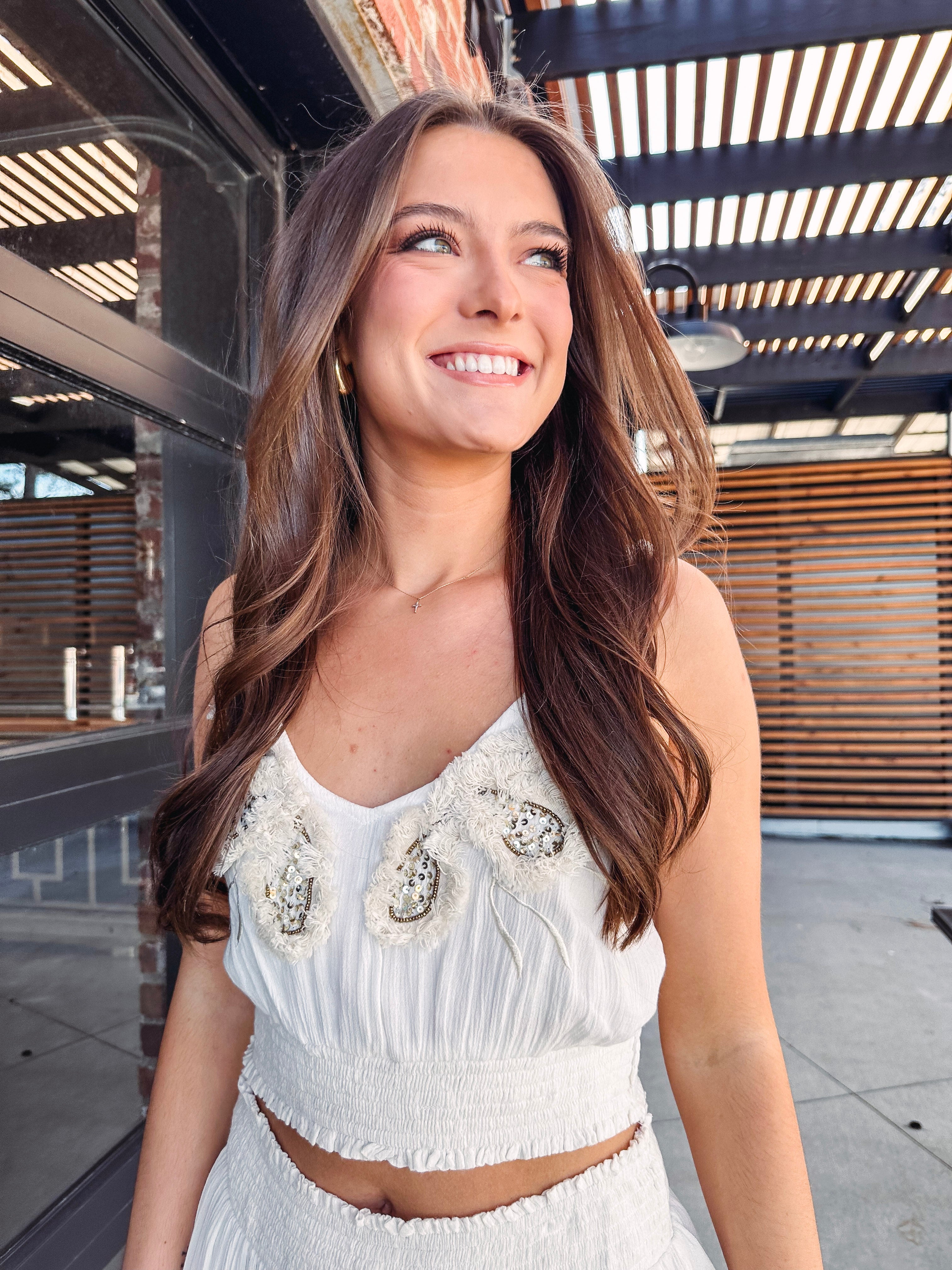 Meet your new go-to for effortless style! This cropped top features delicate spaghetti straps and a flattering V-neckline that works for any occasion. The adjustable straps let you customize the fit perfectly, while intricate embroidery and playful fringe details add personality and movement. Whether you're dressing it up or keeping it casual, this piece brings just the right amount of flair to your wardrobe.