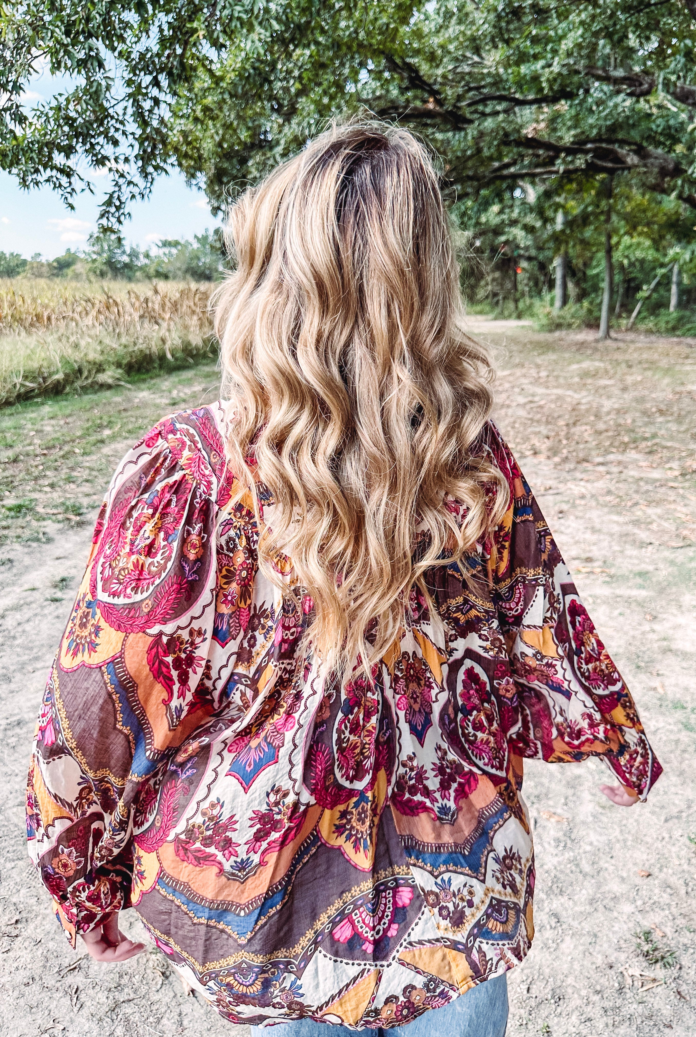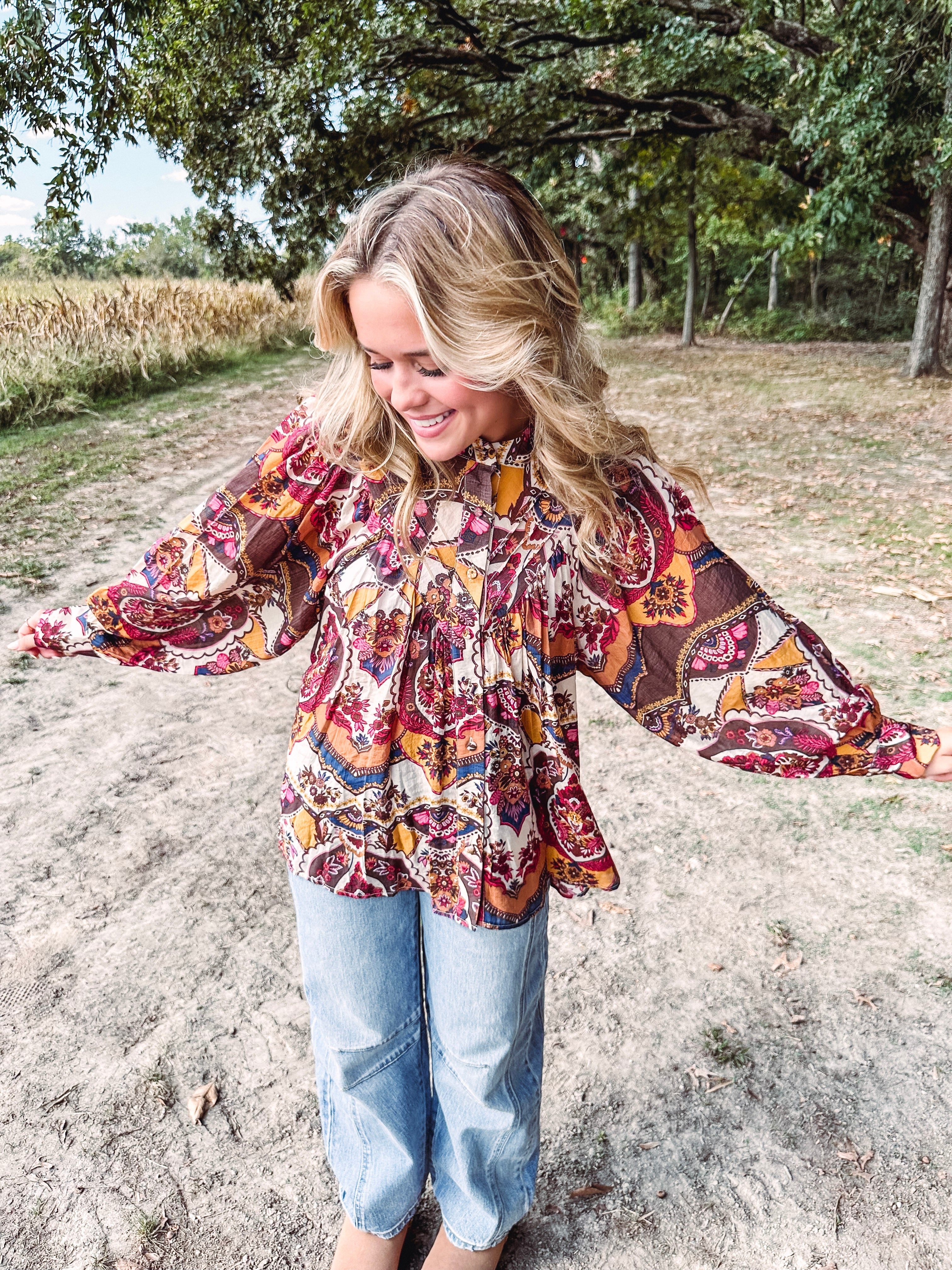 Add a pop of color and pattern to your wardrobe with this Ruby & Amber long sleeve button down top. Light and breezy, it features vibrant floral and paisley prints in rust, espresso, pink, navy, and mustard. Pleated yoke details, flowing sleeves with wide cuffs, and fabric-covered buttons add charming touches. Perfect for pairing with jeans and booties for a casual look or dressing up with slacks or a skirt to let the lively patterns shine. This top brings playful style wherever you go!