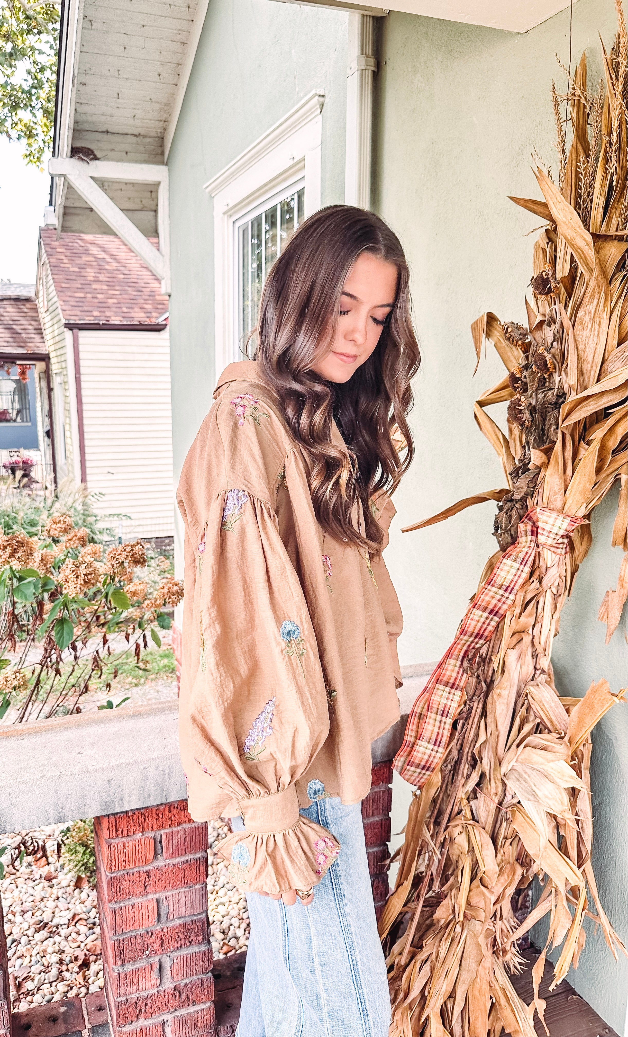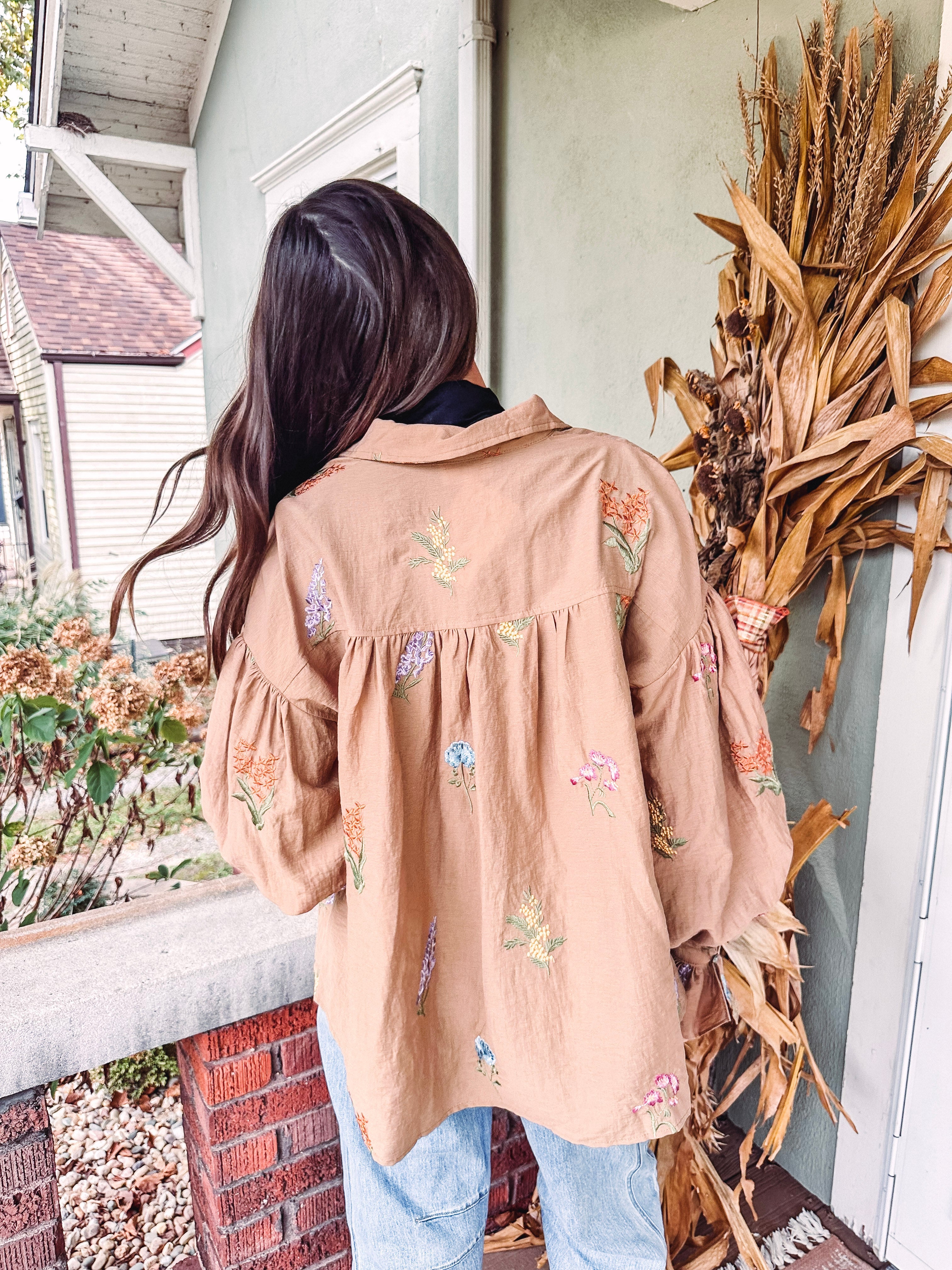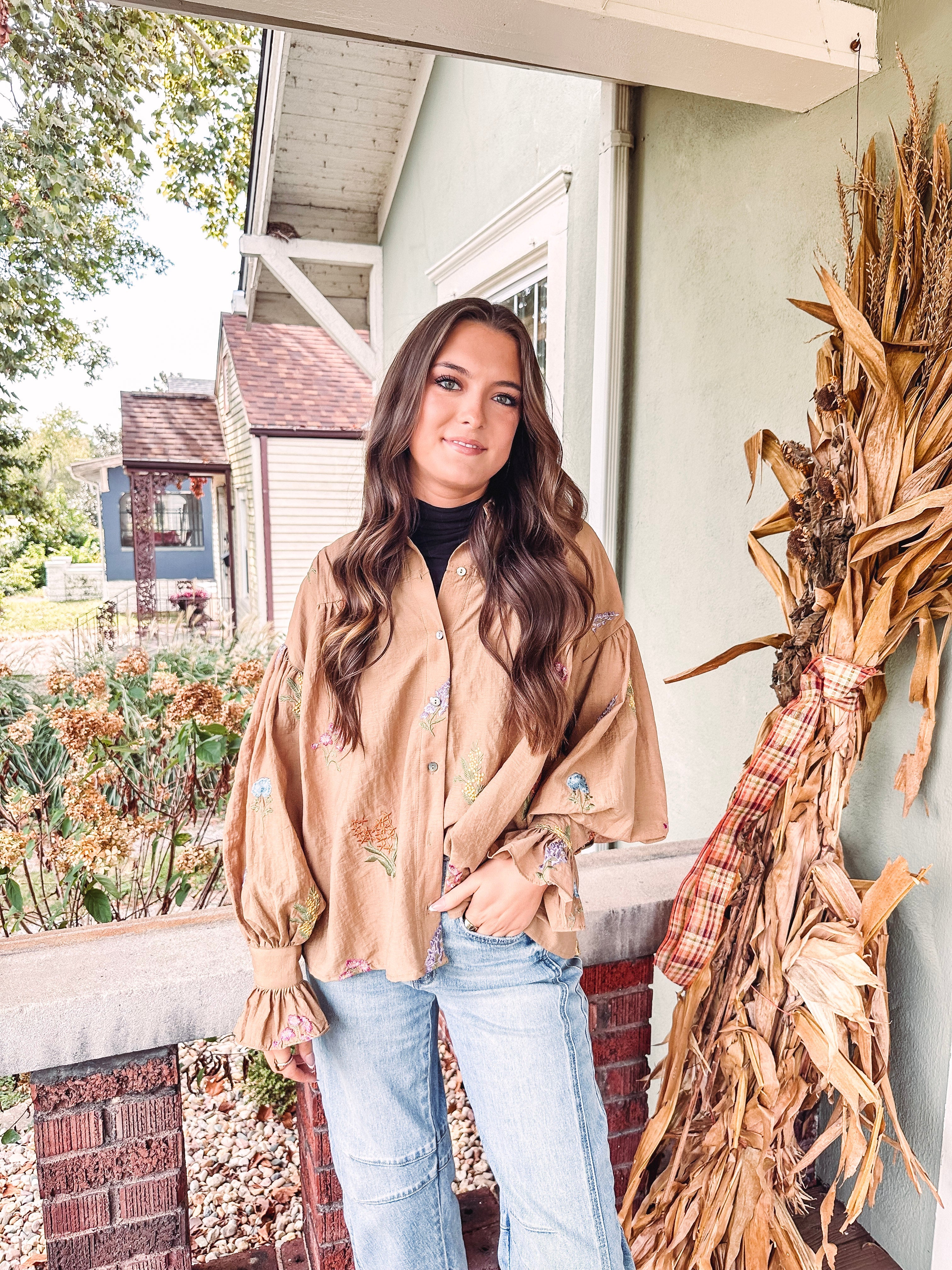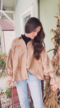 Celebrate the holiday season in style with this playful Scarlet Balloon Sleeve Shirt. Featuring a warm camel color and a charming textured floral print, its boxy fit offers comfort and flair. The fun balloon sleeves add a whimsical touch, making this top perfect for festive gatherings or casual days when you want to stand out.