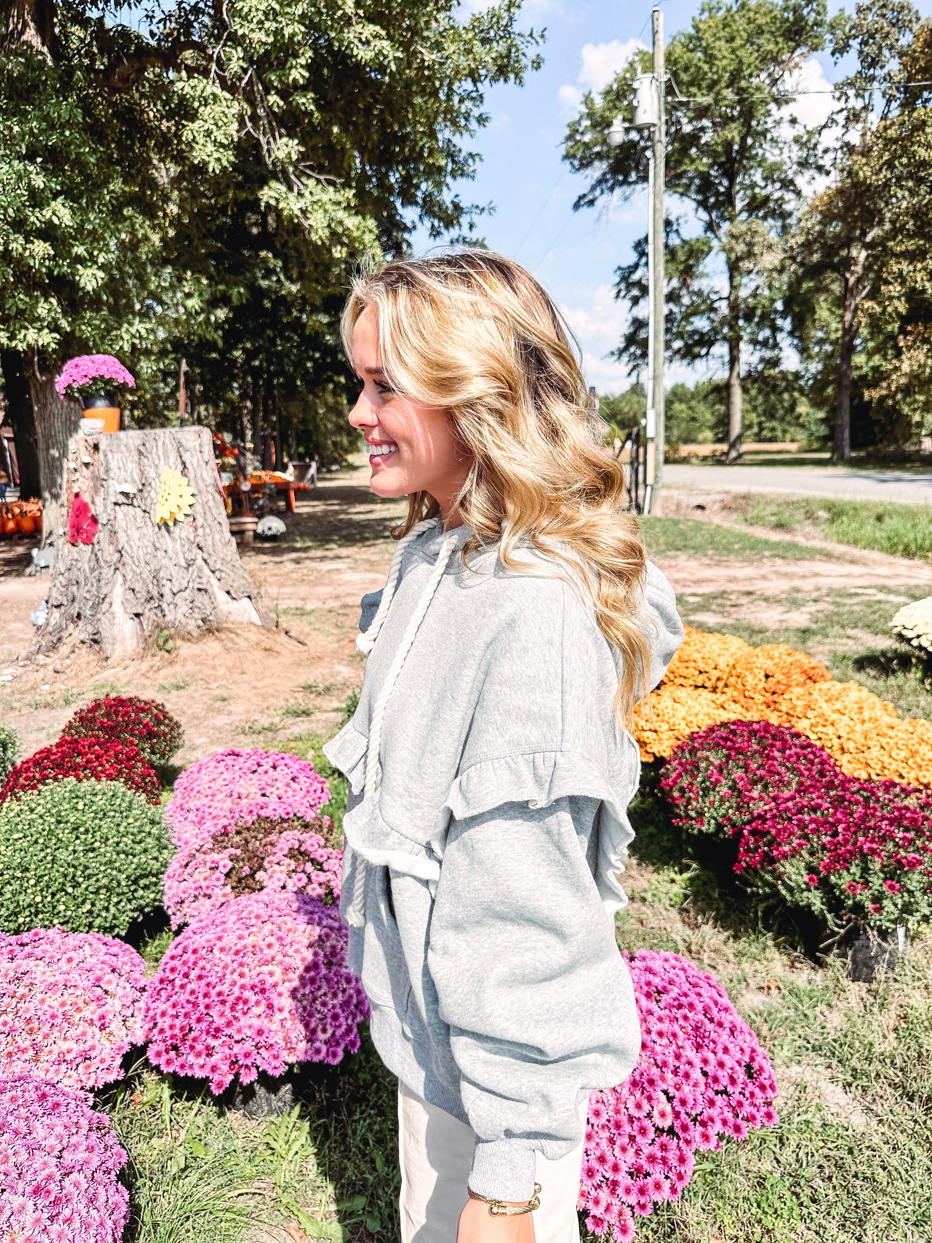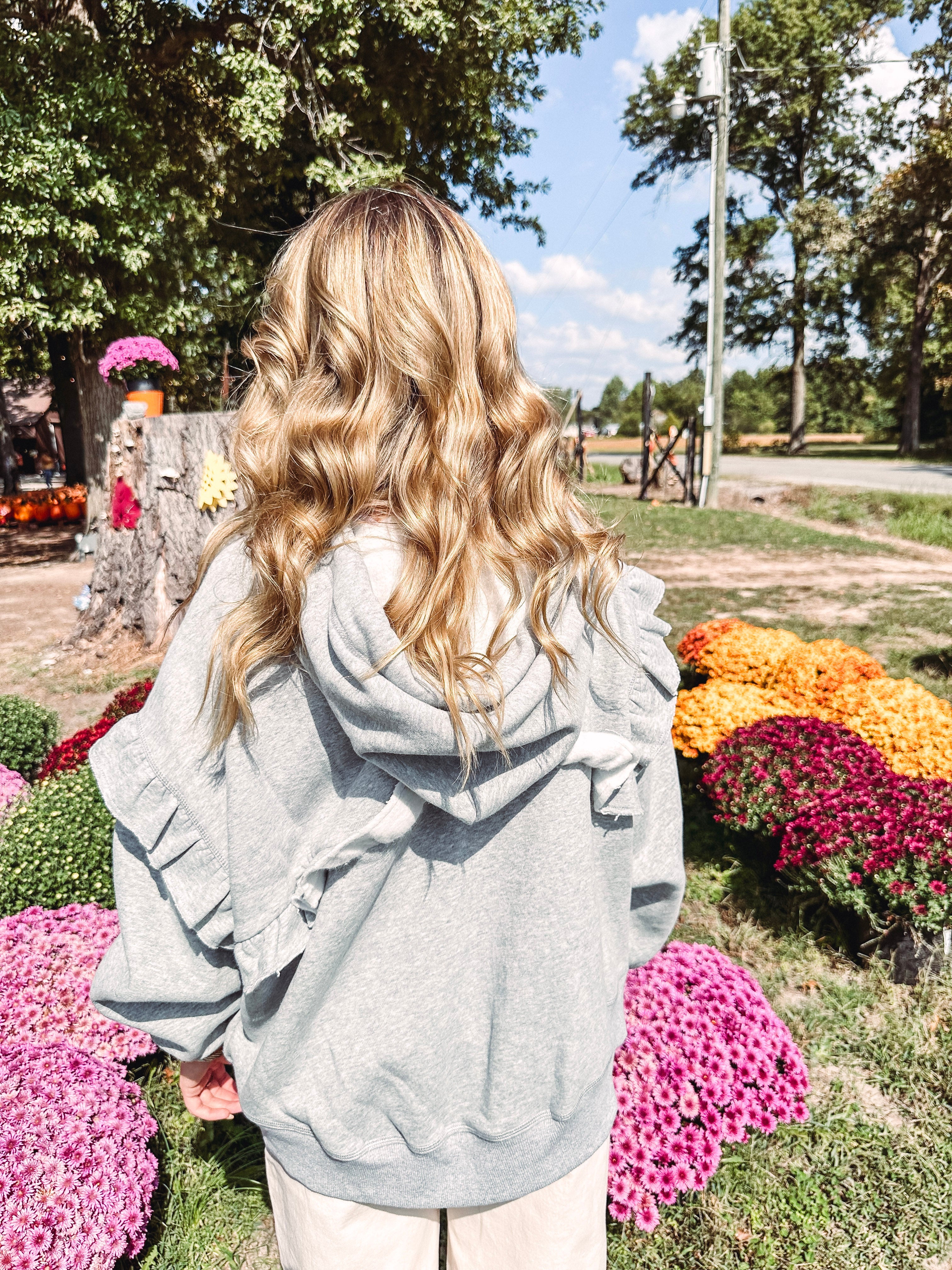 Cozy up in the Shea Ruffled Sweat Shirt, featuring playful ruffle details on the chest and arms for a flirty touch. The grey heather fabric and hooded design make it perfect for a relaxed Sunday afternoon. Mid-length and comfy, it’s your go-to for effortless style and comfort.